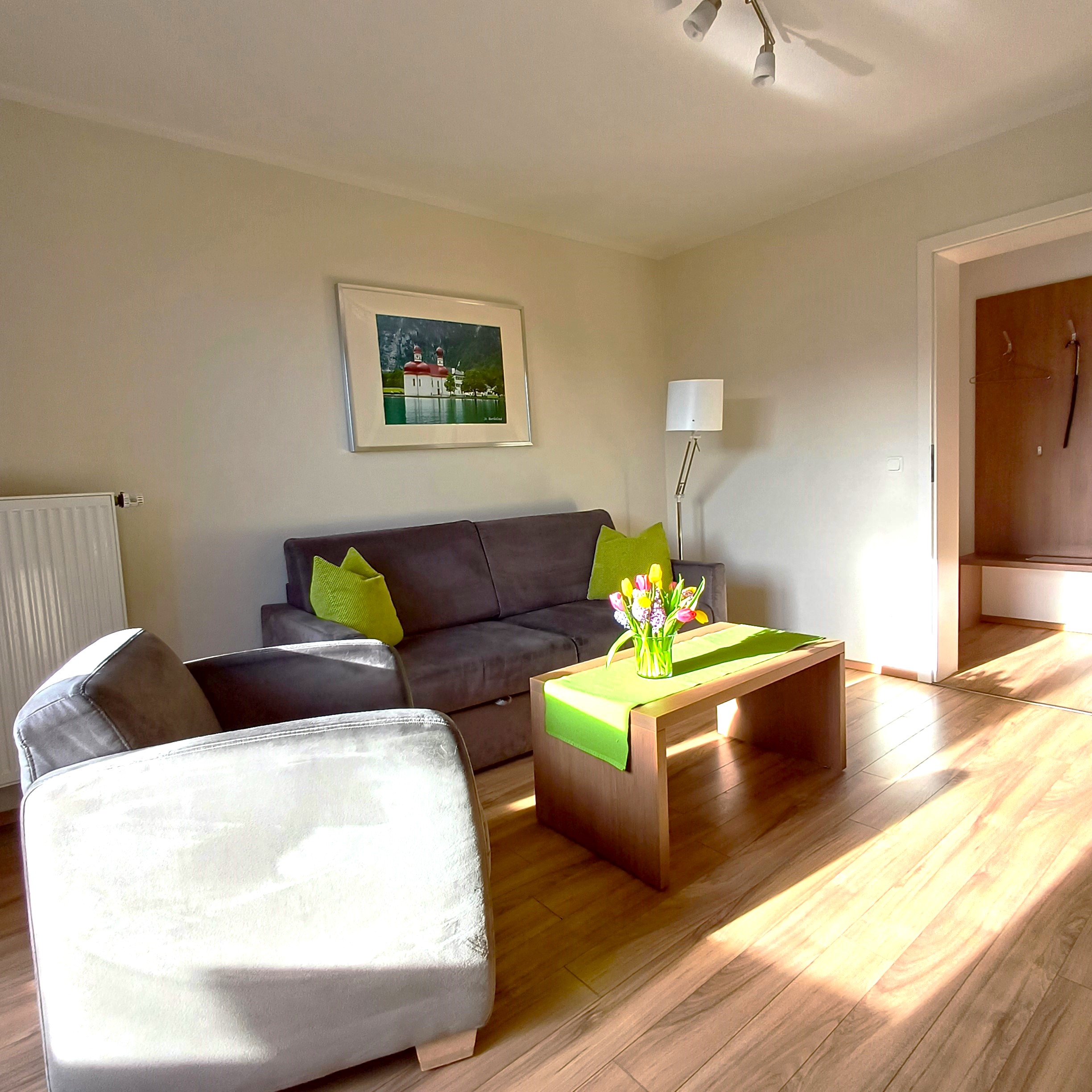 Unsere großzügige Ferienwohnung Untersberg verfügt 58 qm, 2 Schlafzimmer, Wohnzimmer, Küche, Bad mit WC, Sat-TV, Internetanschluss und vieles mehr. Für den 5. und 6. Gast steht auf Anfrage ein bequemes SCHLAFSOFA IM WOHNZIMMER bereit, welches gegen einen kleinen Aufpreis hergerichtet werden kann. Auf dem möblierten Balkon können Sie sich vom Alltag erholen und den Panoramablick in die Salzburger und Berchtesgadener Berge genießen. Gerne können Sie den Garten nutzen - Liegestühle und Grillmöglichkeit stehen bereit. Kostenloses WLAN und gratis Parkplätze vorhanden.