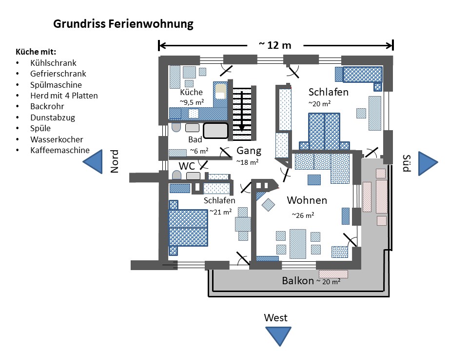 •Gemütliche Ferienwohnung mit ca. 98 qm, keine Dachschrägen, Holzböden aus Eiche, Fenster zum Öffnen, Balkon mit Sitzmöbel