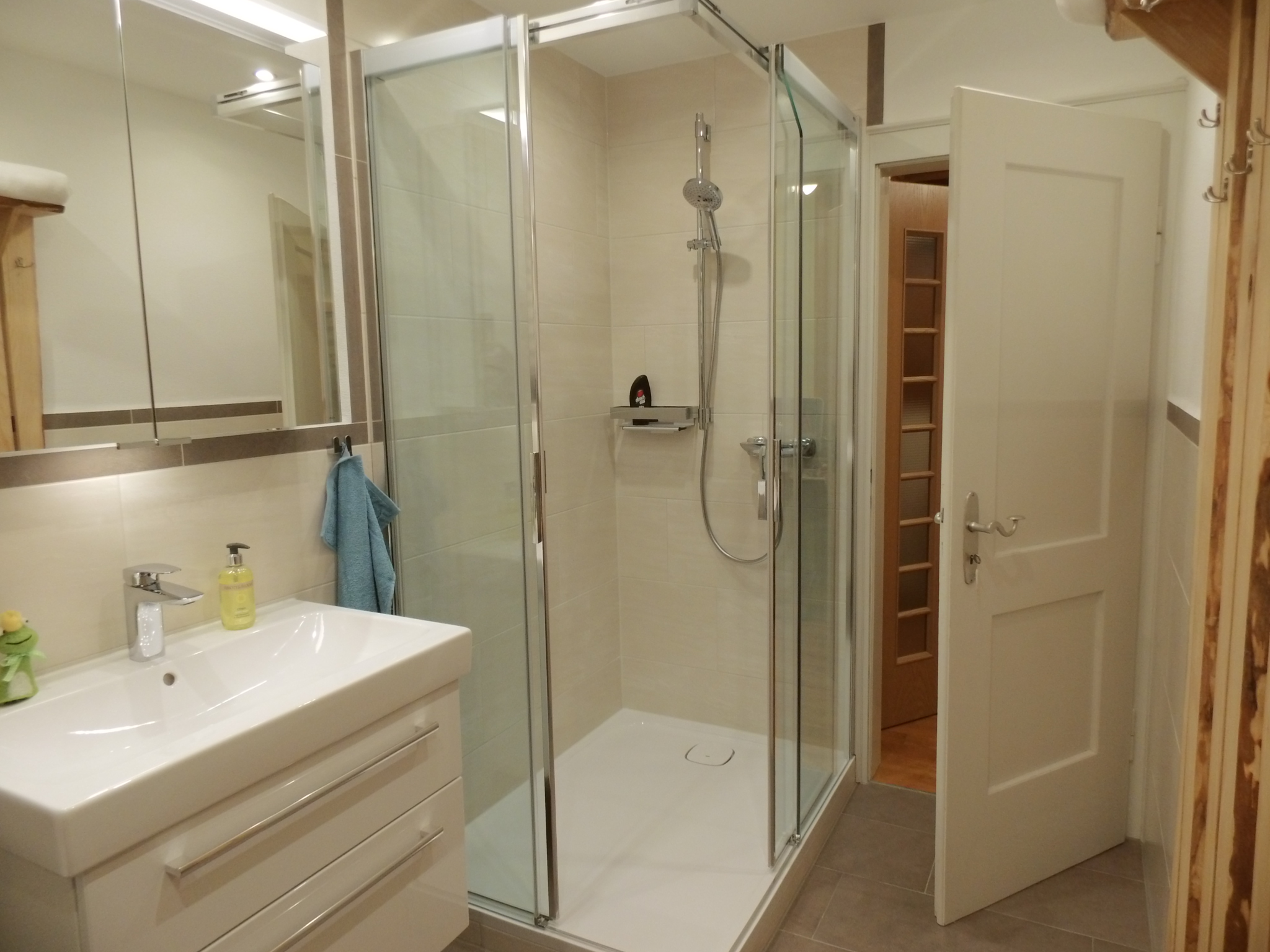 •Bad mit großzügiger Dusche, Waschtisch und WC. Schminktisch in Naturholz, zusätzliche Spiegel und Fön ergänzen die Ausstattung.