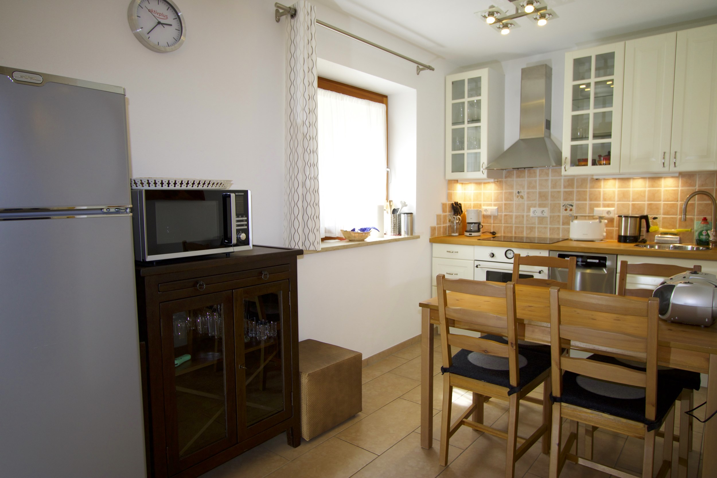 Allergikerwohnung, Wohn/Schlafraum getrennt, 1 separates Schlafzimmer, Doppelbett, Bandscheibenmatratzen, Bettwäsche, Dusche/WC, Handtücher, Bademantel, Toilettenartikel, Fön, Wohnküche, Herd 4-Platten, Backofen, Mikrowelle, Kühlschrank, Tiefkühlfach, Geschirrspüler, Essecke, Minibar, Fußbodenheizung, Internetanschluss, WLAN, Kabel- / Sat-TV im Wohnraum und Schlafzimmer, Nichtraucher, Rollstuhlgerecht, Sitzecke, Sitzgruppe ausziehbar / Schlafsofa, Stereoanlage, Wecker, DVD-Player, Videorecorder, Telefon, Zimmersafe, Radio, Erdgeschoss, bedingt behindertengerecht, Liegewiese, Terrasse, Gartenmöbel, Grillmöglichkeit, Sauna im Garten,