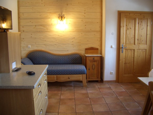 Die Ferienwohnung Salzburg liegt im Erdgeschoss, mit einem geräumigen Wohnraum und separatem Schlafzimmer.