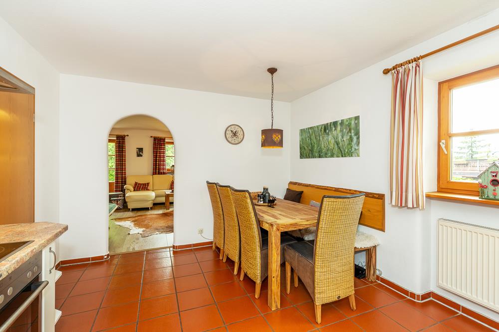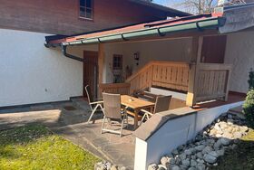 Genießen Sie die Sonne auf dem romantischen Freisitz auf der Terrasse. Hier gibt es hochwertige Außenmöbel (Esstisch und Stühle), zum Beispiel für eine urige, bayerische Brotzeit an der frischen Luft.