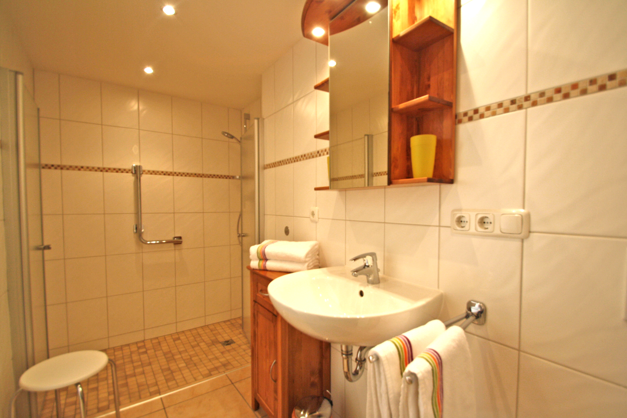 Die Rollstuhlgerechte barrierefreie 65 qm Ferienwohnung Spitzstein mit eigenem Eingang und großer Terrasse lädt zum Entspannen ein. Wohnen Sie in einer großzügigen und hellen Wohnung mit zwei separaten Schlafzimmern, einmal mit Doppelbett und einmal mit zwei Einzelbetten. Die gemütliche Wohnküche mit volleingerichteter Küchenzeile, Essplatz mit Eckbank, ausziehbarer Schlafcouch, Flat-SAT-TV, kostenloses WLAN bietet Ihnen alles zur entspannten Erholung und lässt keine Wünsche offen. Fußbodenheizung und Schwedenofen bereichern die Wohnung. Das große Badezimmer mit ebenerdiger, barrierefreier Dusche ist für Rollstuhlfahrer mit allen Halterungen ausgestattet. Erholen Sie sich bei uns in der Ferienwohnung im Bergerhof. Hunde und Haustiere dürfen nicht mitgebracht werden.