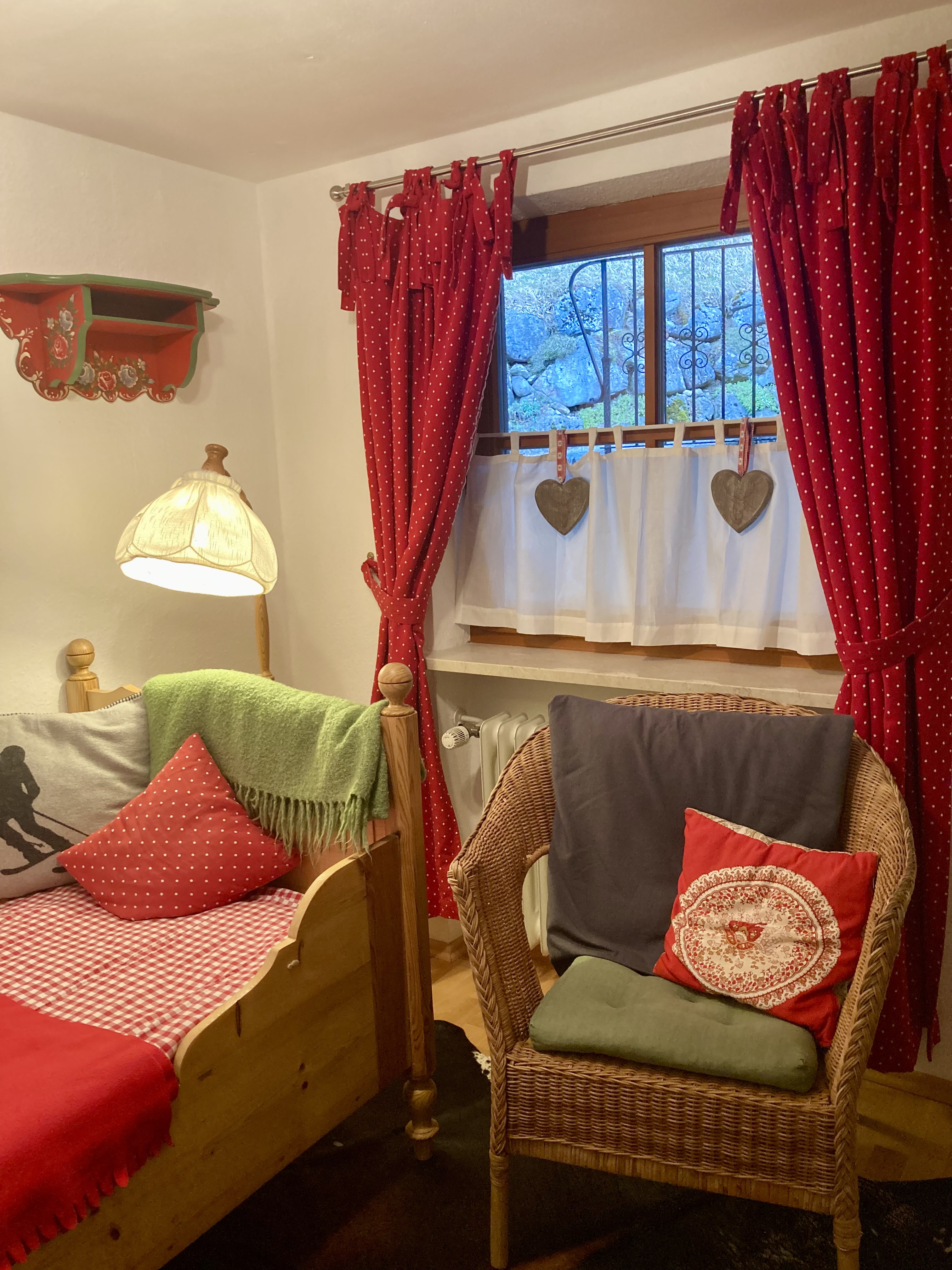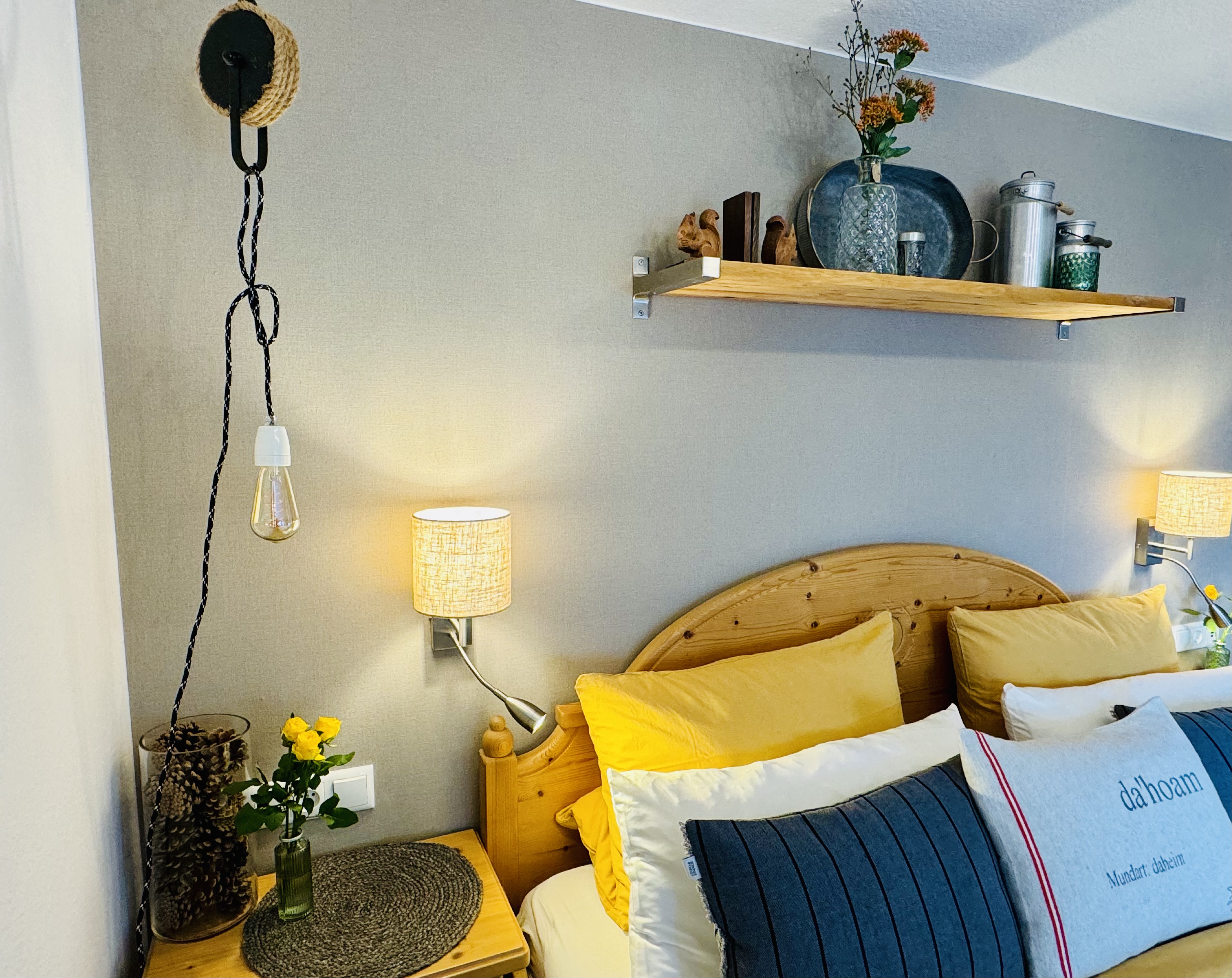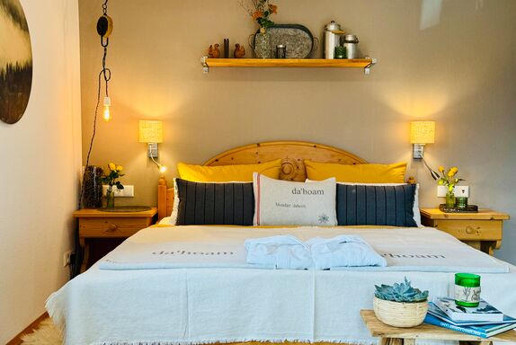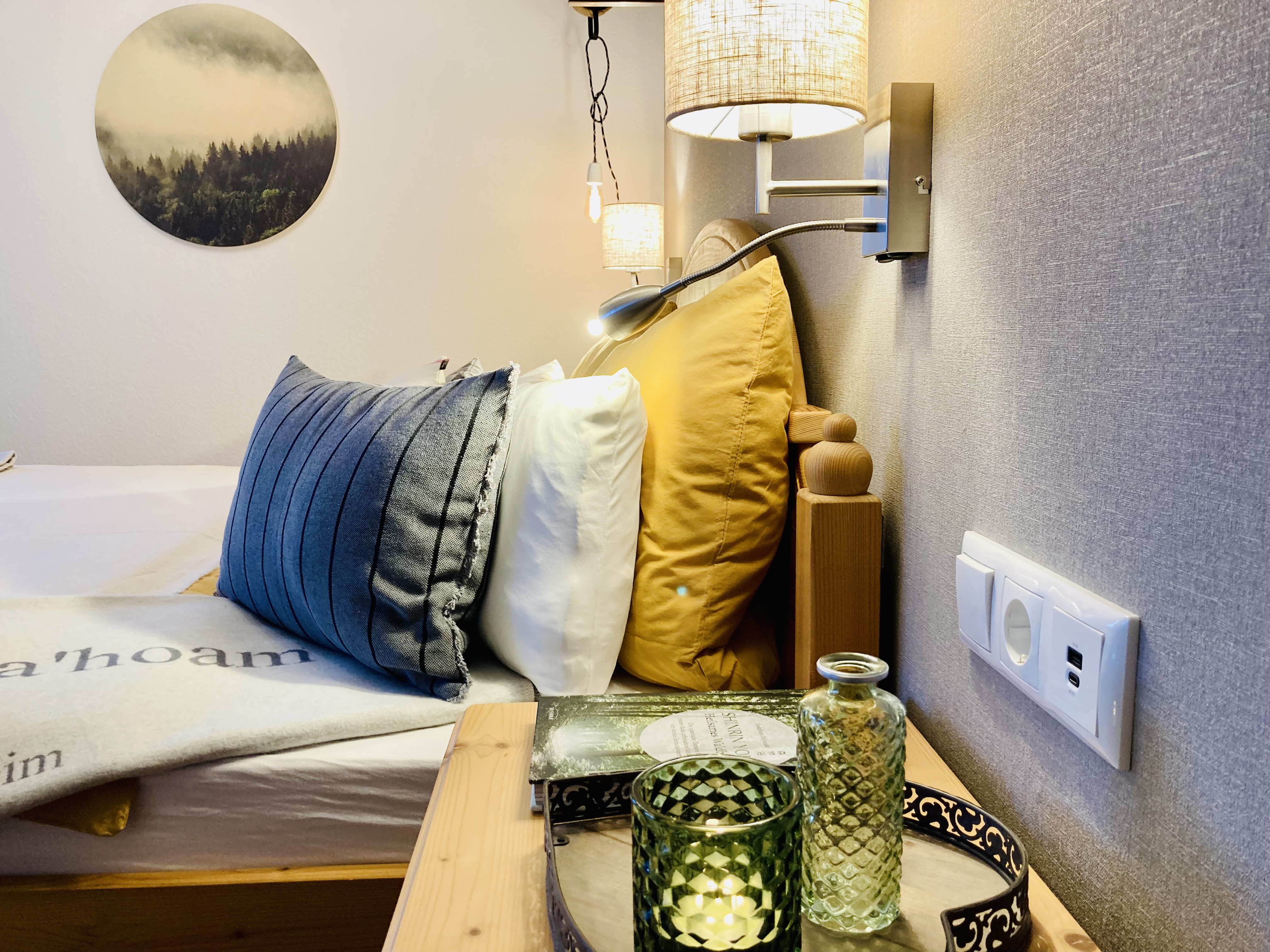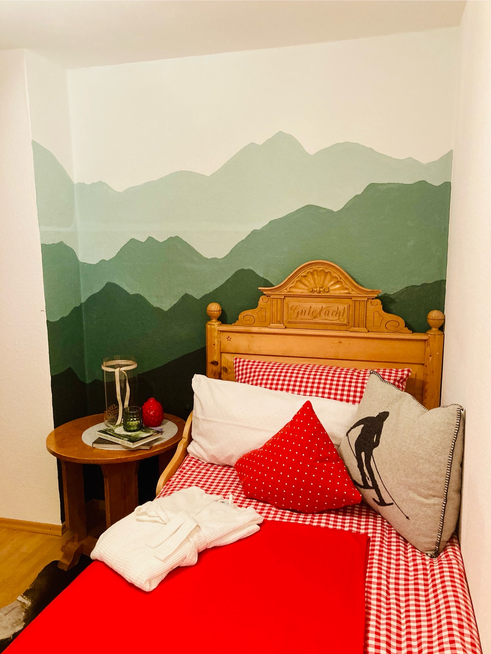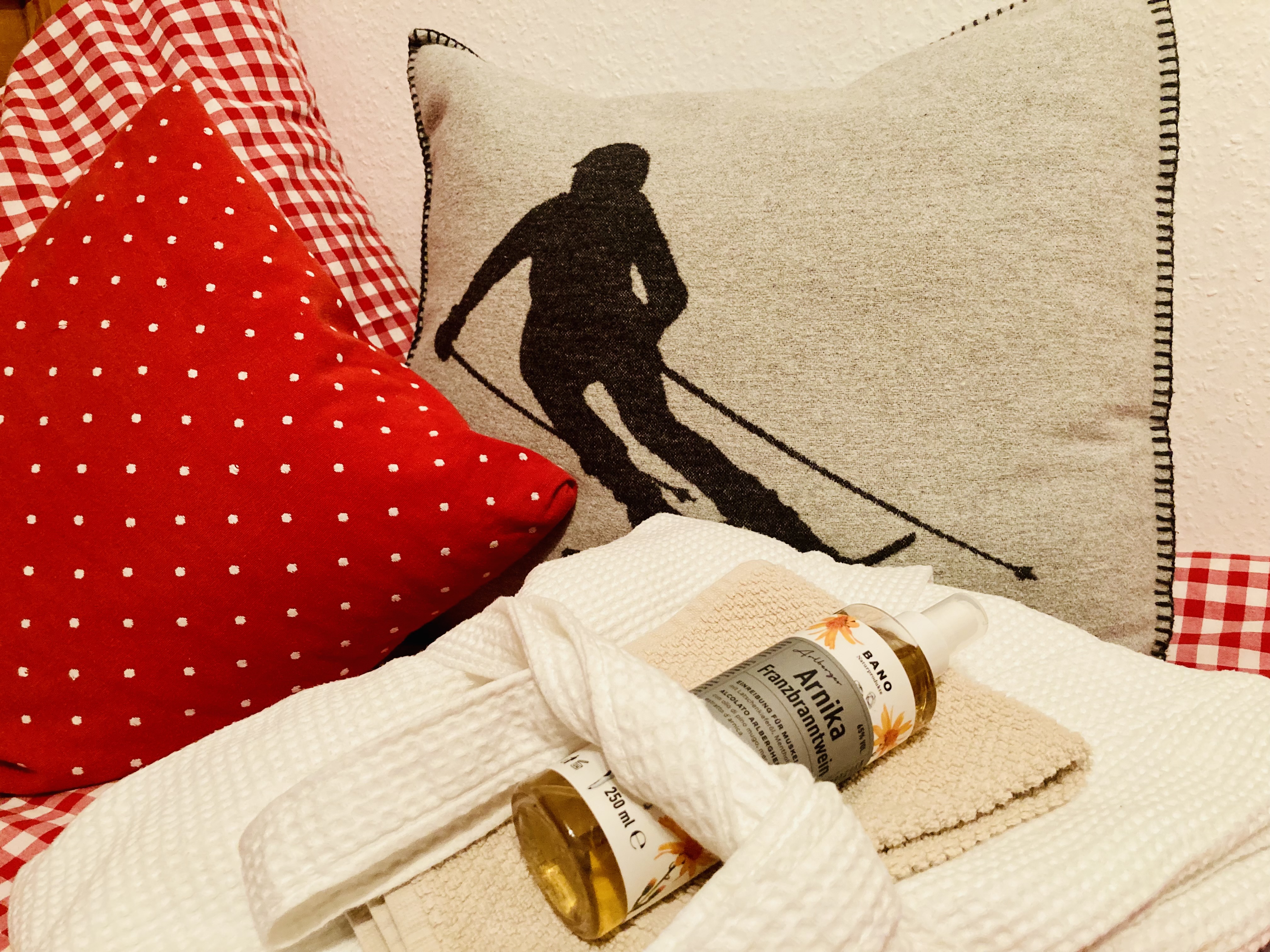 Unser spezieller Freiraum mit altem Holzbett, gemütlichen Kissen und Schaffell ist für Ihre Entspannung da. Nutzen Sie diesen kleinen Extraraum, wenn Sie ungestört schlafen möchten oder für Ihre kleinen Wellnessmomente nach den Bergtouren. Aromatherapie, Arnikaöl, Latschenkiefereinreibung, Akupressurmatte, vielseitige Lektüre: Wanderfüher, Zeitungen, Romane etc.