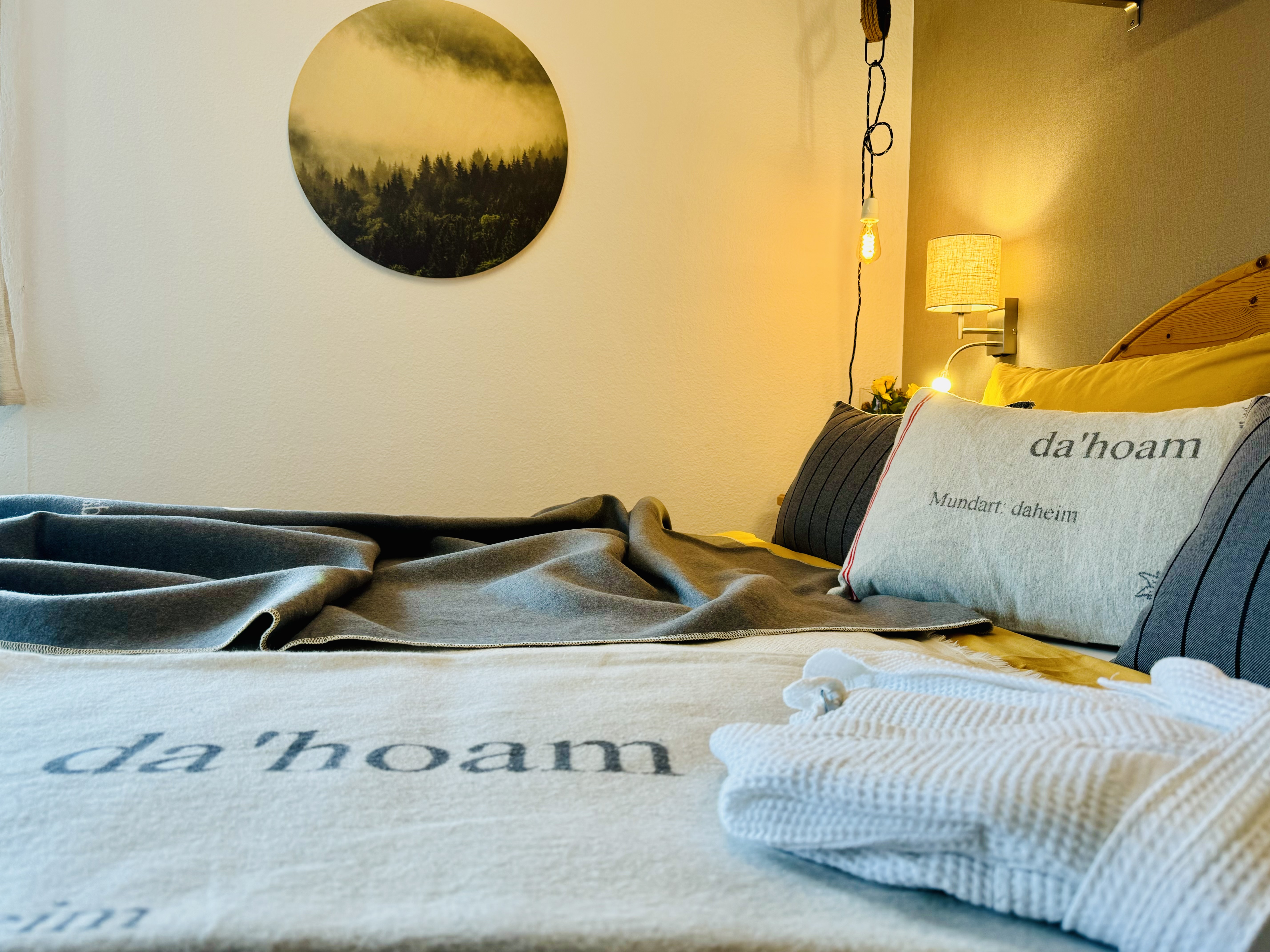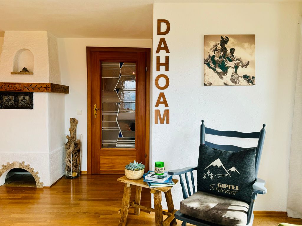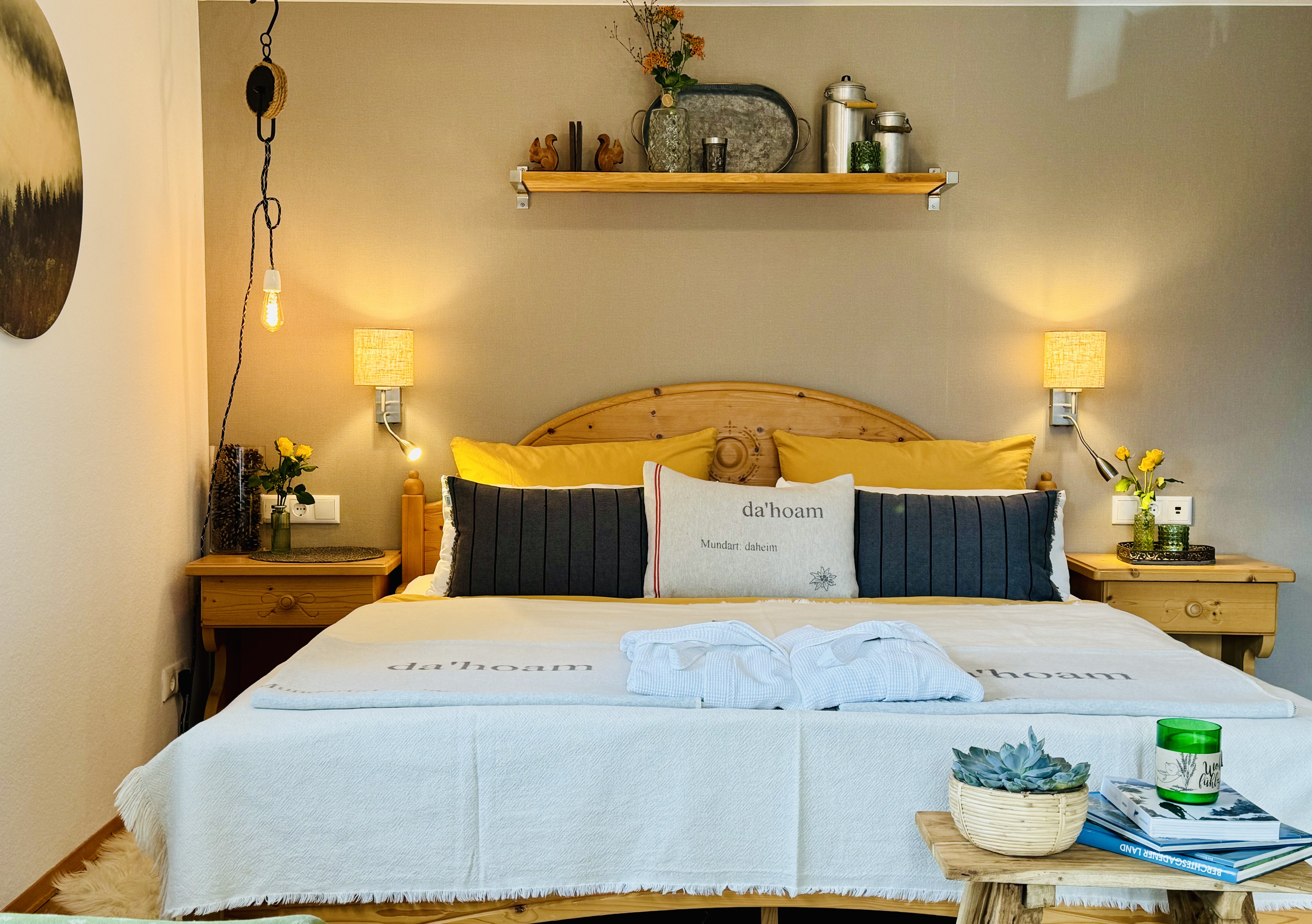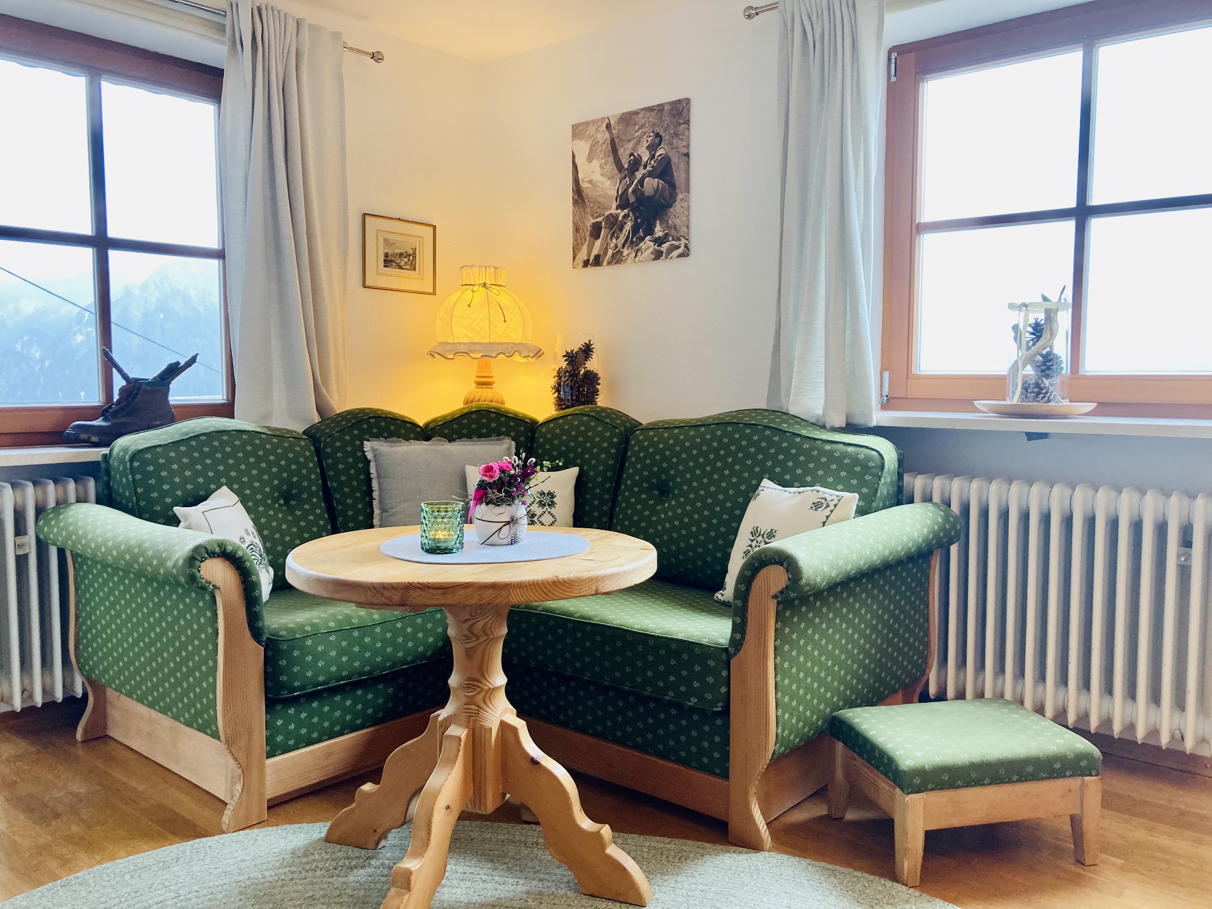 Das Herzstück unserer Ferienwohnung Dahoam ist der gemütliche Wohn–und Schlafbereich mit Doppelbett, Canapé, Kachelofen und mit Blick auf den Watzmann.