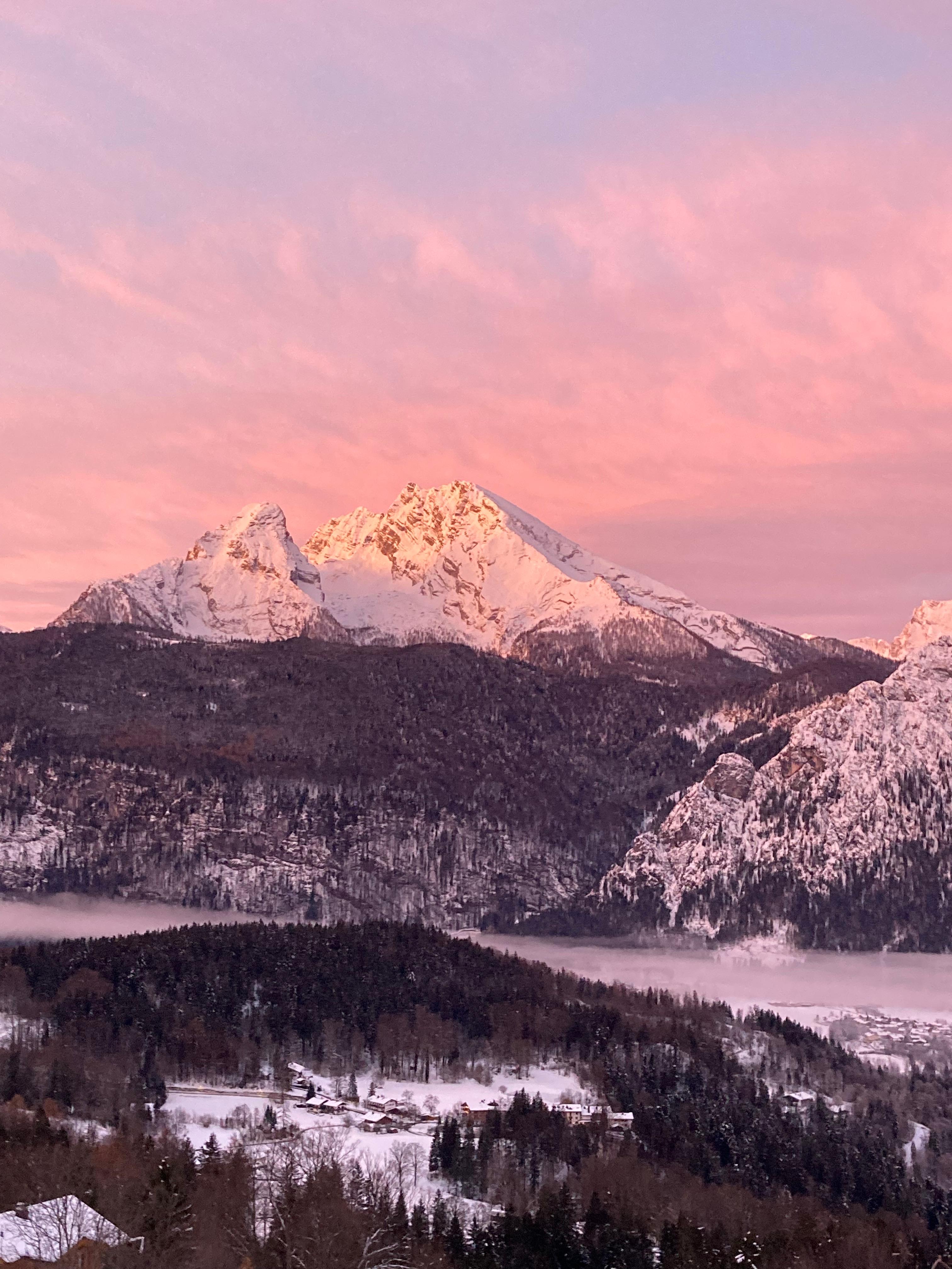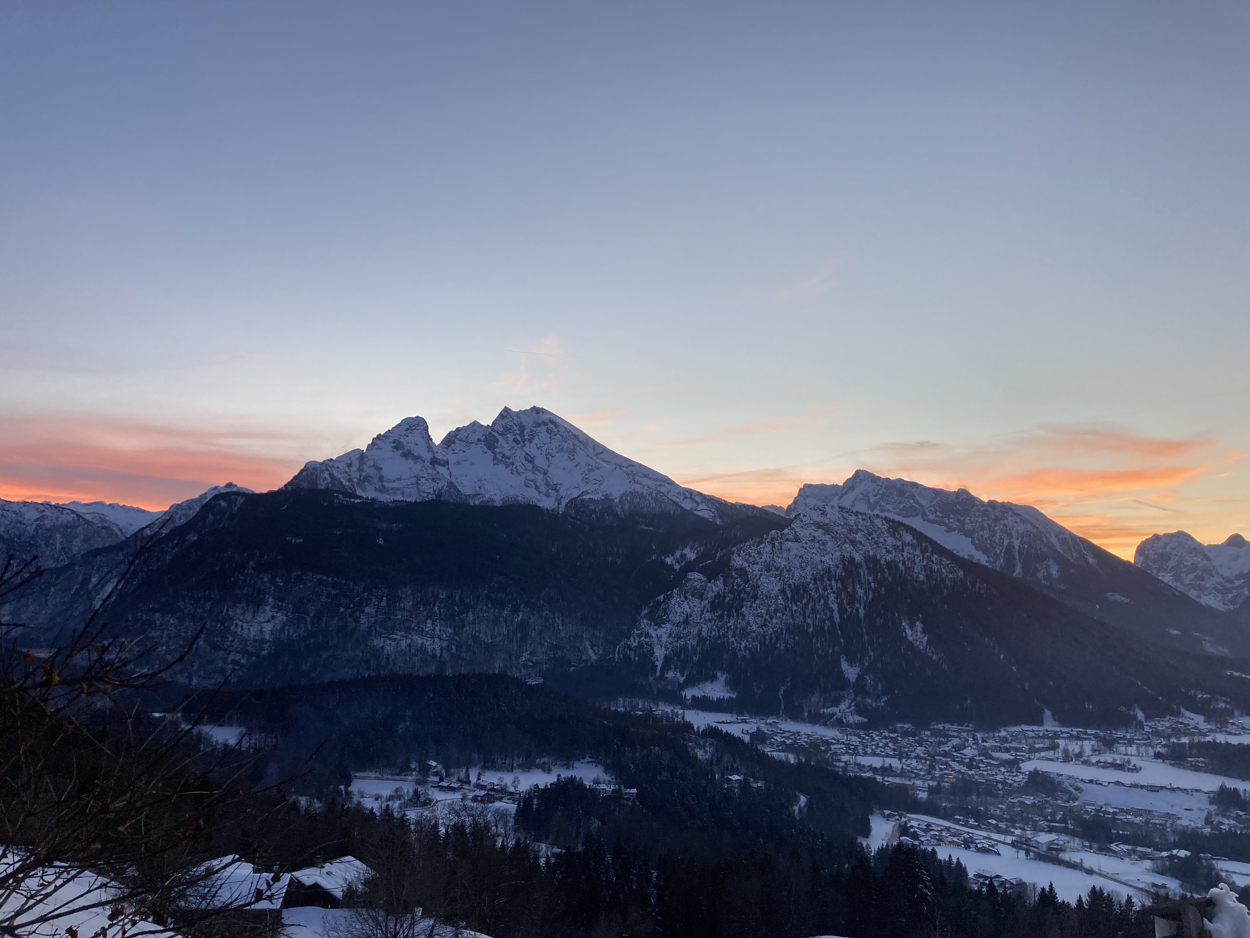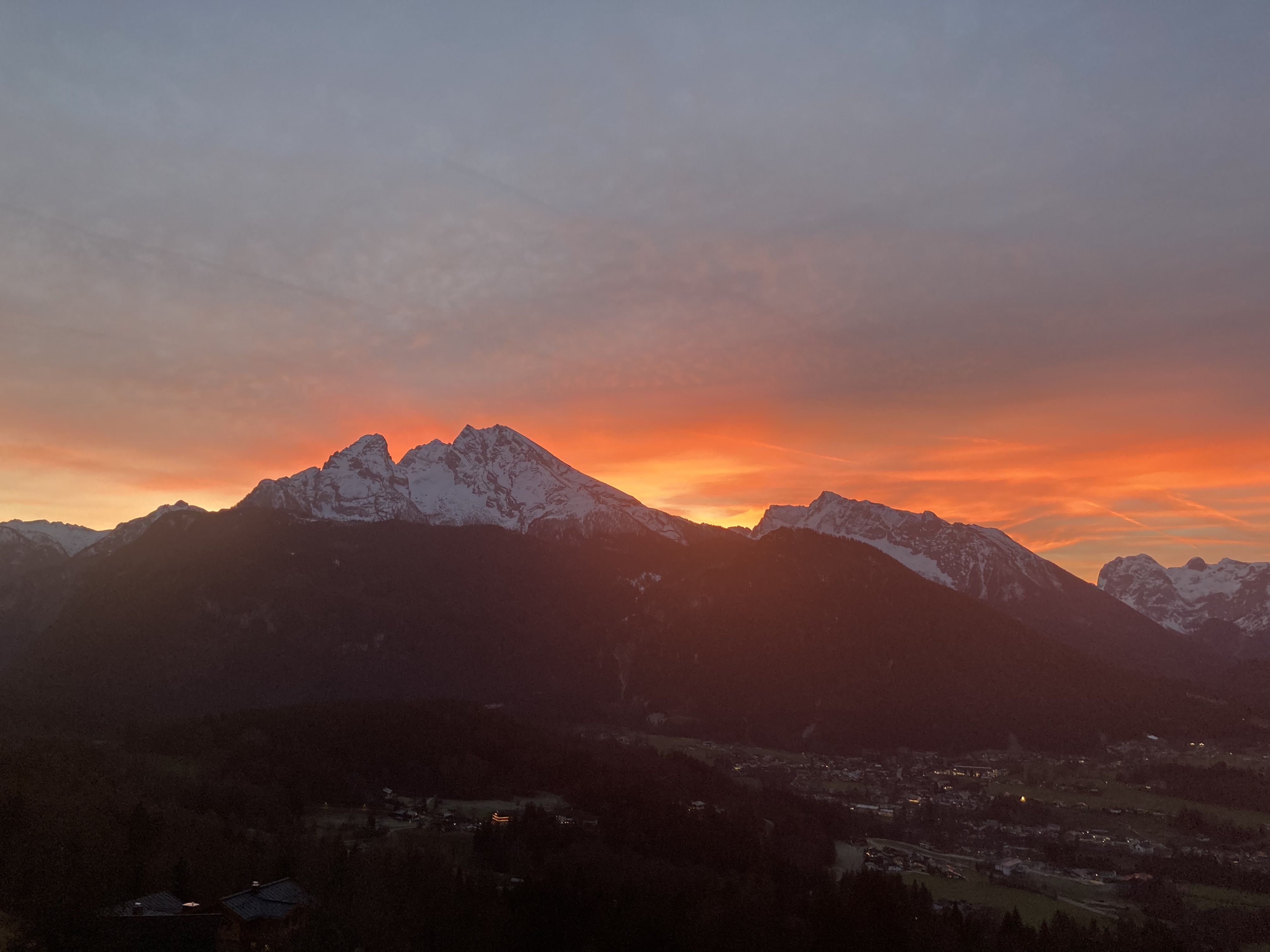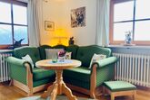 Das Herzstück unserer Ferienwohnung Dahoam ist der gemütliche Wohn–und Schlafbereich mit Doppelbett, Canapé, Kachelofen und mit Blick auf den Watzmann.