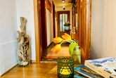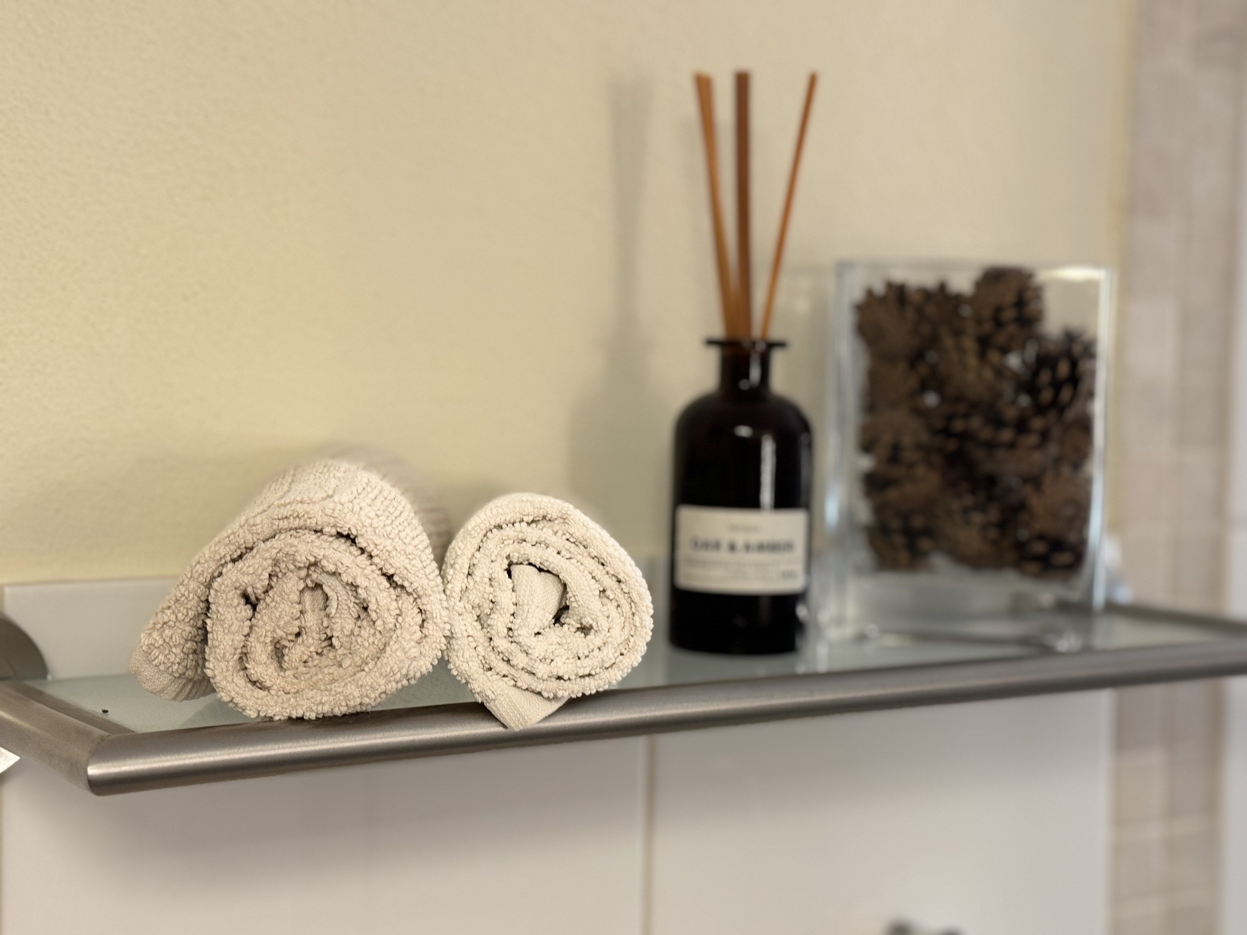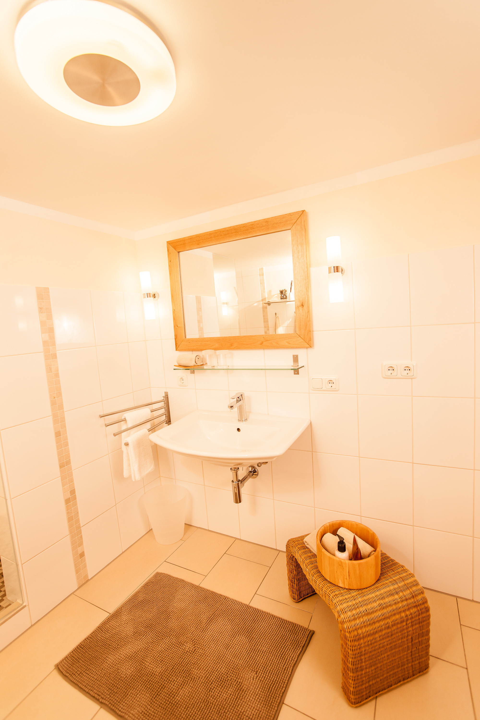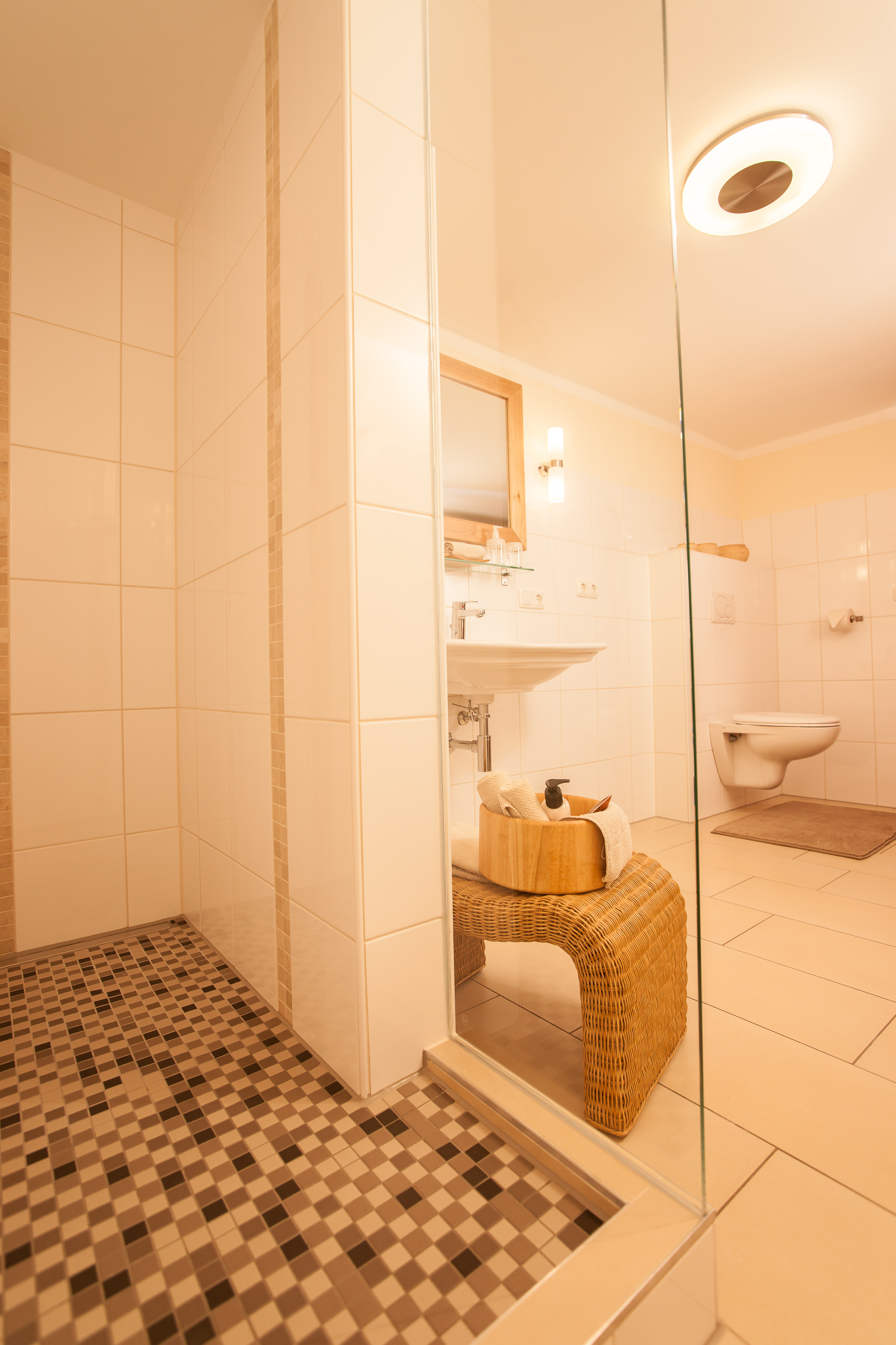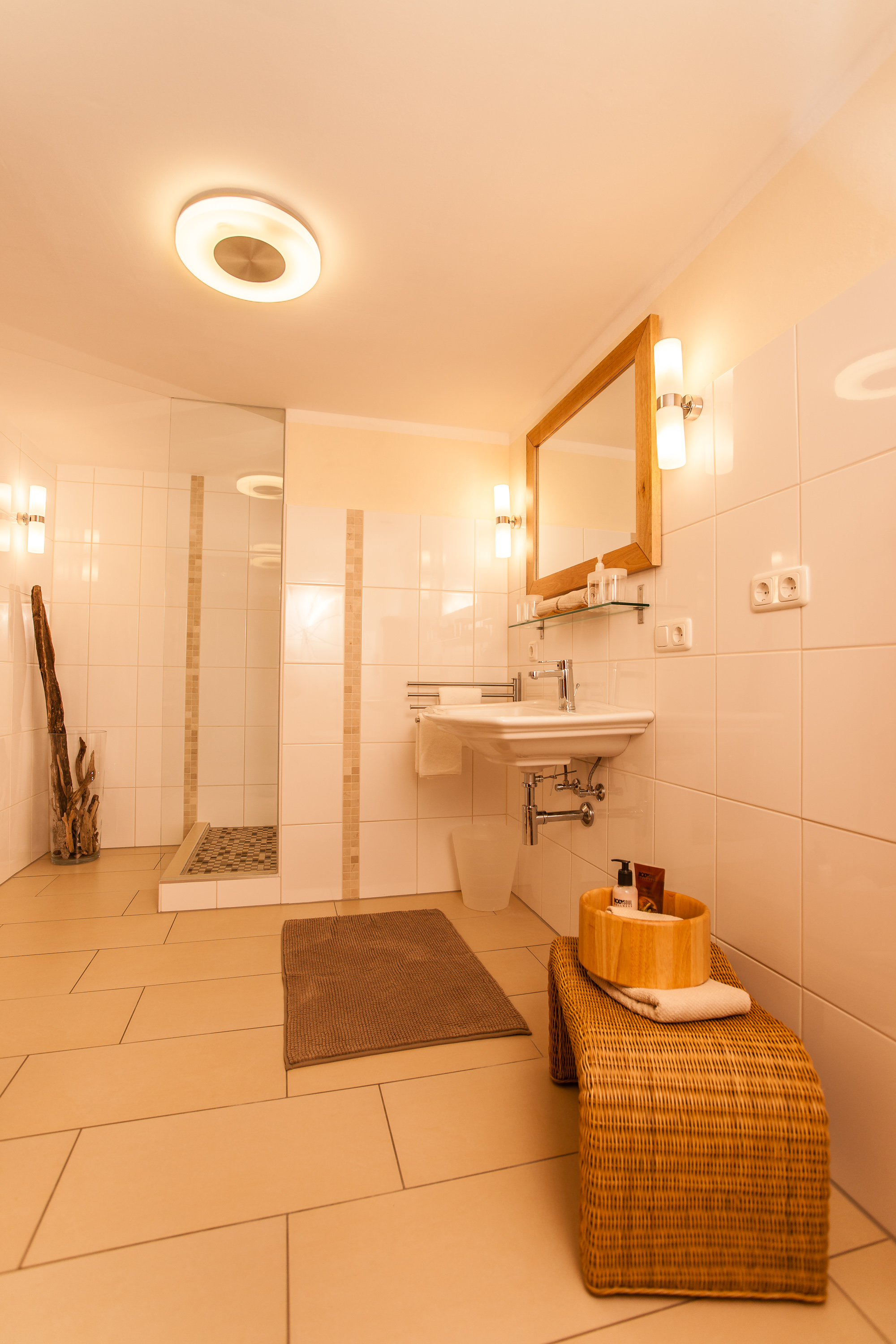 Großzügiges Bad mit offener Dusche, Kosmetiktisch, Holzhocker, 2 Bademäntel, Handtücher, Duschtücher, Gästehandtücher, Seife, Fön.