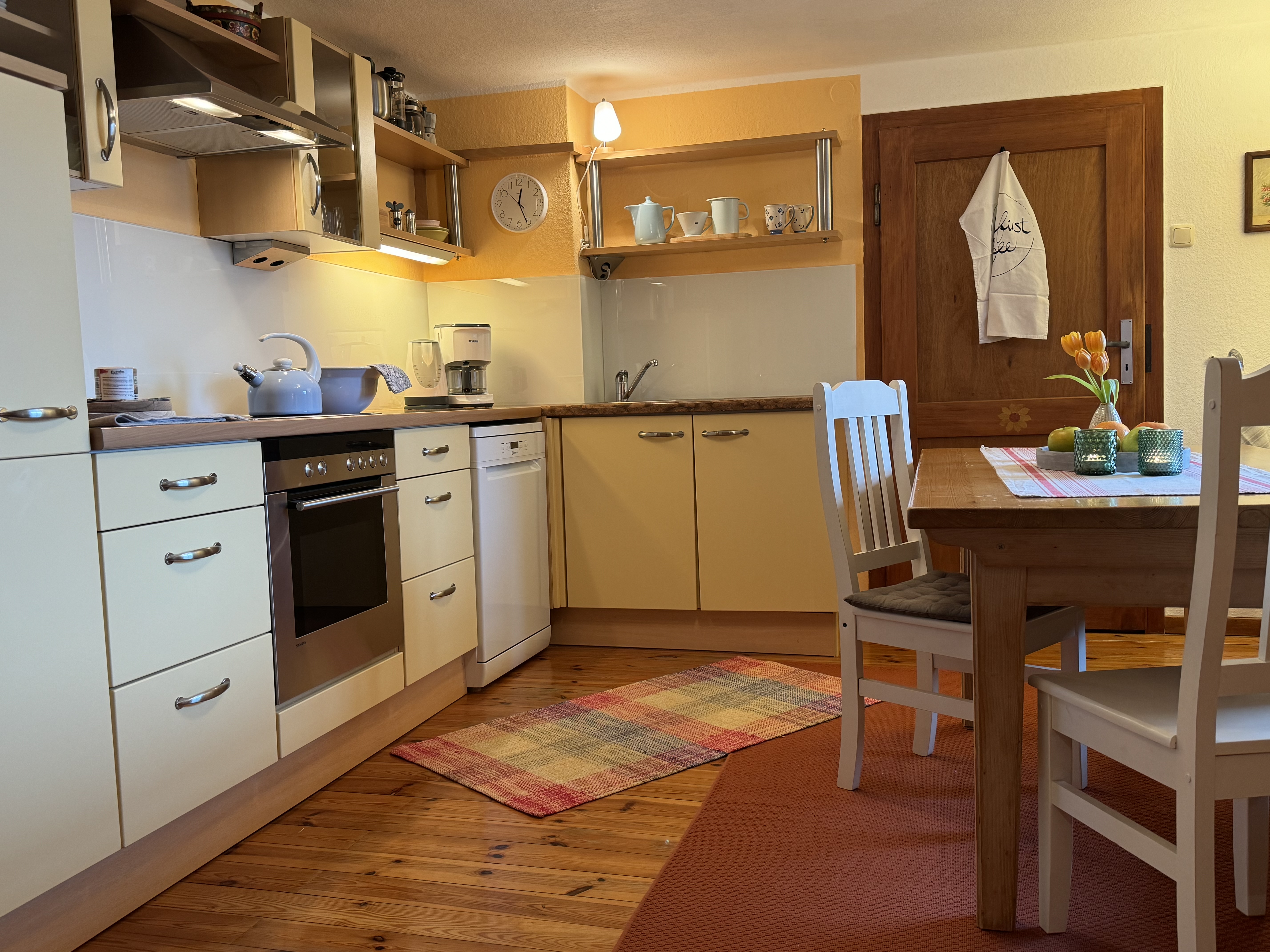Küche – Vollausstattung. Esstisch mit Küchenbank, Küchenzeile, rundes Spülbecken mit Marmoreinfassung, Küchenutensilien, Kaffeemaschine, Espressomaschine, Teeauswahl, Wasserkocher, Taster, Eierkocher, Brotzeitbrett, Kühl– Gefrierkombination... es ist alles da!
