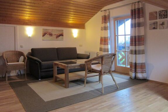Gemütliche neu renovierte Dachgeschoßwohnung mit herrlichem Blick auf die umliegenden hige Lage am Ortsrand. Wir bieten in der Ferienwohnung kostenlosen W-LAN Empfang an.Kinder sind bei uns herzlich willkommen - auf unserer großzügigen Liegewiese sind Schaukel, Sandkasten und Rutsche vorhanden. Sie können gerne ein Laufrad oder die Bobby-Cars für Ihre Kleinen nutzen!Kinderbett gerne möglich, hervorragend geeignet für Familienurlaub mit Kindern!Es stehen zusätzlich 2 Zustellbetten im großzügigen Wohnzimmer zur Verfügung.Zahlreiche Bauernhöfe mit Tieren in der Nähe!