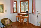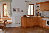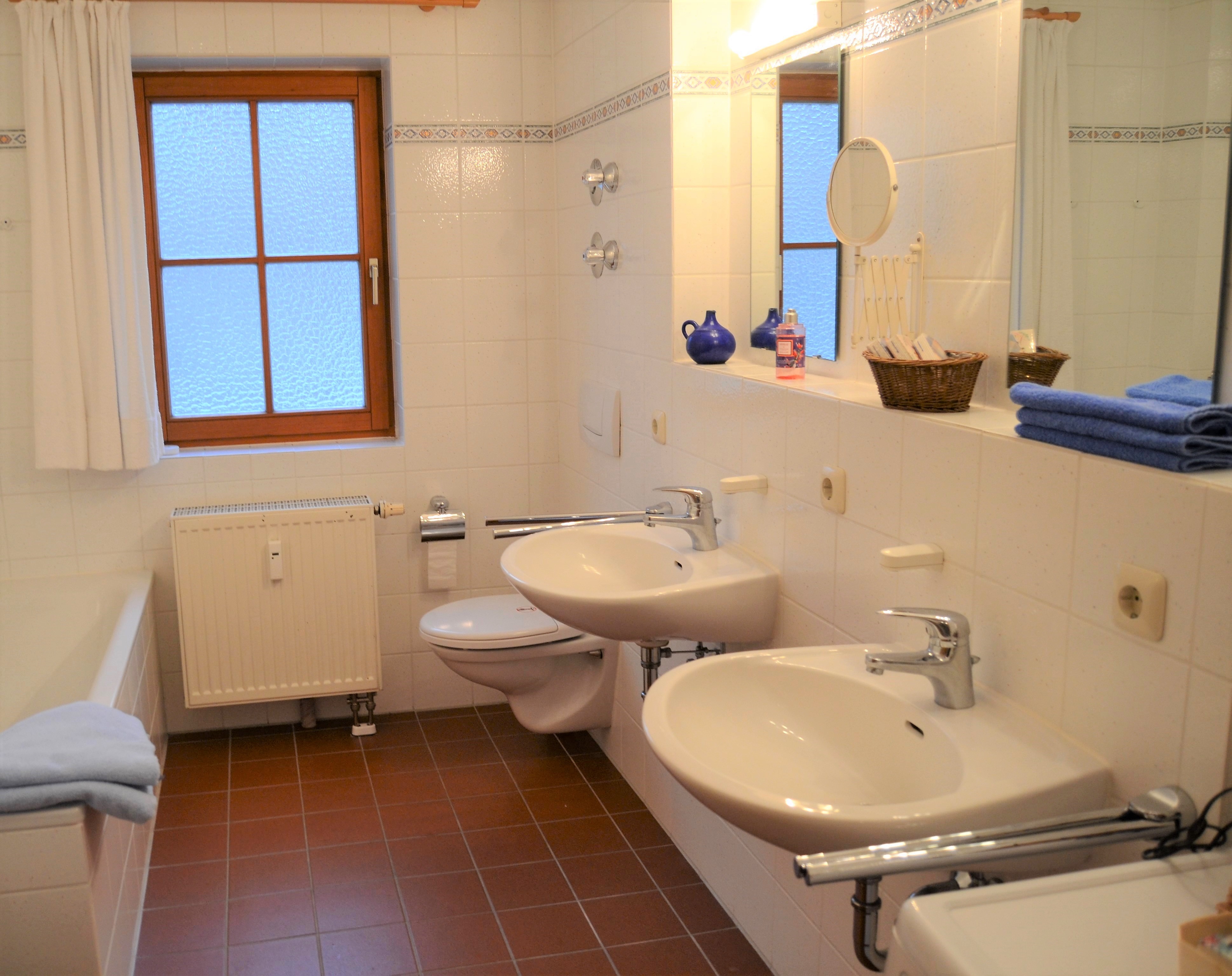 Die Ferienwohnung verfügt über eine gehobene Ausstattung und ist liebevoll eingerichtet. Im Mittelpunkt steht der große Wohnraum mit integrierter Küchenzeile und einem gemütlichen Essplatz im Erker auf der einen Seite sowie einem Wohnzimmerbereich mit Sofa und Sesseln auf der anderen. Hier liegt auch der Zugang zur Terrasse mit Gartenmöbeln und Liegestühlen. Die Küche ist vollständig ausgestattet mit Spülmaschine, Kühlschrank mit Eisfach, Herd mit 4 Kochplatten und Backofen, Kaffeemaschine, Wasserkocher, Toaster. Im großen Wohnzimmerbereich finden Sie einen Sat-TV, eine CD Anlage, eine kleine Bibliothek und Spielesammlung. Im Schlafzimmer stehen ein Doppelbett, 2 Nachtschränke und ein großer 5-türiger Schrank im bayerischen Landhausstil. Im 2. Schlafzimmer finden Sie ein Einzelbett, einen Sekretär sowie eine Kommode. Im Badezimmer mit separater Duschkabine, Badewanne und 2 Waschbecken steht auch eine Waschmaschine zur Verfügung.