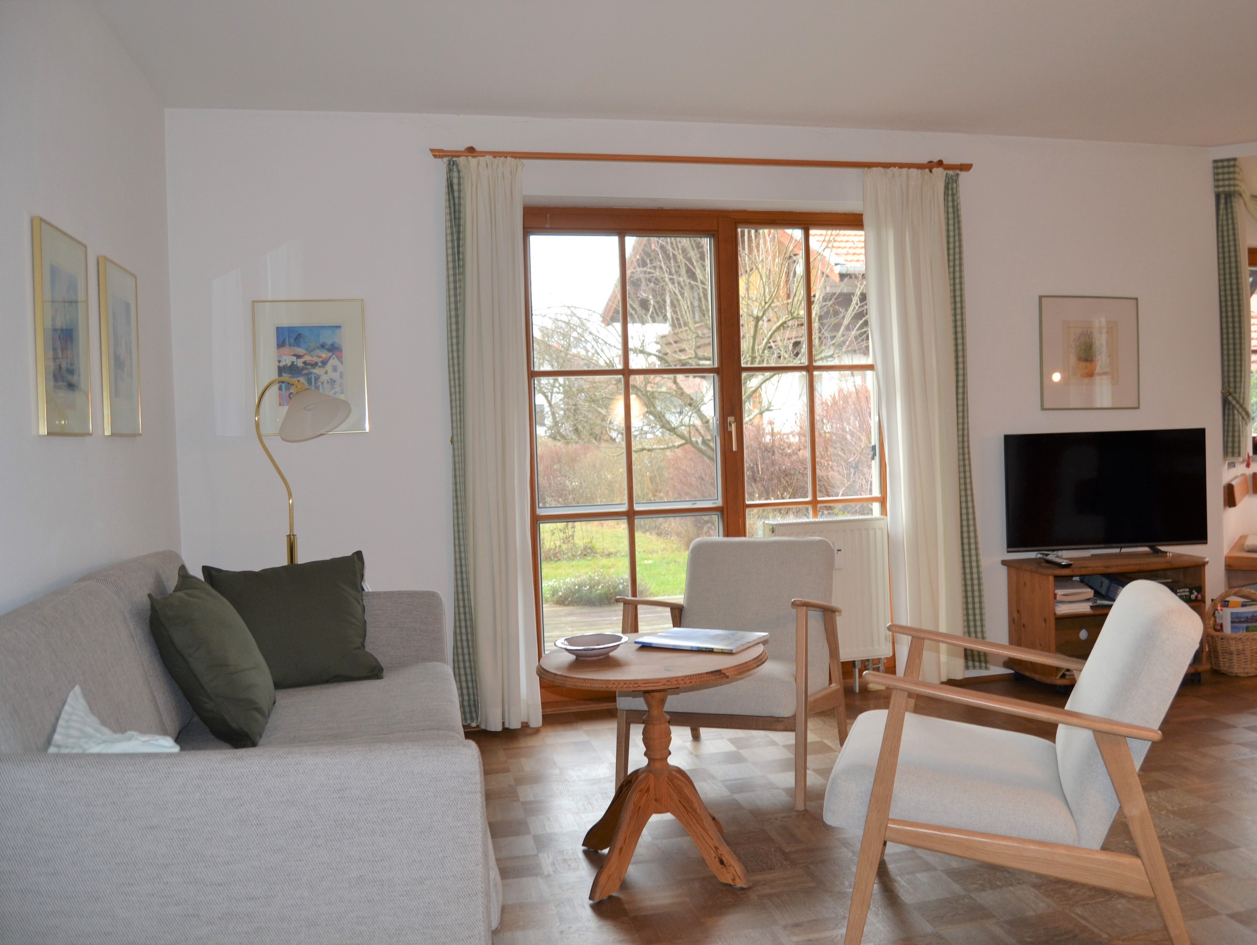 Die großzügige Ferienwohnung liegt am Rand des hübschen Dorfes Törwang, mitten auf dem Samerberg. Sie befindet sich im Ergeschoss eines gepflegten Mehrfamilienhauses. Vom Wohnraum erreicht man die sonnige Süd-West-Terrasse mit Gartenanteil. Hier bietet sich ein herrlicher Blick auf die umgebenden Weiden und Wiesen sowie auf die Hausberge Hochries und Heuberg. Zur Wohnung gehören ein Tiefgaragenstellplatz sowie ein abschließbarer Gemeinschaftsfahrradraum, die beide vom Treppenhaus erreichbar sind.