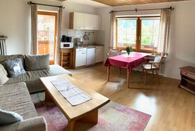 Unsere gemütlich eingerichteten, sonnigen Ferienwohnungen für 2-4 Personen haben separate Schlafzimmer und eine gut ausgestattete Wohnküche mit Spülmaschine, Mikrowelle, Kaffeemaschine, Wasserkocher, Toaster, etc. Umgeben von grünen Wiesen und herrlichem Bergpanorama lädt der großzügige Balkon zum Erholen ein.