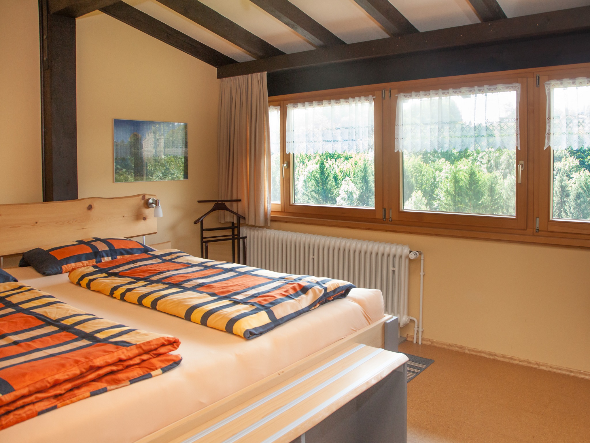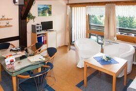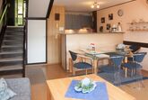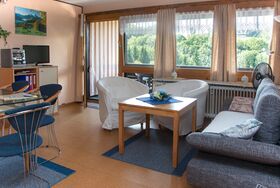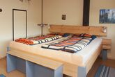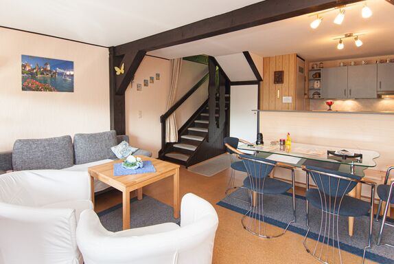 Das Appartement ist im Maisonettstil. In der Eingangsetage befindet sich das Bad. Die Schlafräume sind in der oberen Etage, in der unteren Etage der Wohnraum mit Küche. Komplett eingerichtet, für bis zu 6 Personen. Kaffeemaschine, Wasserkocher, Toaster, Mikrowelle, Kinderbett, Kinderhochstuhl, Kindersicherung am oberen Treppenabsatz, Radio, Sat-TV. Alle Betten sind in Komforthöhe (kniehoch), das Doppelbett im Schlafzimmer ist in Übergröße ( 2 x 2,20 m). Wohnfläche ca. 78 qm², Südbalkon mit Möbeln. Wohnraum mit Couchecke und Essplatz, Küchenzeile, Küchenbar.