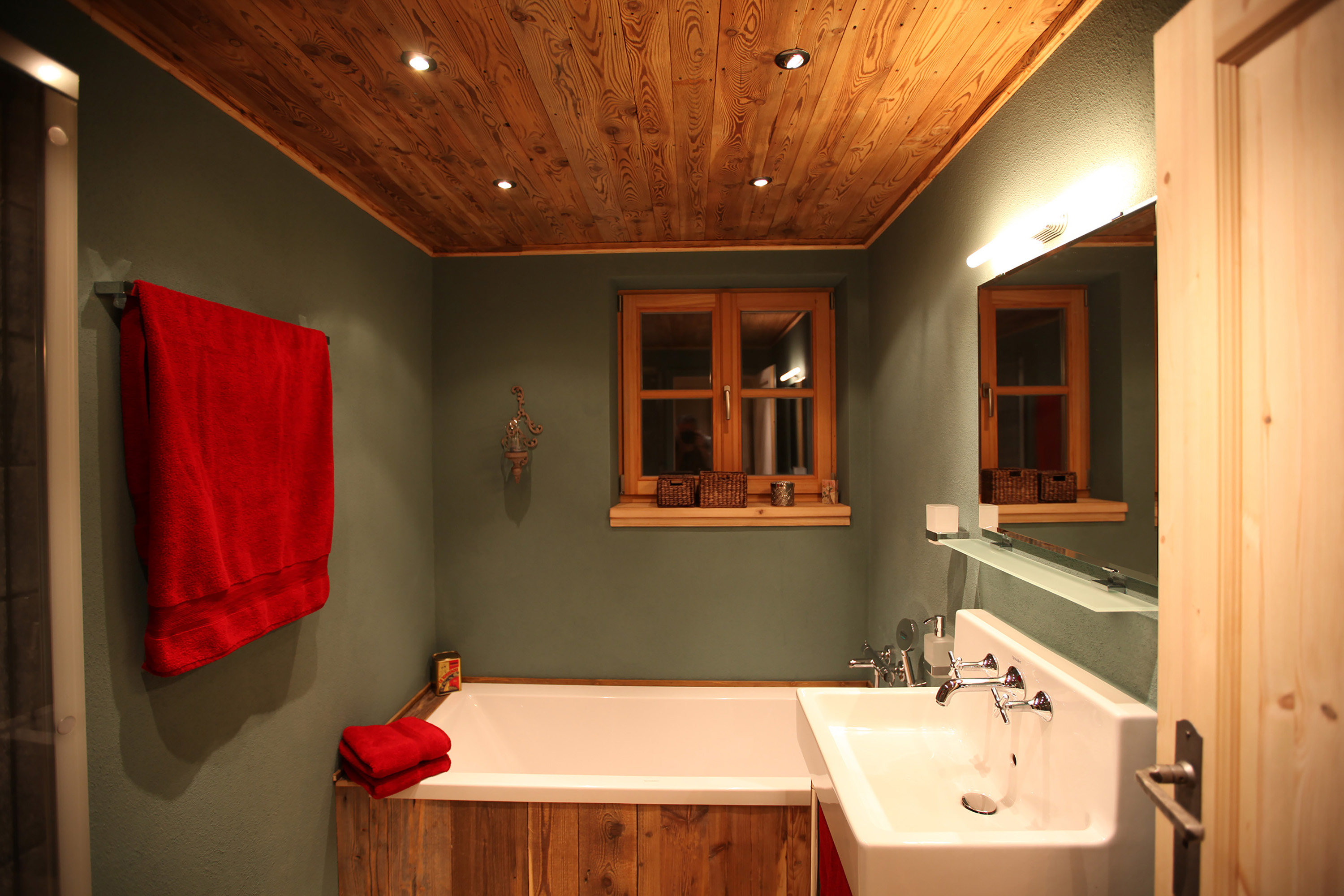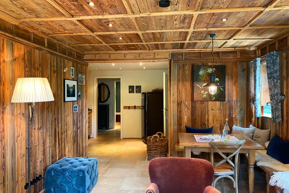 Klassische, alpine Stube mit Alkoven und Kanonenofen, vollständig mit Altholz verkleidet. Oberboden, französischer Burgunder. Klassischen Ledermöbeln, Esstisch mit Eckbank im Stil alter Bergehäuser. Küche vollausgestattet als Landhausküche. Freistehender Kühlschrank im Stil der 50er Jahre. Seperater Eingangsbereich mit vorgelagerter Ostterasse. Gäste-WC im marokkanischen Stil. Badsituation mit Badewanne, luxuriöser Dusche und Waschtisch. Alle Böden und Duschbereiche mit belgischen und französischen Natursteinen bekleidet. Seperater Flur zum Schlafzimmer. Dort ein großzügiges Boxspring-Bett, kleiner Schreibplatz und Kleiderschrank. Gesamtfläche Chalet Bergstube beträgt ca. 60qm. Unsere geschätzten Gäste haben freien Eintritt in Hallen- und Freibad. WLAN steht Ihnen zur Verfügung.