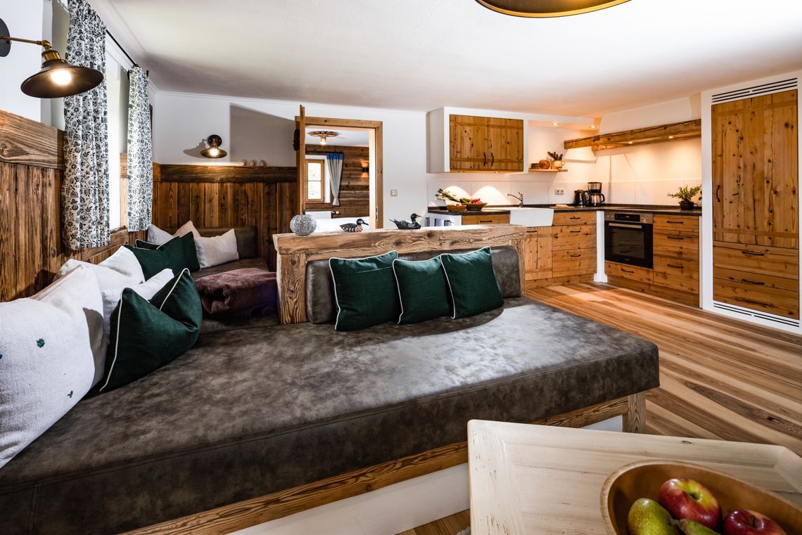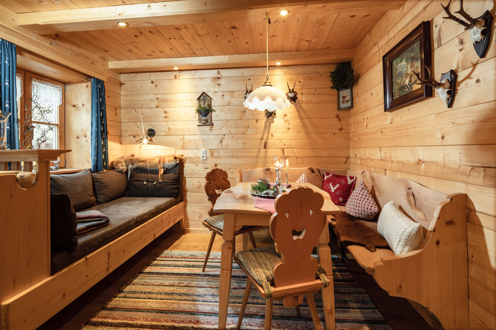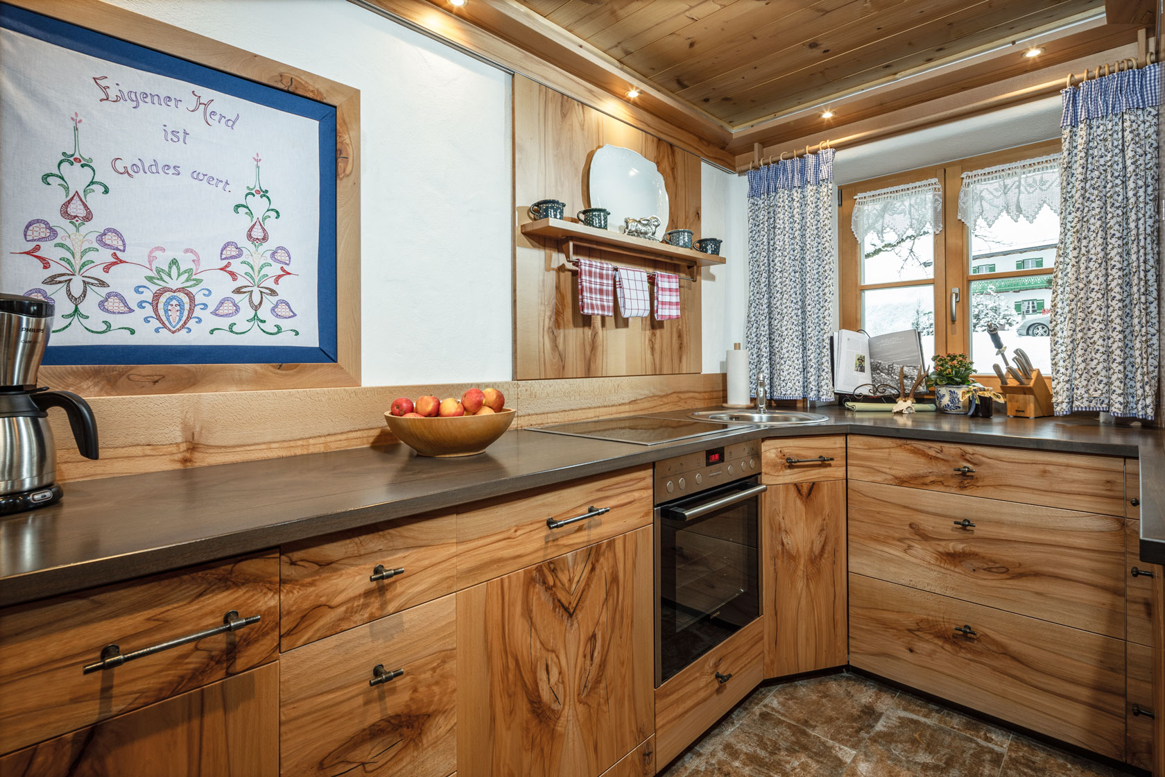 Die Küche ist aus Bergedellaubholz handgemacht mit Bergblick beim Kochen! Das Jagerstüberl besticht durch traditionelle Einrichtung, eine gemütliche Sitzecke und ein Sofa zum entspannen.