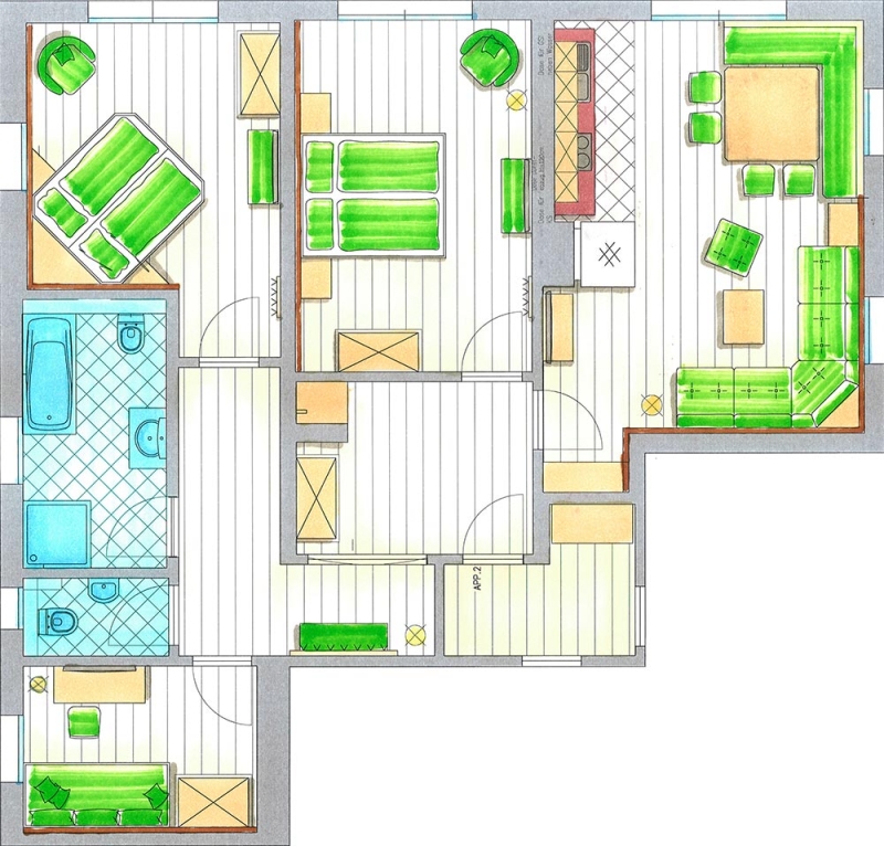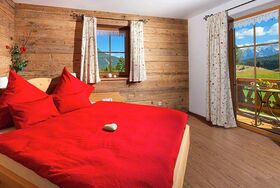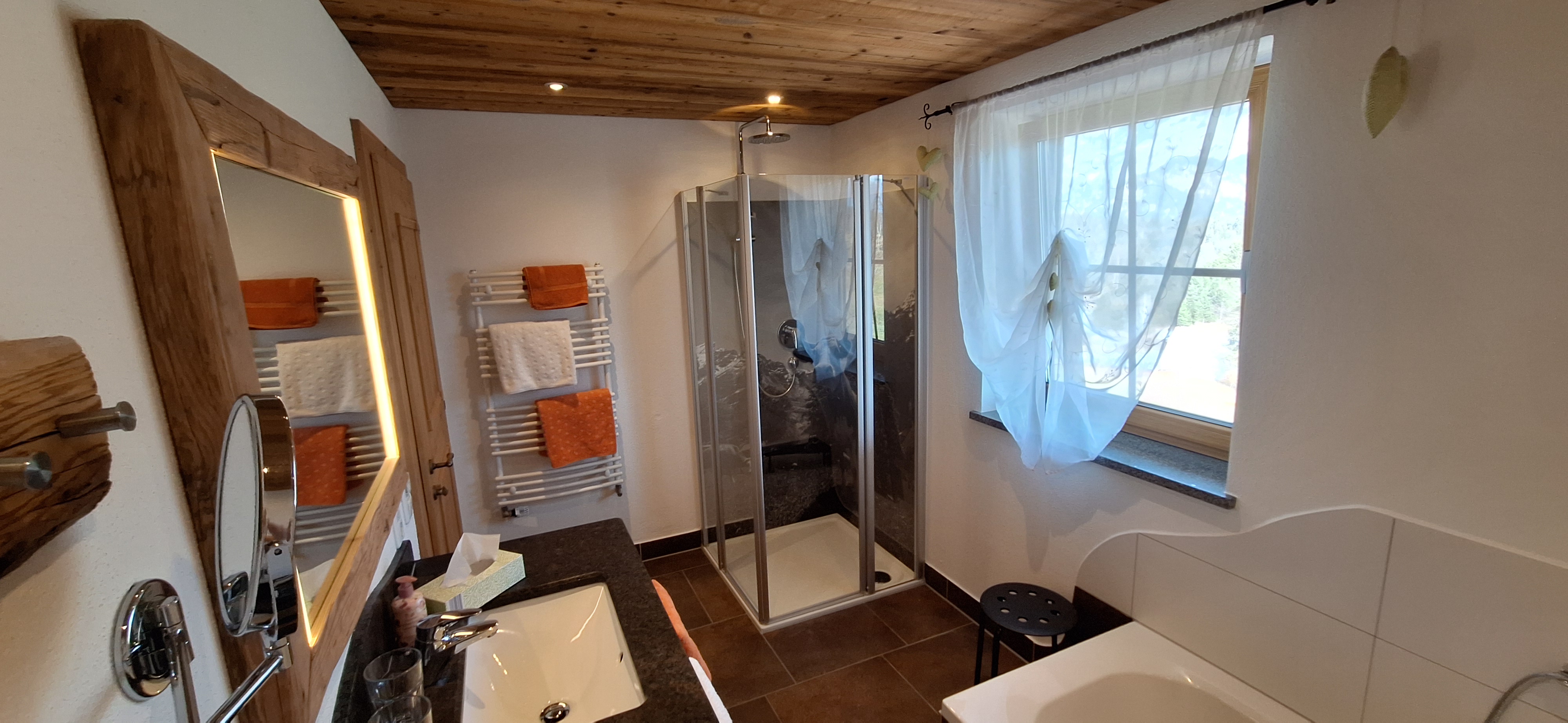 Die Ferienwohnung besteht aus: * einem 30 m² großen Wohn-/Küchenbereich mit einer voll ausgestatteten Küchenzeile, Eckbank, Esstisch, Stühlen und Couch * einem separaten Schlafzimmer mit erhöhtem Doppelbett (Länge 2,10 m) und Zudecke in Übergröße * einem zusätzlichen Schlafzimmer wie oben ausgestattet * einem Badezimmer mit Dusche, separater Badewanne und WC * einem separaten WC mit Außenfenster * einem Leseraum, der auch als Schlafzimmer genutzt werden kann * einem großen Balkon mit herrlicher Aussicht. Die Ferienwohnung besticht durch uriges Alm-Ambiente mit exklusiver Altholzausstattung.