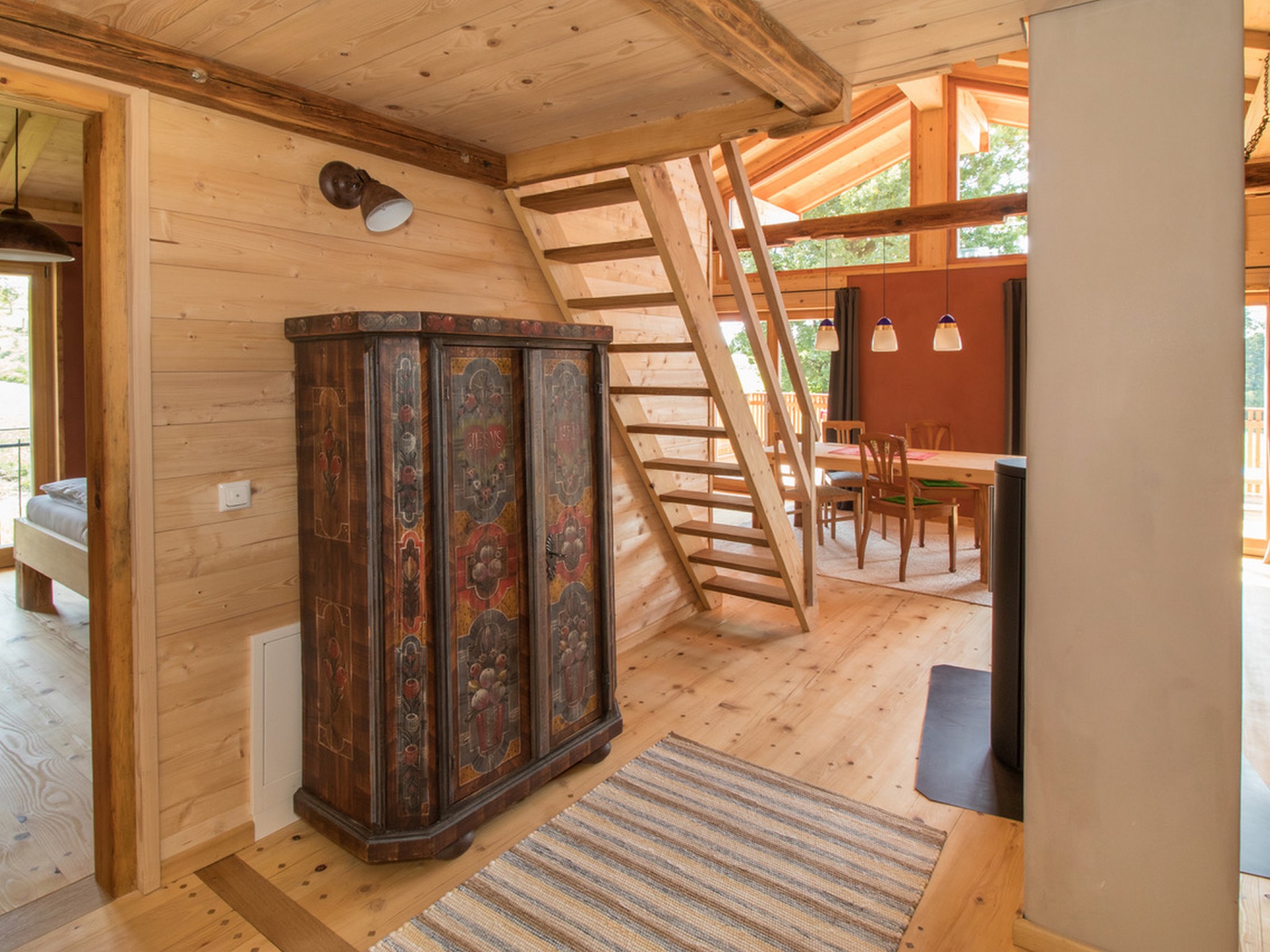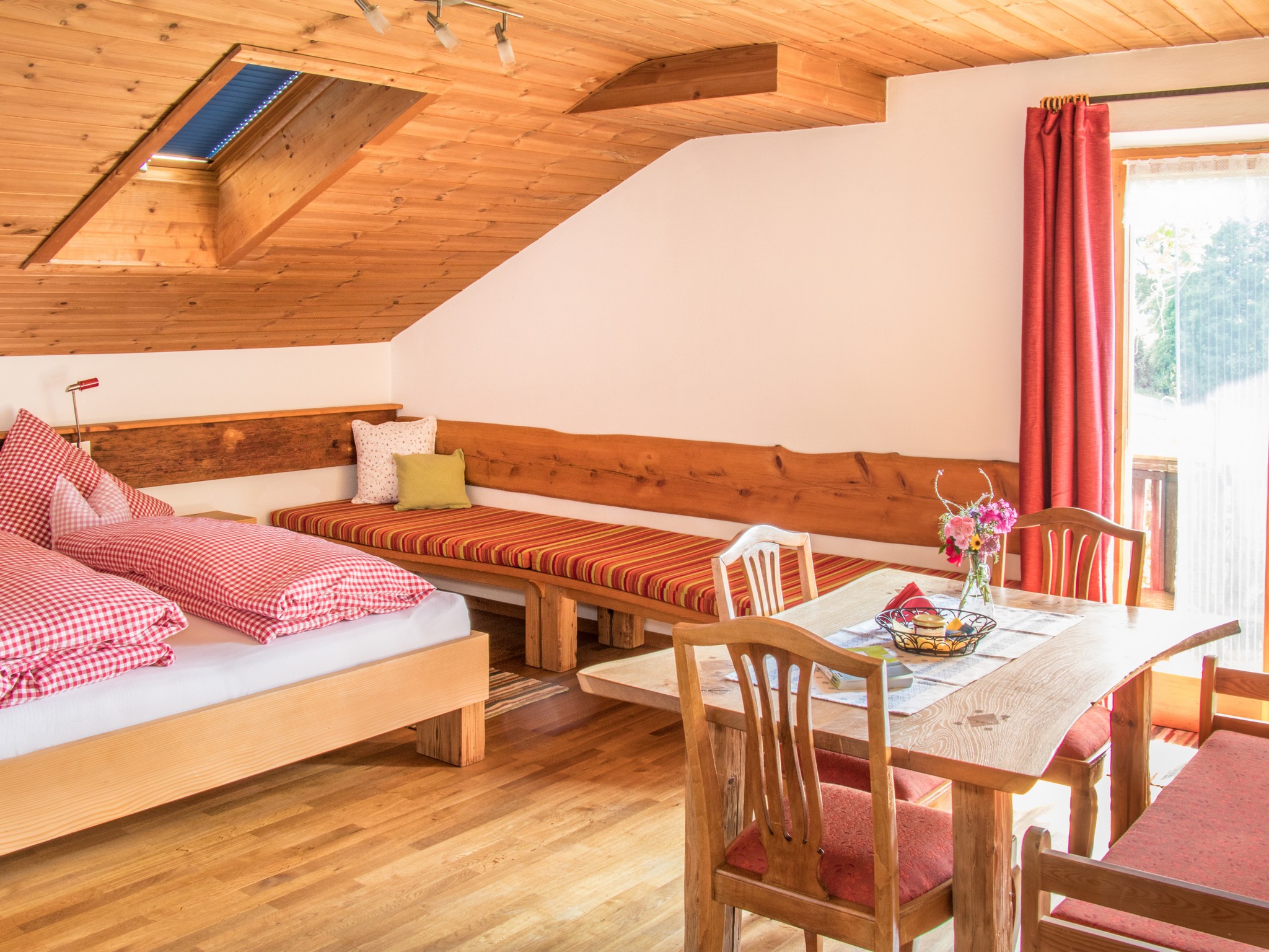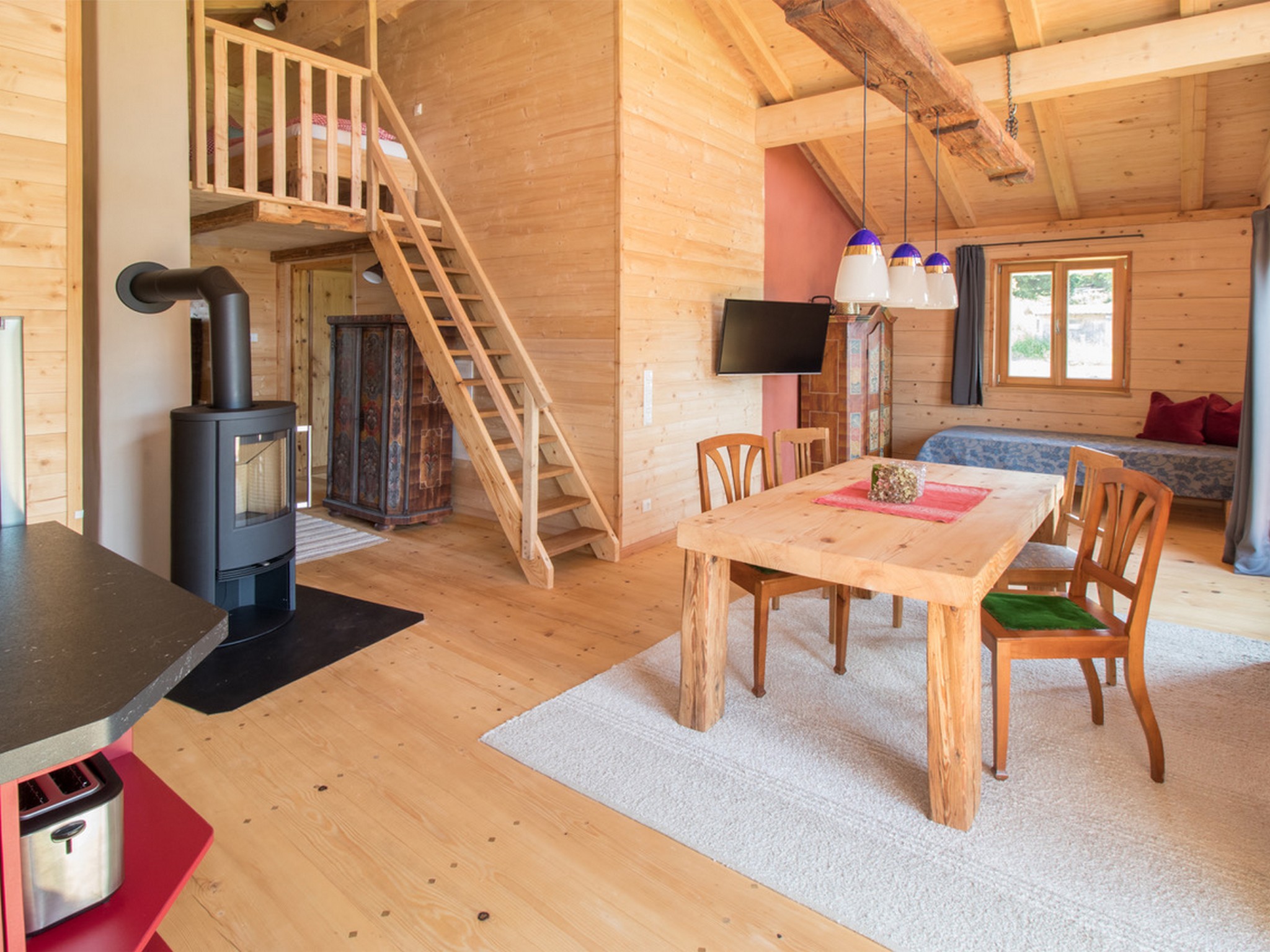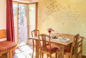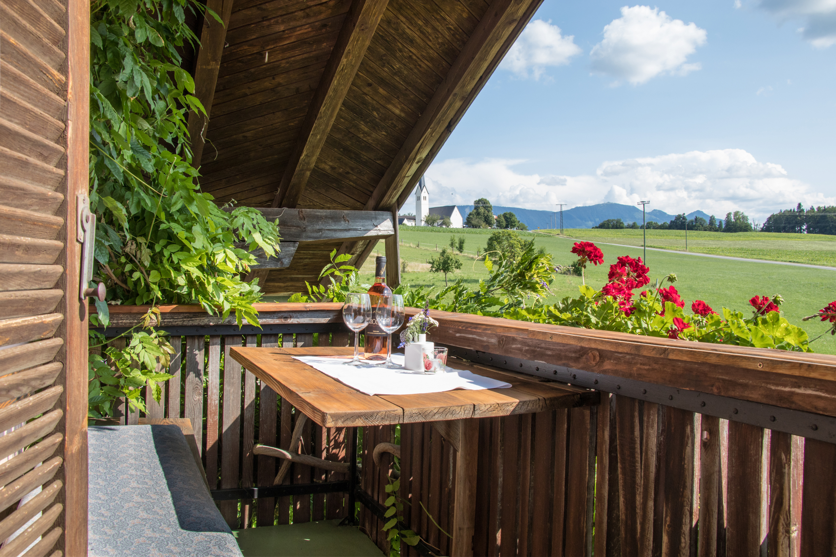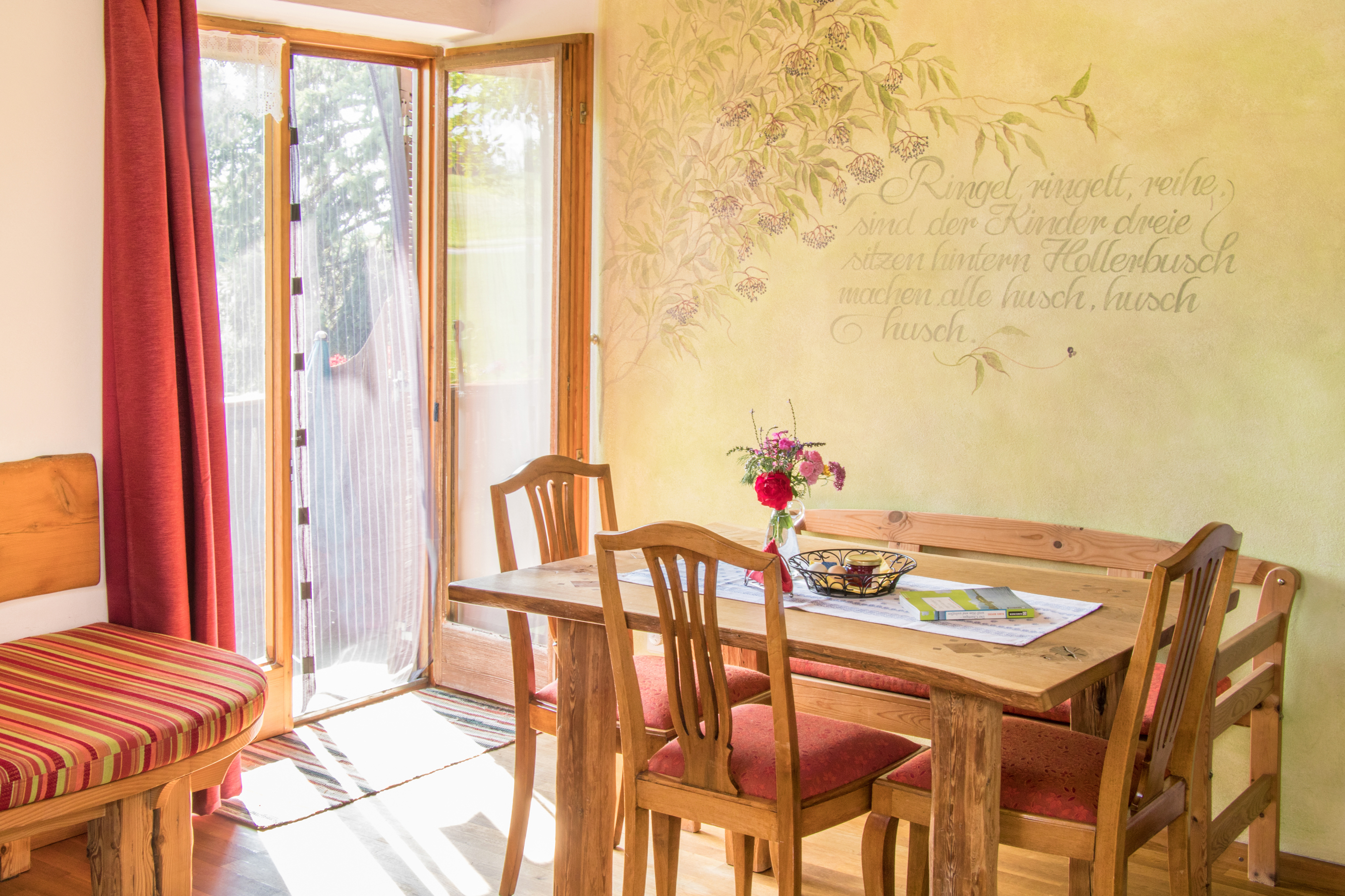 Ein schöner Holztisch lädt zum Frühstück ein oder Sie genießen das Frühstück auf dem Balkon, mit Aussicht auf die Kirche und die Berge.