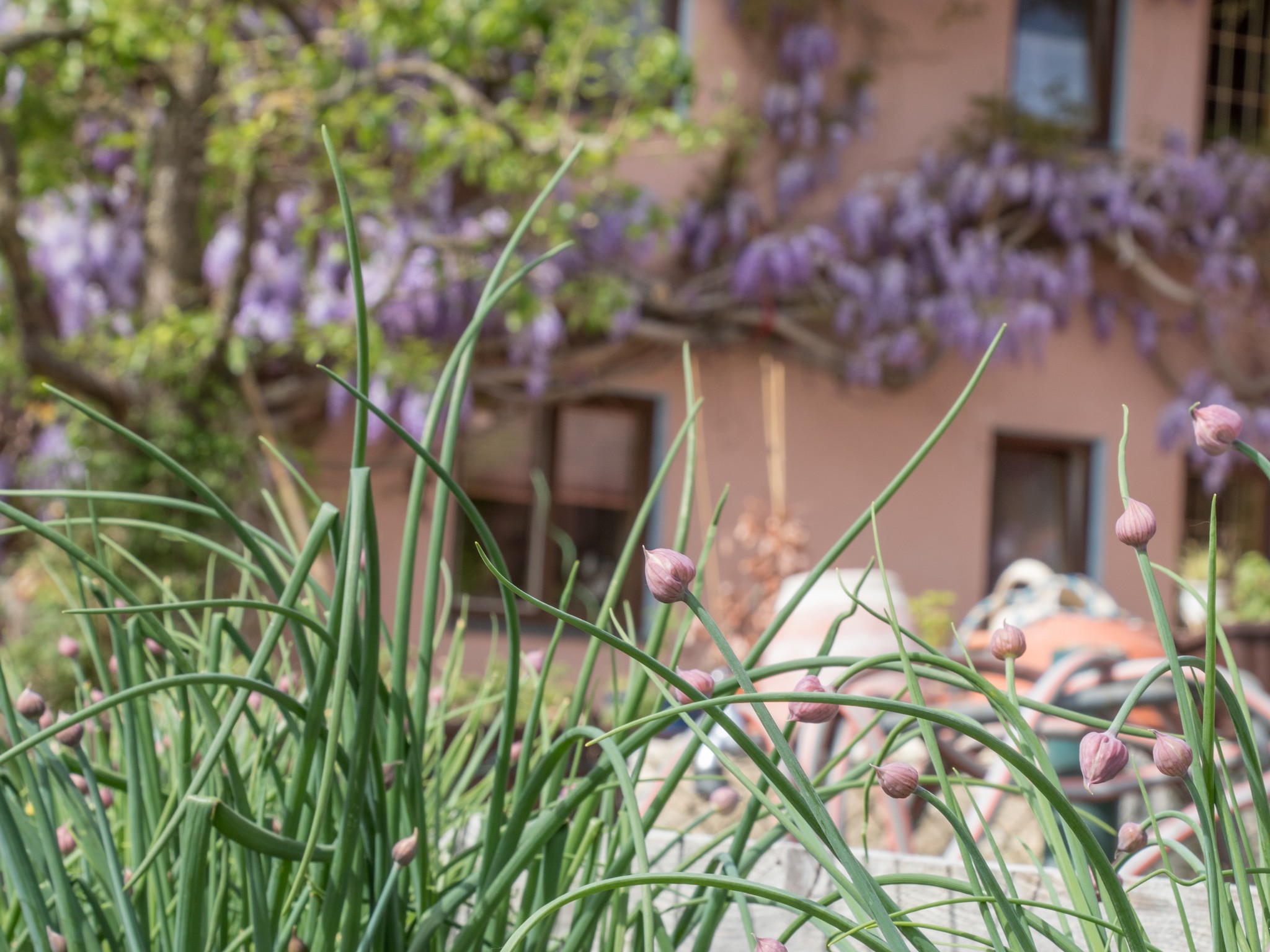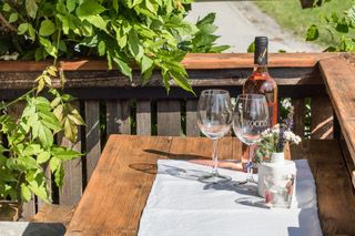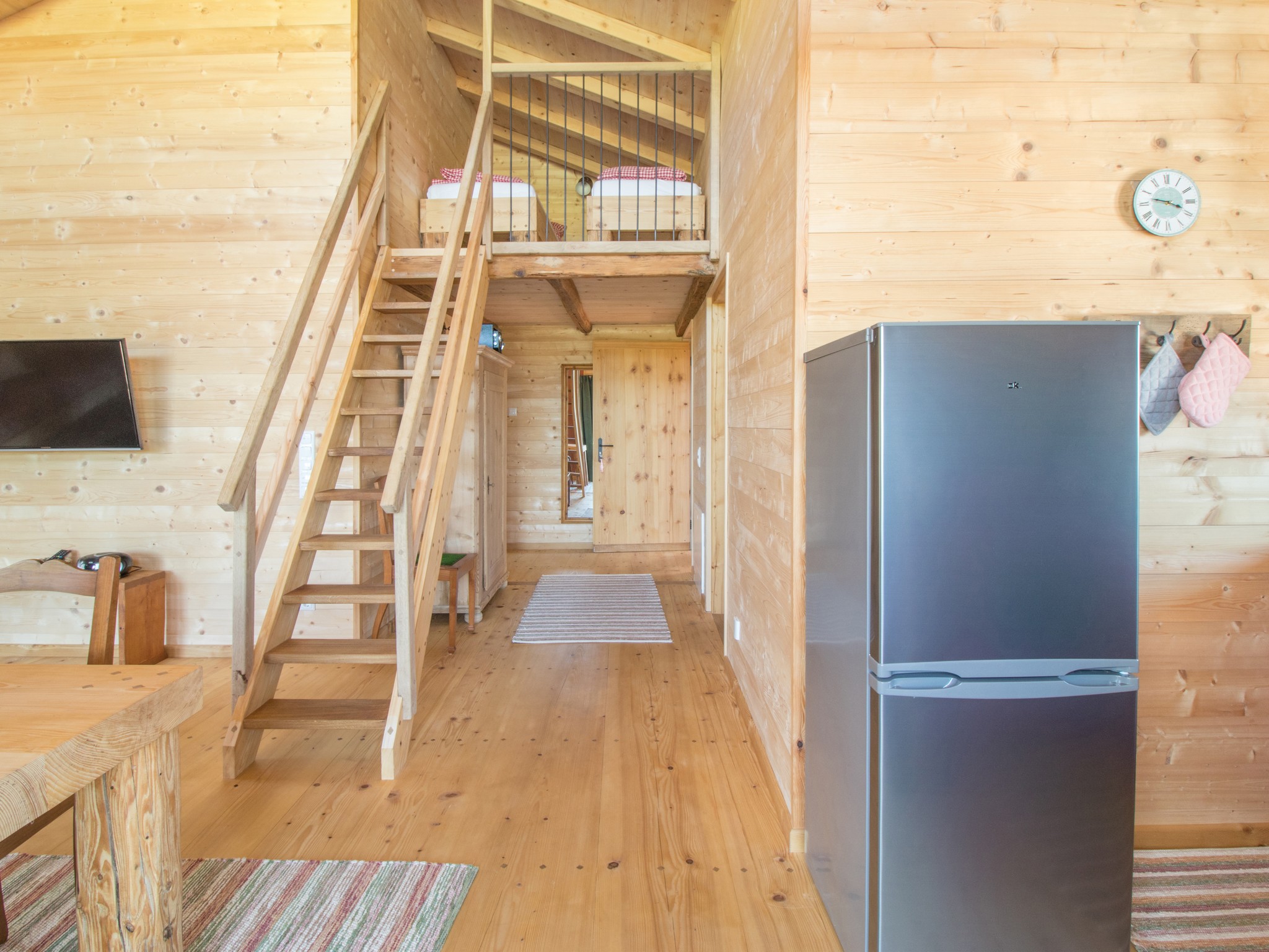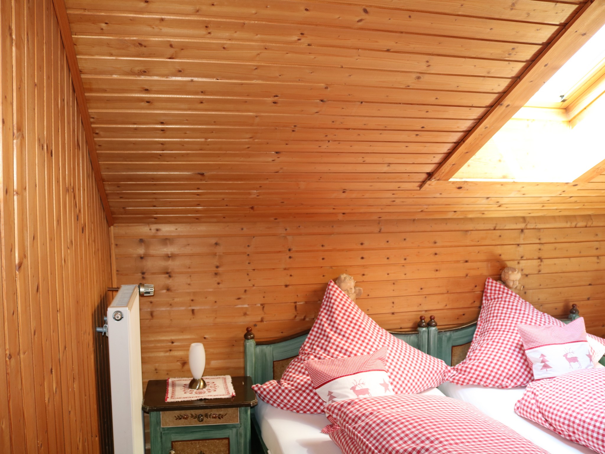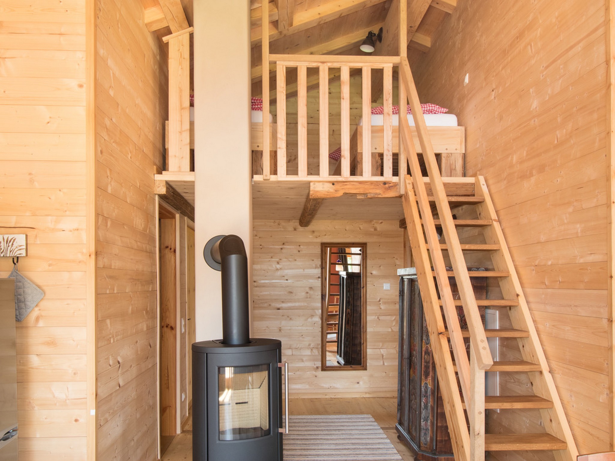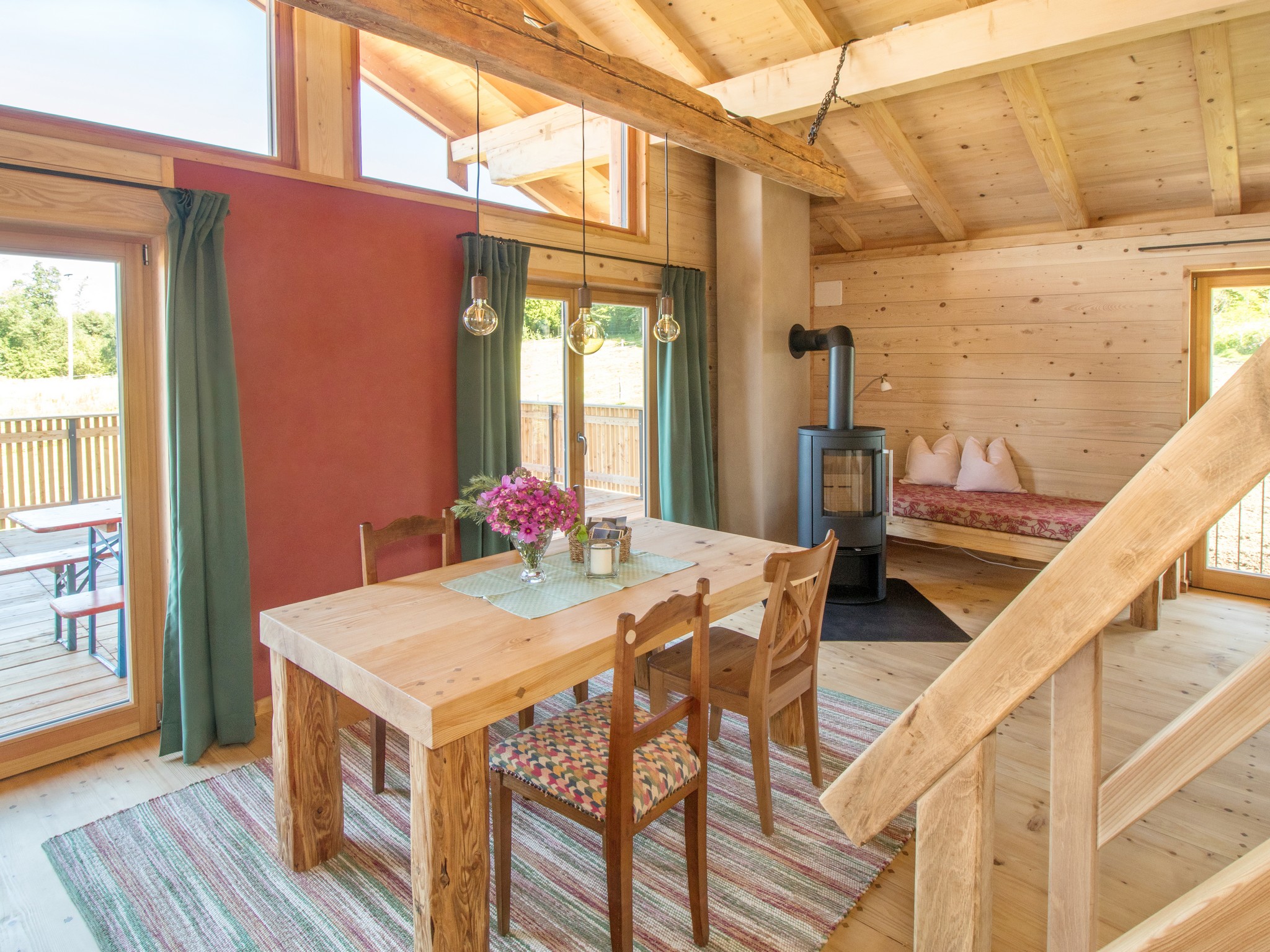 Ein schöner Holztisch lädt zum Frühstück ein oder Sie genießen das Frühstück auf dem Balkon, mit Aussicht auf die Kirche und die Berge.