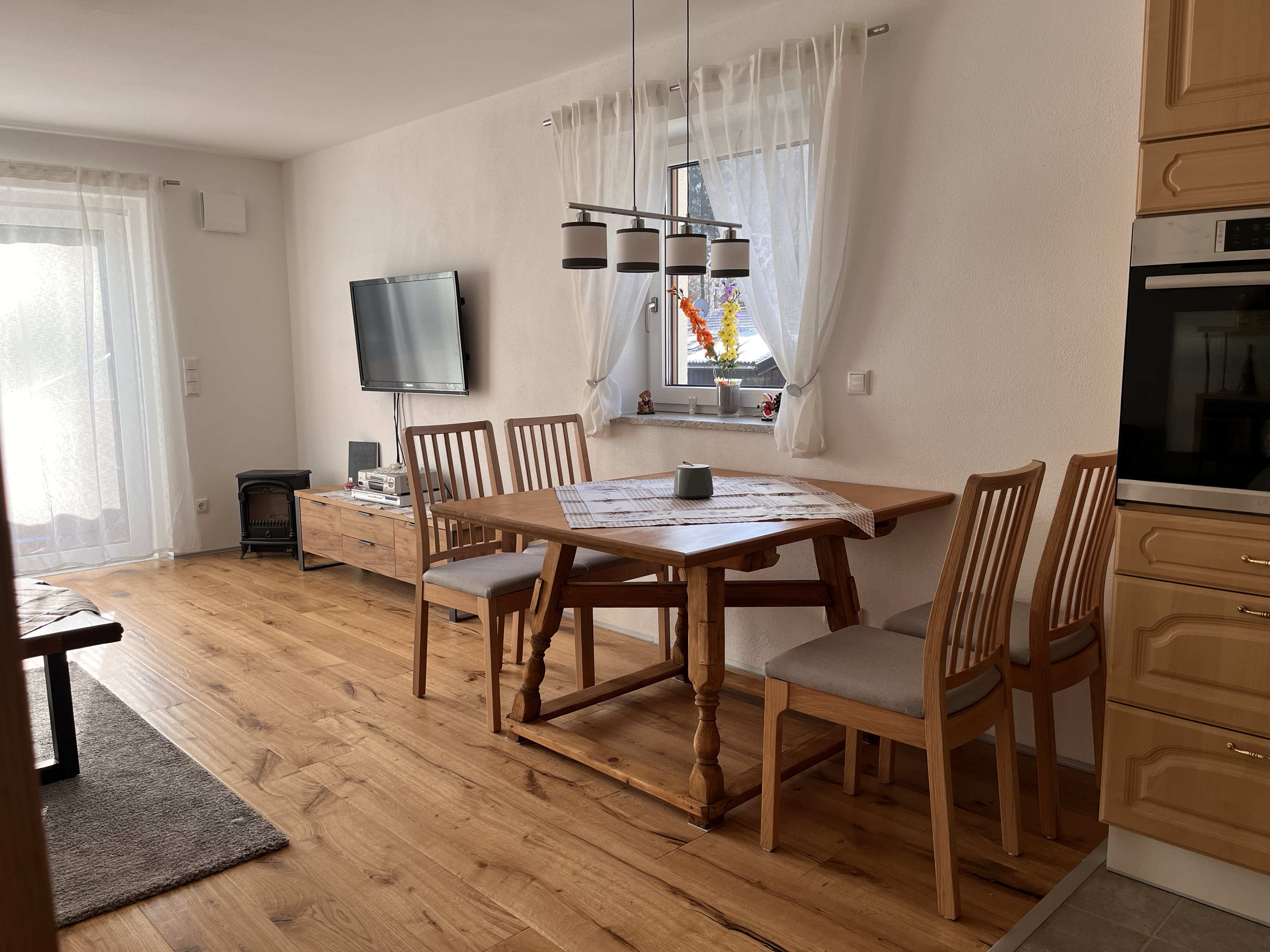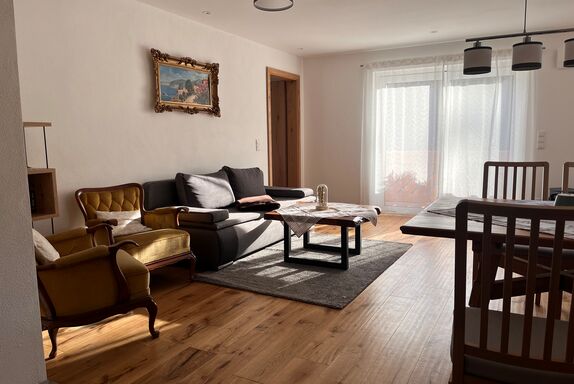 Unsere sarnierte 2-Zimmer-Ferienwohnung mit ca. 58 qm, verfügt über ein Wohnzimmer mit offener Küche, ein Schlafzimmer mit Boxspringbett und ein Badezimmer mit Badewanne/Dusche und WC. Der möblierte Süd- & Westbalkon lädt für gemütliche Stunden ein. Die Wohnung ist geeignet für ein bis vier Personen, da Aufbettung im Wohnzimmer (Schlafsofa) möglich ist. Idealer Ausgangspunkt für Rad- und Wandertouren.