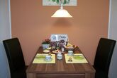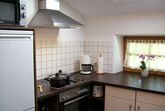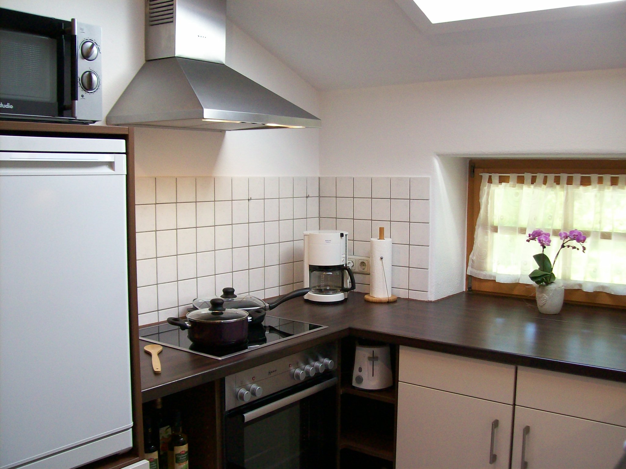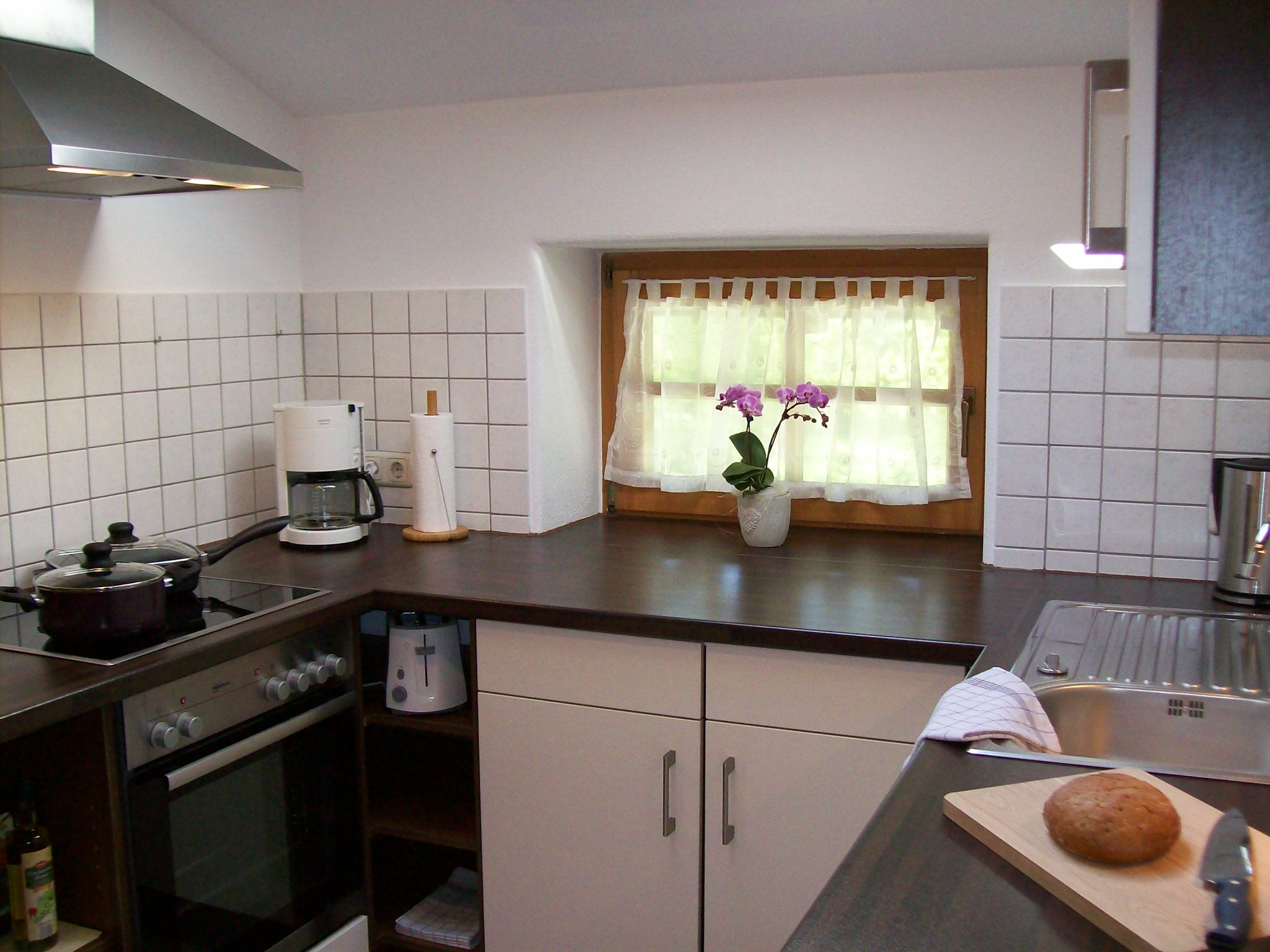 Auch die angrenzende Küche ist hell und freundlich eingerichtet und hat zwei Fenster. Ein großer Esstisch bietet bis zu 5 Personen bequem Platz zum Essen und Ratschen. Die Küche ist gut ausgestattet mit Kühlschrank (3***TK-Fach), Mikrowelle, Cerankochherd und Backofen, Wasserkocher, Kaffeemaschine und Toaster, sowie großzügig Geschirr, Töpfe, Pfannen und Besteck.
