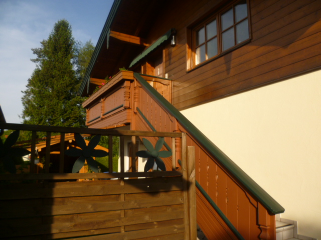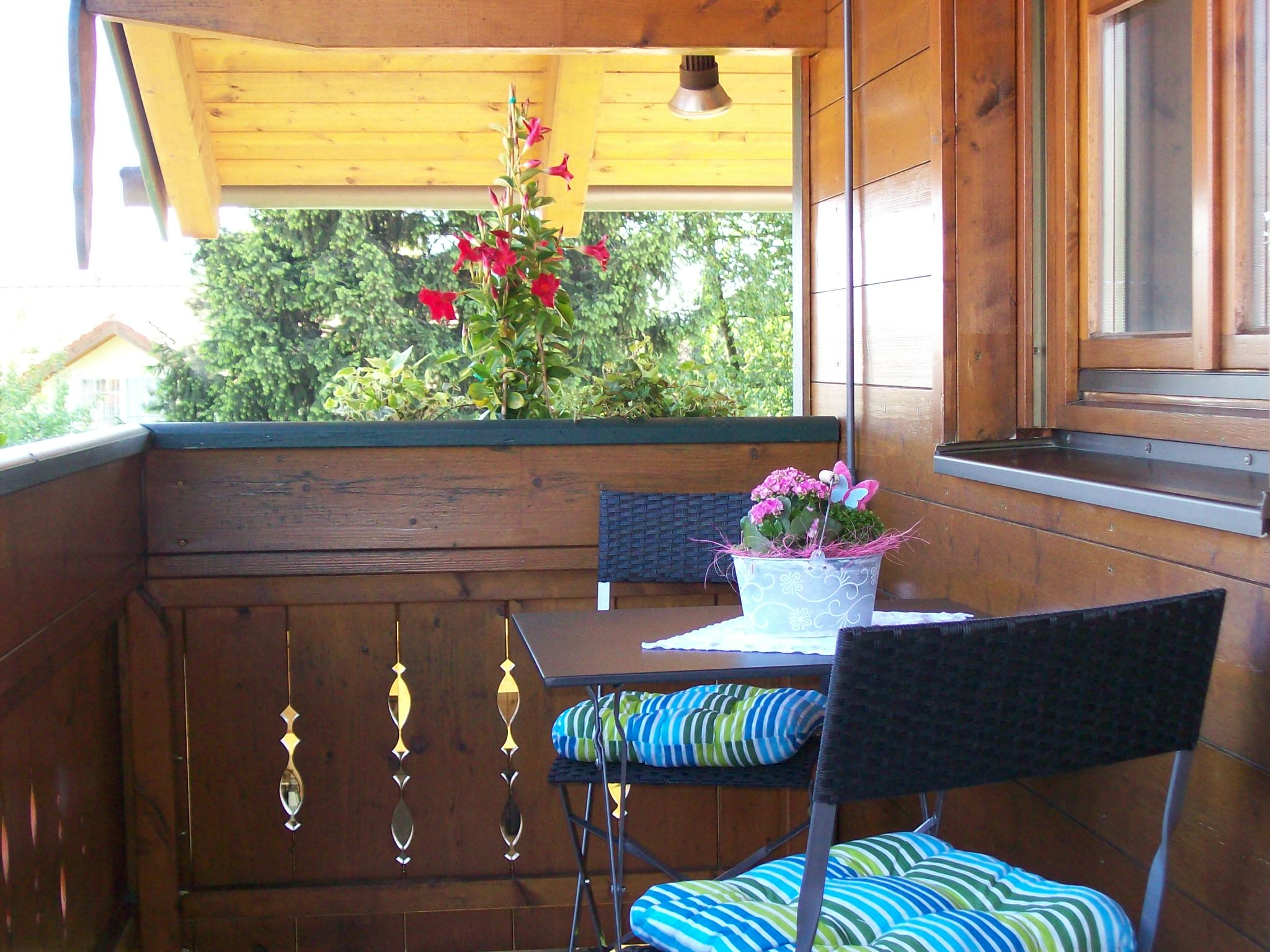Am Eingang der Wohnung erweitert sich der Treppenaufgang zum Balkon, der mit einem kleinen Essplatz ausgestattet wurde. Hier können Sie gemütlich sitzen, Brotzeit machen oder einfach den Tag ausklingen lassen.