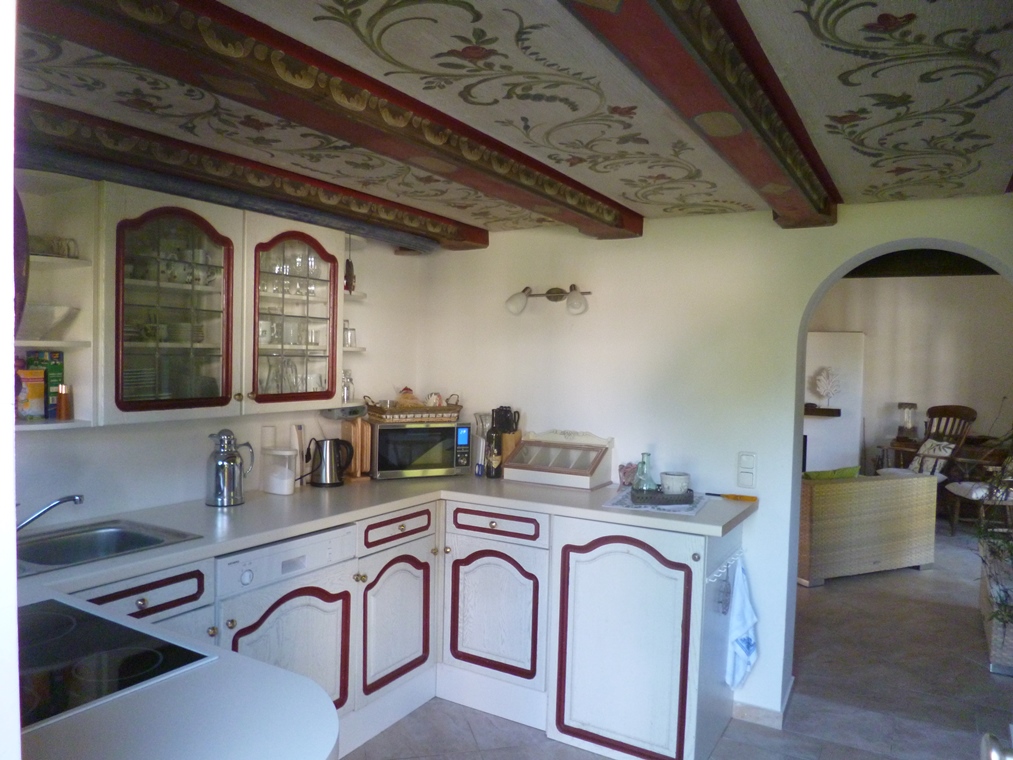 Eine gemütliche kleine Küche mit E-Herd, Backofen, Mikrowelle, Kühlschrank mit Gefrierfach, Geschirrspülmaschine, Kaffeemaschine, Wasserkocher lädt ein, Ihre kulinarischen Extrawünsche auch einmal selbst zu zubereiten.