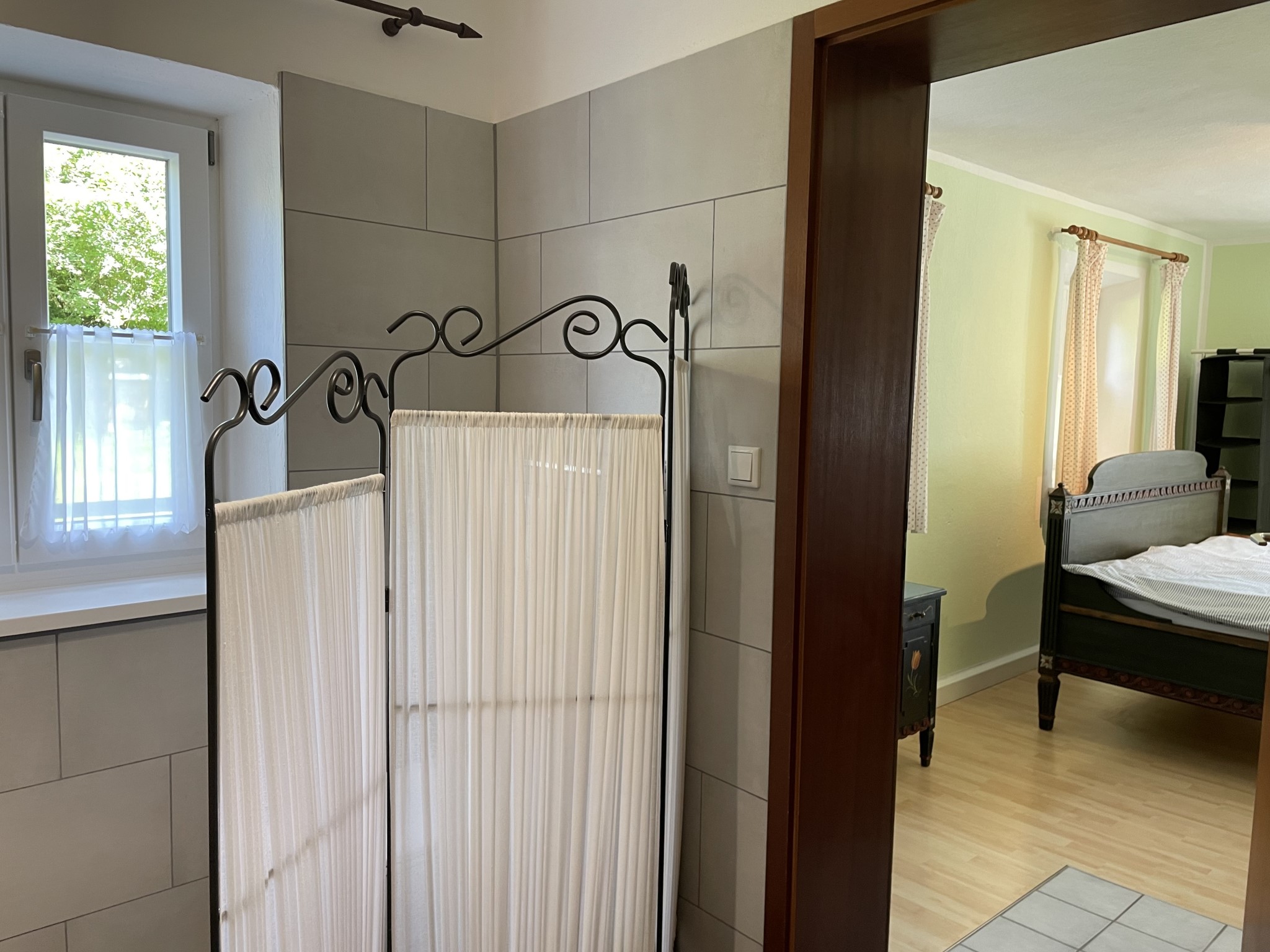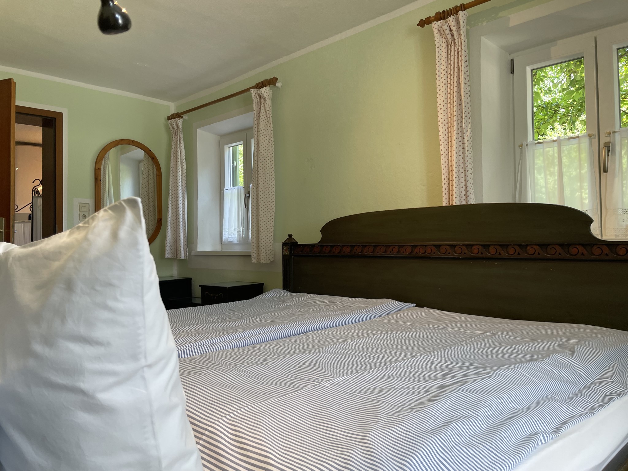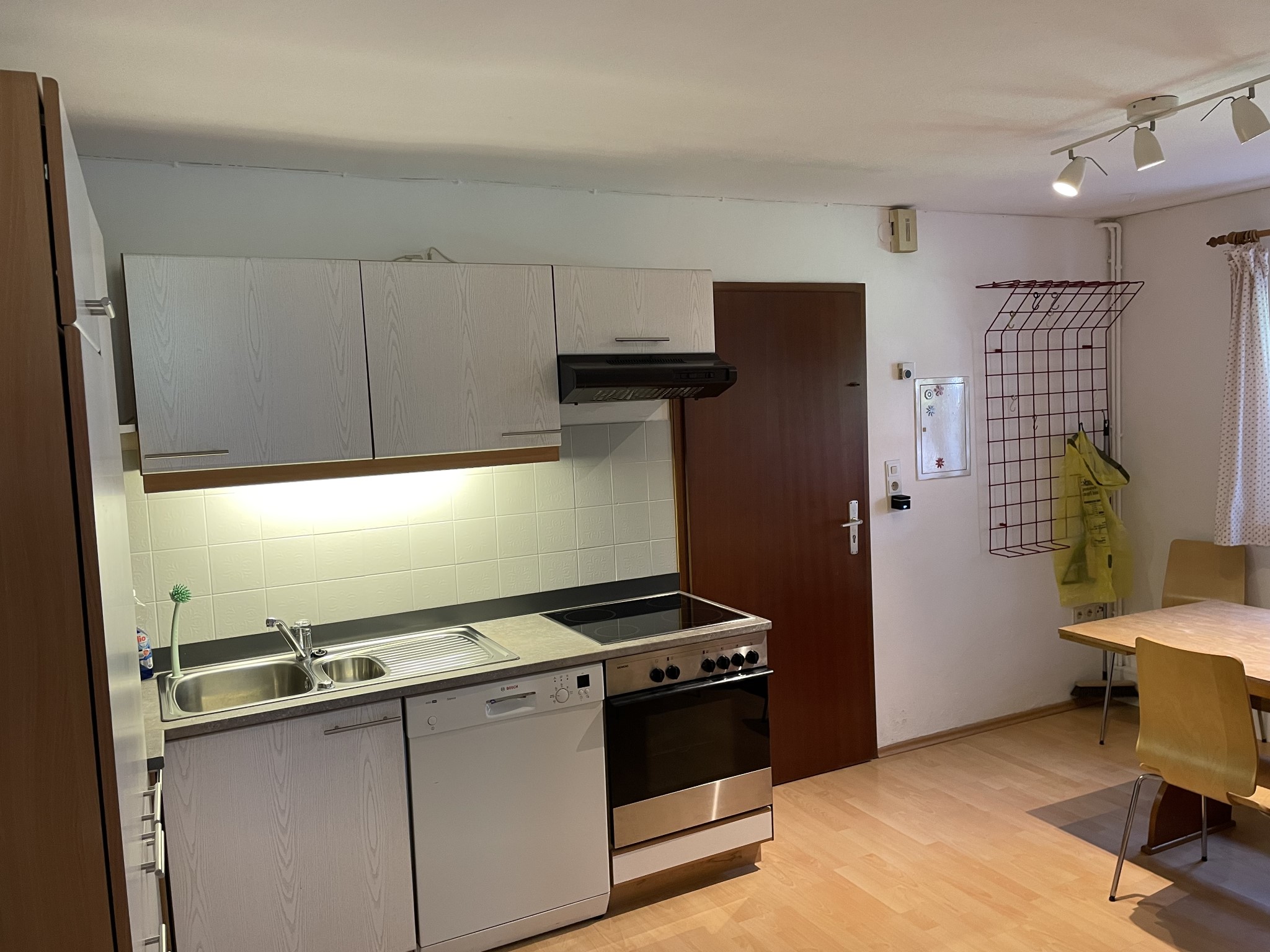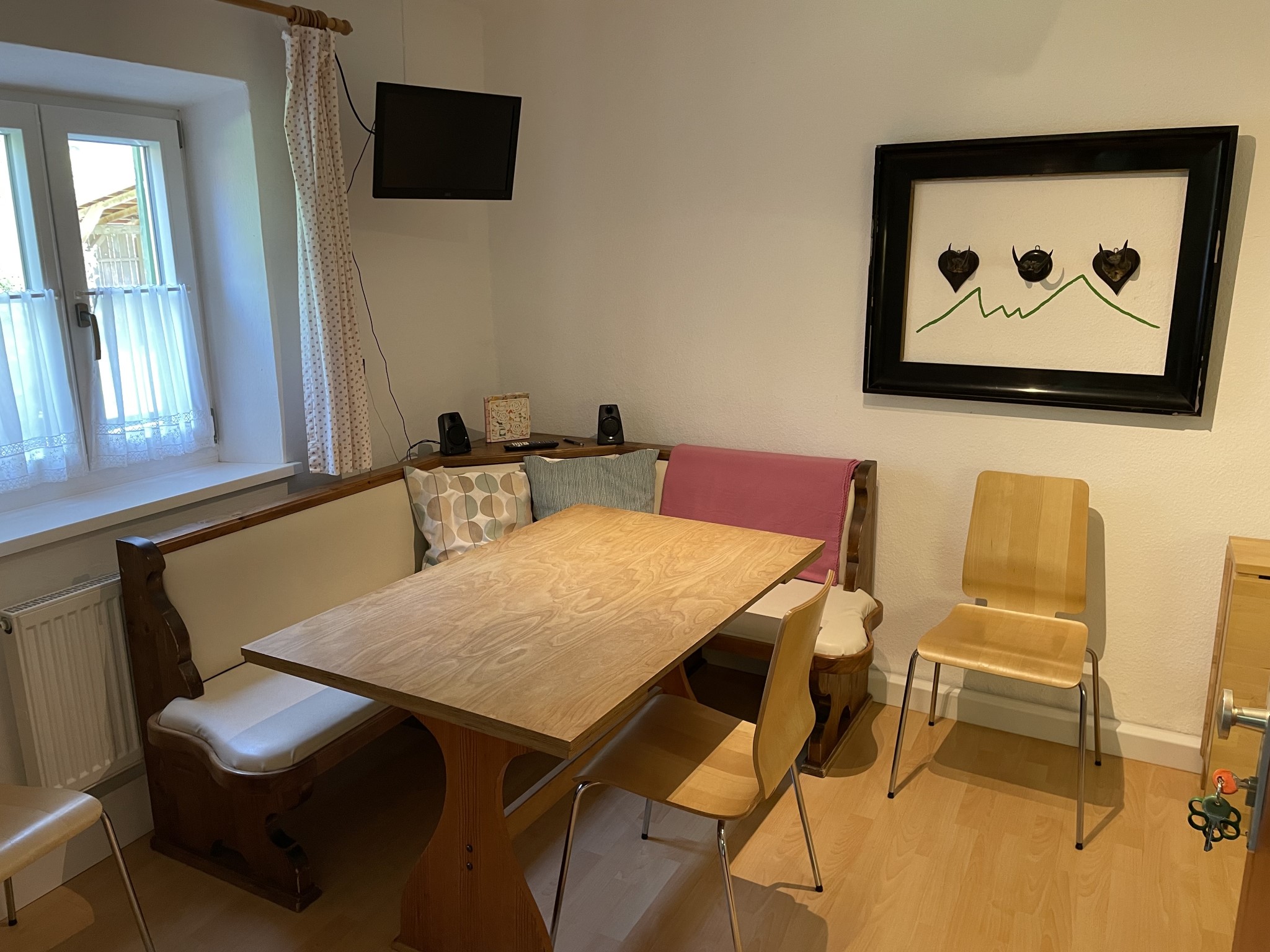 Es handelt sich um ein kleines Appartement, in dem es eine gemütliche Wohnküche gibt, in der eine komplette kleine Küche vorhanden ist. Auch Spülmittel, Spülschwamm, Bürste und Geschirrhandtücher sind vorhanden, so dass Sie Ihr Gepäck gering halten können. Das Bad ist neu mit Fenster in den Garten. Das Schlafzimmer ist klein und gemütlich mit einem originalen Bauernehebett mit Bauernmalerei, ebenfalls aus den 1920ern, so dass der Charme des alpinen Raumes und der Charakter des Hauses innen und außen stimmig sind. Es ist ein kleiner Ofen im Schlafzimmer, so dass bei Bedarf auch ein gemütlich prasselndes Feuer möglich ist (Holz vorhanden, kann dazu gekauft werden). Eine Zetralheizung ist vorhanden. Die Warmwasserbereitung findet über Boiler statt, welche über Solarstrom gespeist werden, wenn das Wetter es zuläßt und über regulären Stadtstrom gespeist werden können, sollte die Sonne auf sich warten lassen.