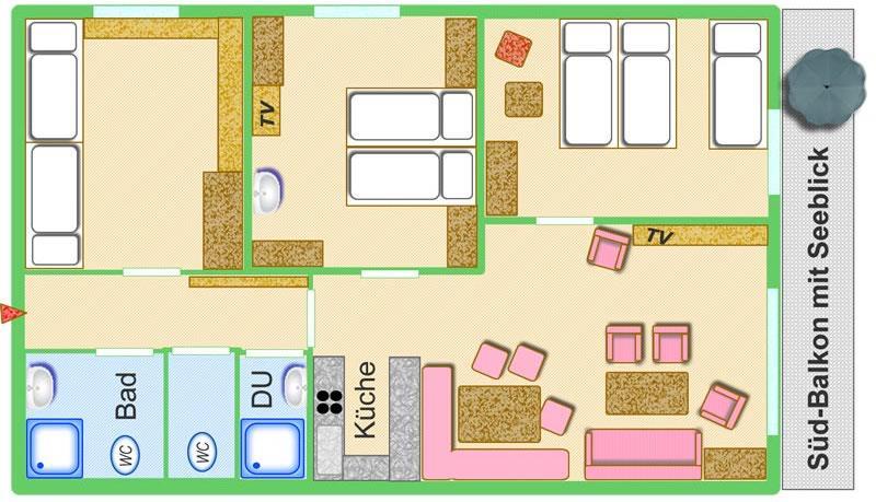 Ferienwohnung mit 3 Schlafzimmern, 2 WC, 2 x Dusche, ca. 100 m² für 4 - 9 Personen, Südbalkon mit Seeblick, Kochnische, Essecke und Wohnlandschaft