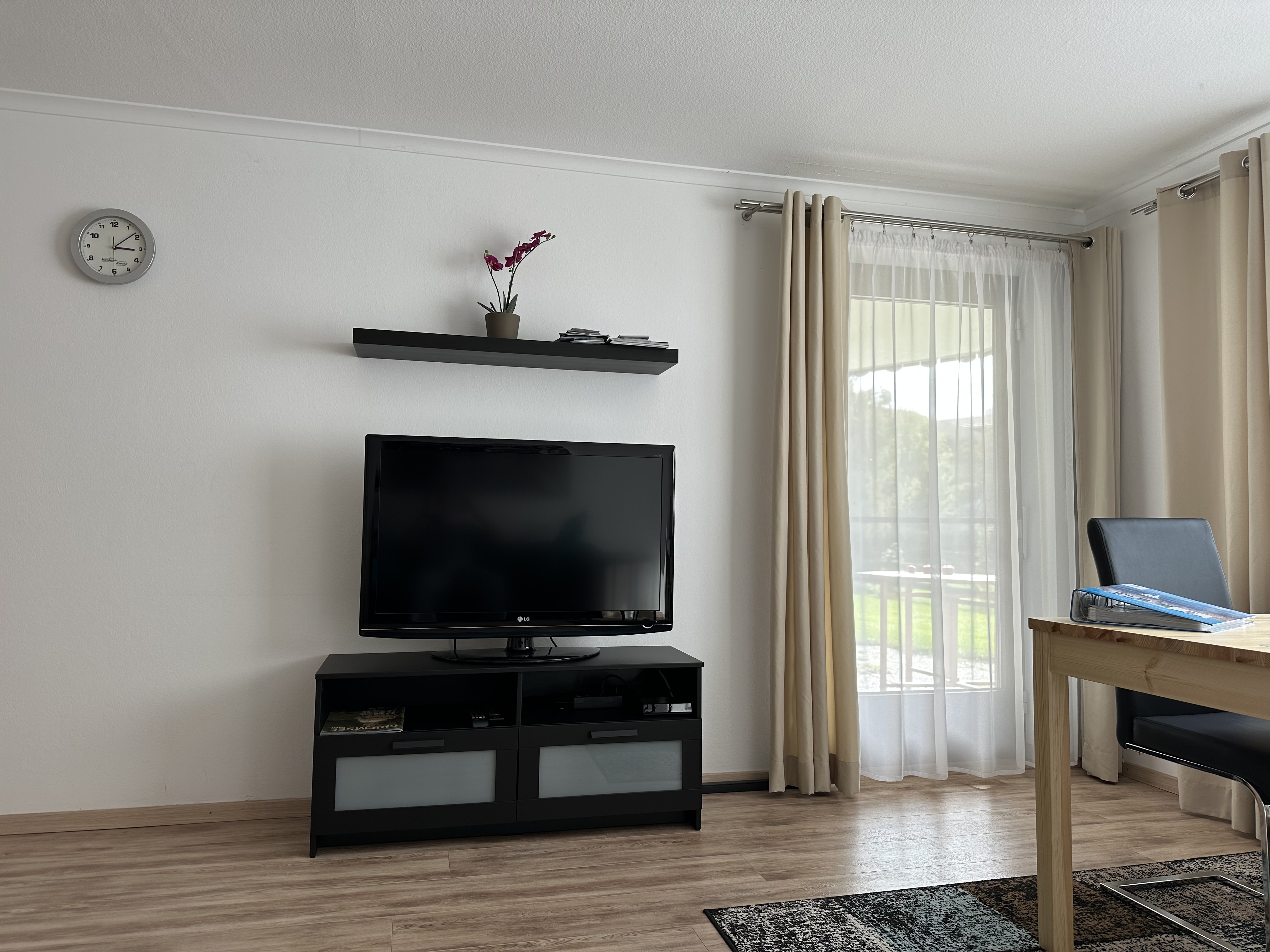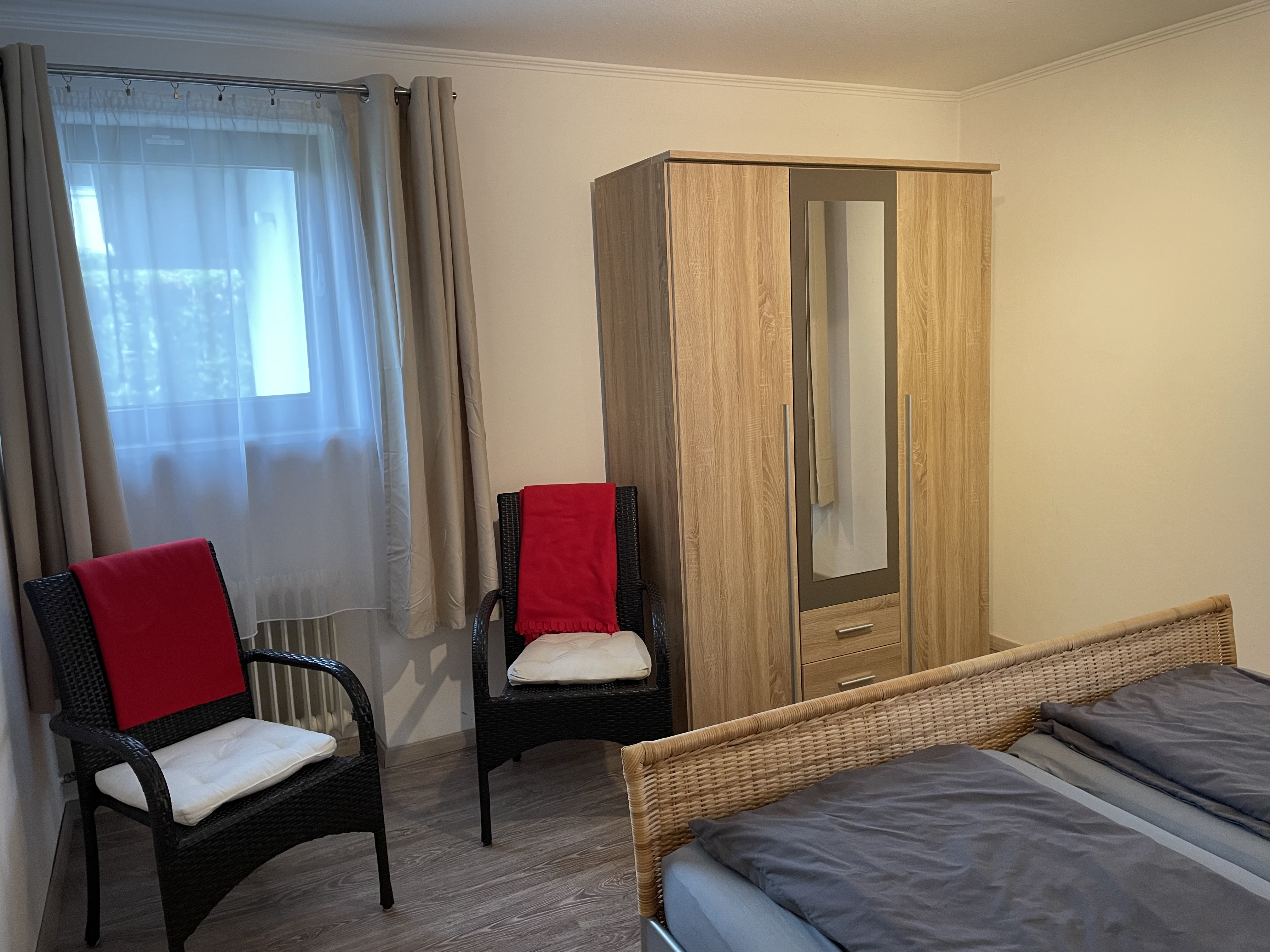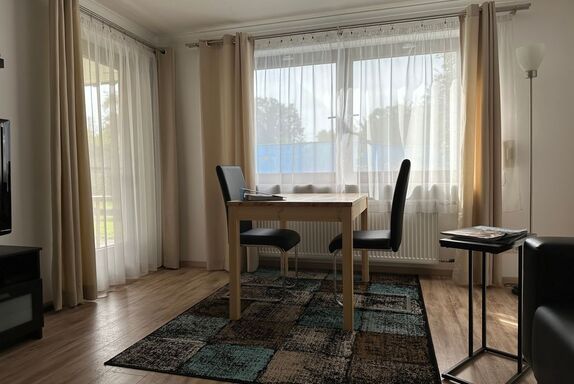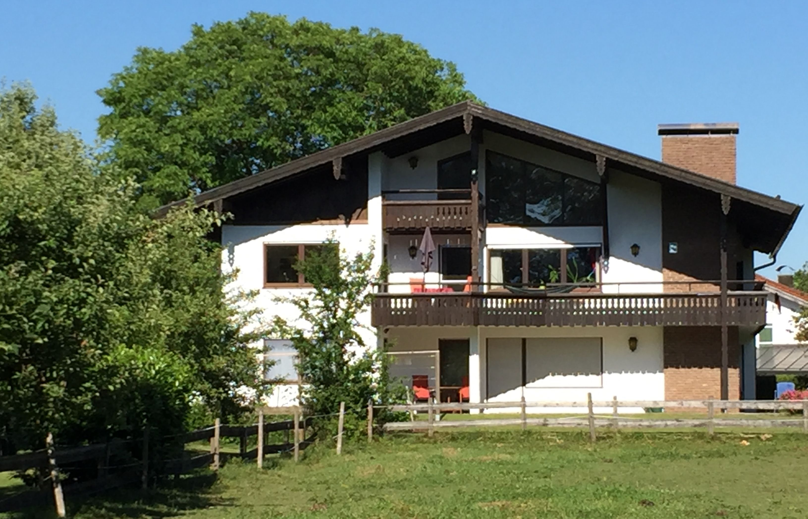 Die helle und modern eingerichtete 2-Zimmer-Ferienwohnung mit Terrasse befindet sich in einem ruhigen 2 Familienhaus. Das separate Schlafzimmer ist mit einem Doppelbett mit Nachtkästchen sowie einem Kleiderschrank ausgestattet. Im Wohn- und Esszimmer befindet sich eine Küche mit Backofen und 4-Platten Herd. Vom Essbereich aus haben Sie einen idyllischen Blick auf den Obst- und Bienenlehrpfad. Der Chiemsee glitzert durch das Laub der Bäume. Eine Couch mit TV ist ebenfalls vorhanden. Bettwäsche, Handtücher und Geschirrtücher werden gestellt. Im kleinen Duschbad gibt es u.a. auch einen Föhn. Für das Grillen auf der Terrasse steht ein Elektrogrill zur Verfügung. Haustiere sind nicht erlaubt. Nichtraucher Wohnung.