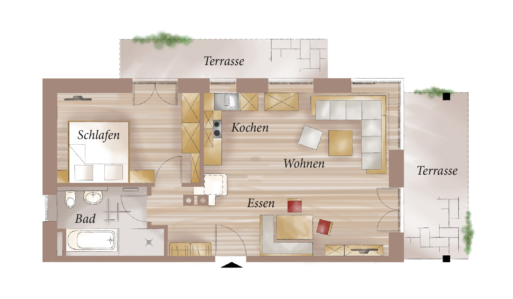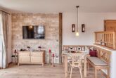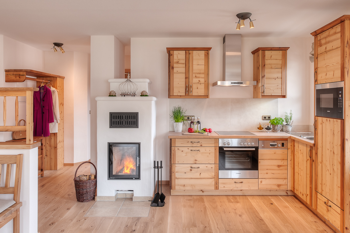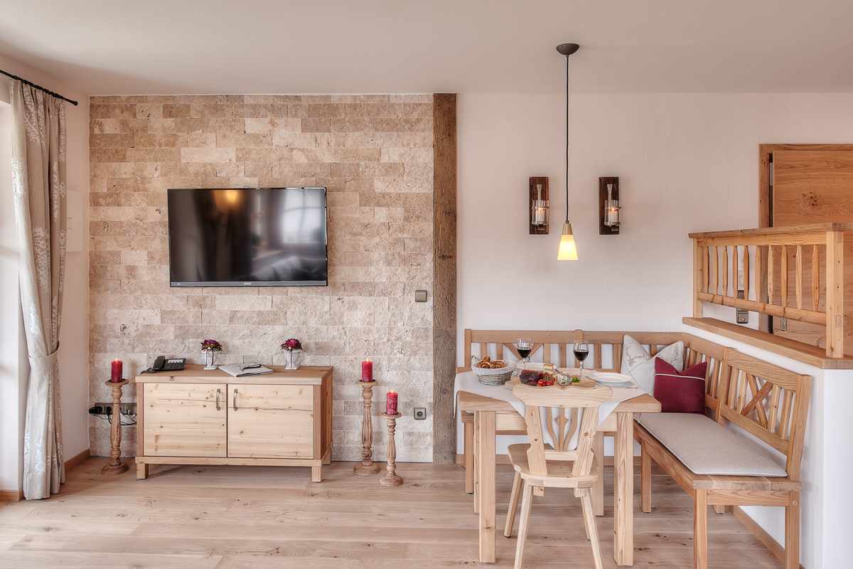 In der Ferienwohnung Jasmin (67m2) fällt es ganz leicht, den Alltag hinter sich zu lassen und im Urlaub anzukommen. Die Erdgeschosswohnung ist in alpenländisch-elegantem Stil gehalten und hochwertig eingerichtet. Wohnraum: Der großzügige, offene Wohnraum ist mit einer vollausgestalteten Küche in Altholzqualität, einem behaglichen Kachelofen zum selbst Anheizen, einer rustikalen Essgruppe und einem großen Wohnbereich mit gemütlichen, geschreinerten Polstermöbeln, Smart-TV und WLAN ausgestattet. Der Wohnbereich führt ebenerdig auf die Süd-Terrasse mit Grill hinaus. Von hier genießen Sie einen malerischen Blick auf das Alpenpanorama. Schlafzimmer:Das Schlafzimmer mit Doppelbett und TV ist zur Gänze aus Zirbenholz gearbeitet und sorgt, dankt der ätherischen Öle der Zirbe, für einen erholsamen Schlaf. Vor dem Schlafzimmer liegt die zweite Terrasse der Wohnung; östlich ausgerichtet lädt sie dazu ein, mit der Sonne in den Tag zu starten. Bad:Das Badezimmer mit alpinem Charme verfügt über eine Badewanne, eine Dusche, einen Waschtisch und ein WC. Lage & Sonstiges:Die Wohnung befindet sich in bester Lage: ruhig, aber dennoch zentral.Ihr Auto können Sie in der hauseigenen Tiefgarage mit angrenzendem abschließbaren Abstellraum parken.