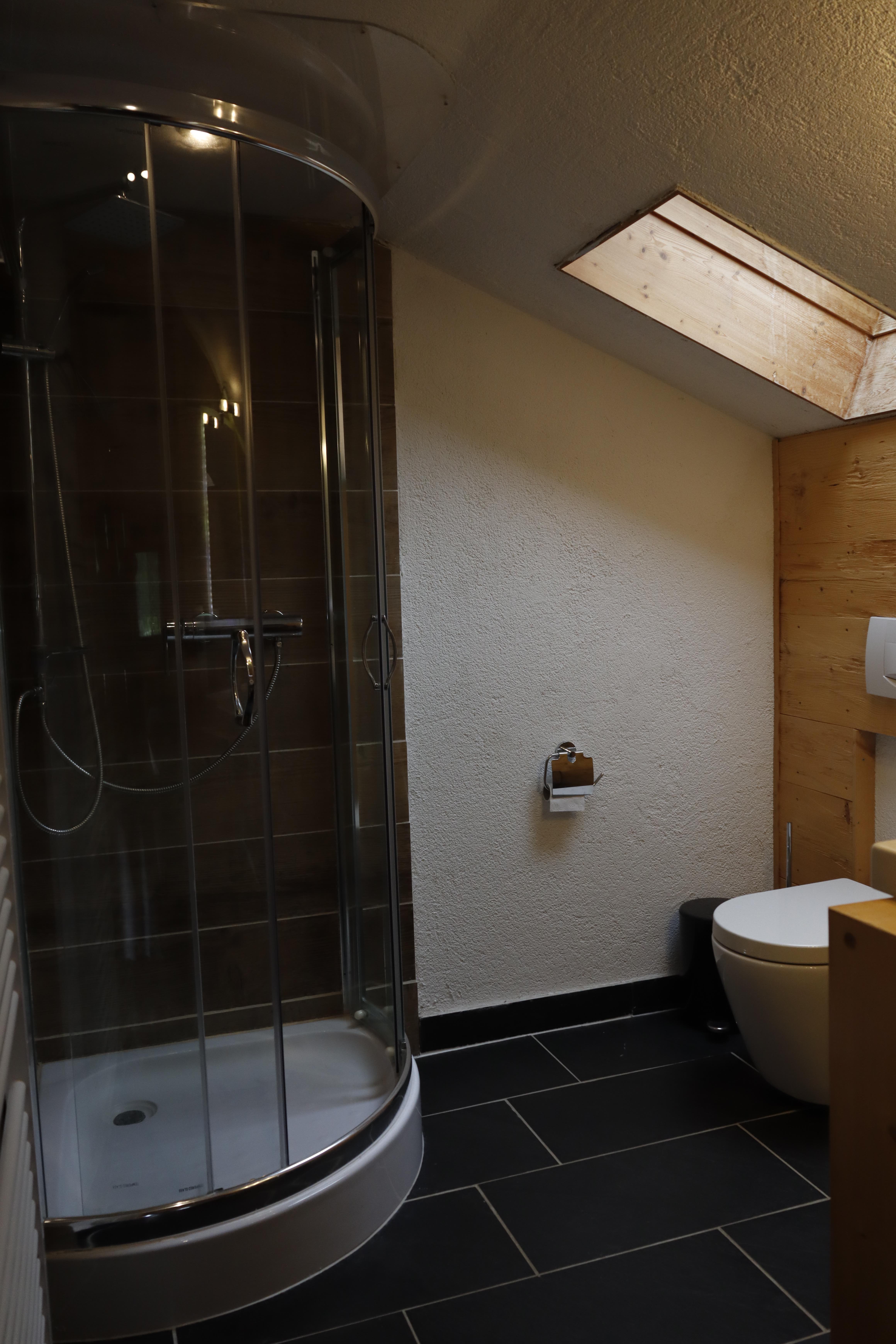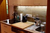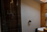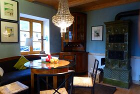 Der Eingang zu ihrer Ferienwohnung befindet sich unmittelbar neben dem Parkplatz am Haus. Über die umlaufende Holzterrasse kommen sie zur Eingangstür. Beim ersten Betreten des Flurbereichs fällt sofort die wunderschöne Holzstiege auf, welche zu den oberen Zimmern führt. Links neben dem Eingang finden sie den Wohn- bzw. Stubenbereich mit einem historischen Kachelofen, Tisch, Sofa ,TV sowie ausreichend Stühlen. Gleich gegenüber ist die Küche mit Tisch,Sitzbank und allen Einbaugeräten .Wasserkocher, Milchaufschäumer und Kaffeemaschine sind auch vorhanden.Durch die Küche geht es zum modern ausgestatteten Bad mit großer Dusche, Waschtisch und WC. Wenn sie nun der Treppe zum Obergeschoss folgen, finden sie dort noch zwei weitere Räumen.Ein behagliches Schlafzimmer mit Doppelbett, Kleiderschrank, Kommode und Sessel und ein kleineres Zimmer mit 2 Einzelbetten , Sofa und Schrank ausgestattet, runden die Ausstattung der vielseitig nutzbaren Ferienwohnung ab. Dieser Bereich wurde mit umfangreichen Holzkonstruktionen aufwendig restauriert. Die beiden Zimmer verfügen über ein besonders gemütliches Ambiente.