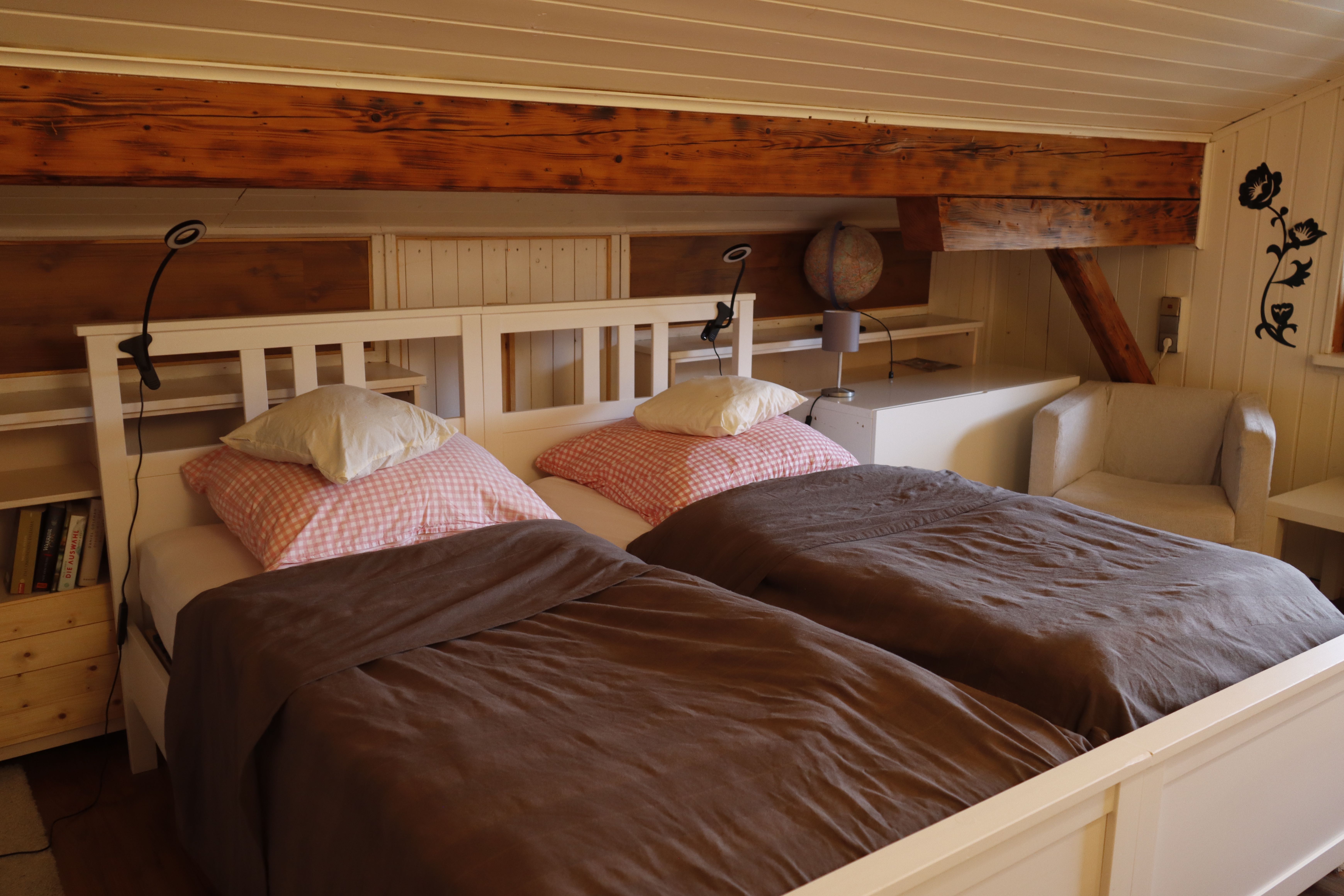 Über die Teppe erreicht man das Dachgeschoß mit 2 Einzelbetten ,Balkon und einem eigenen Bad, mit Dusche, Waschtisch und WC.. .WLAN ist natürlich auch vorhanden