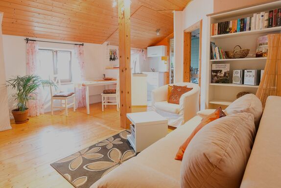 Es erwartet Sie im 1G unseres Hauses eine liebevoll eingerichtete Nichtraucher-Wohnung für 2 Personen, in der Sie alles finden um einen entspannten Urlaub zu verbringen.Eingeteilt ist die Wohnung in einen großen Wohnraum mit Kochnische, einem Schlafzimmer und einenm Bad.Im Wohnzimmer befindet sich eine Sitzecke mit ausziehbarer Couch und einem gemütlichen Sessel.Wenn der Wettergott es mal nicht so gut mit Ihnen meint, stehen ein Fernseher, Radio, CD-Player, Spiele und eine kleine Bücherei zu Ihrer Verfügung wo Sie viele Reise- und Kulturführer, Rad- und Wanderführer für Ihre Tourenplanungen finden.Selbstverständlich haben Sie bei uns auch kosteloses WLAN.Ein Laptop wird bei Bedarf gestellt.Eine Kochnische mit 2-Plattenherd, Kühlschrank, Kaffeemaschine, Wasserkocher, ausreichend Geschirr und Töpfe sind vorhanden.Von Ihrem Essplatz aus haben Sie einen wunderbaren Blick auf die Grassauer Berge.Das Bad ist mit einer großen Dusche ausgestattet und es sind ausreichend Dusch- und Handtücher, sowie ein Fön, vorhanden.Im Schlafzimmer befindet sich ein bezogenes Doppelbett und ausreichend Stauraum für Ihre Kleidung. Vom Schlafzimmerfenster aus, sehen Sie den Grassauer Kurpark, welcher unmittelbar an unser Haus grenzt. Auf unserer Sonnenterrasse, direkt an unserem Gartenteich, können Sie die Seele baumeln lassen. Kissen, Liegen, Sonnenschirme und ein Grill sind vorhanden um nach Ihren Ausflügen zu relaxen.