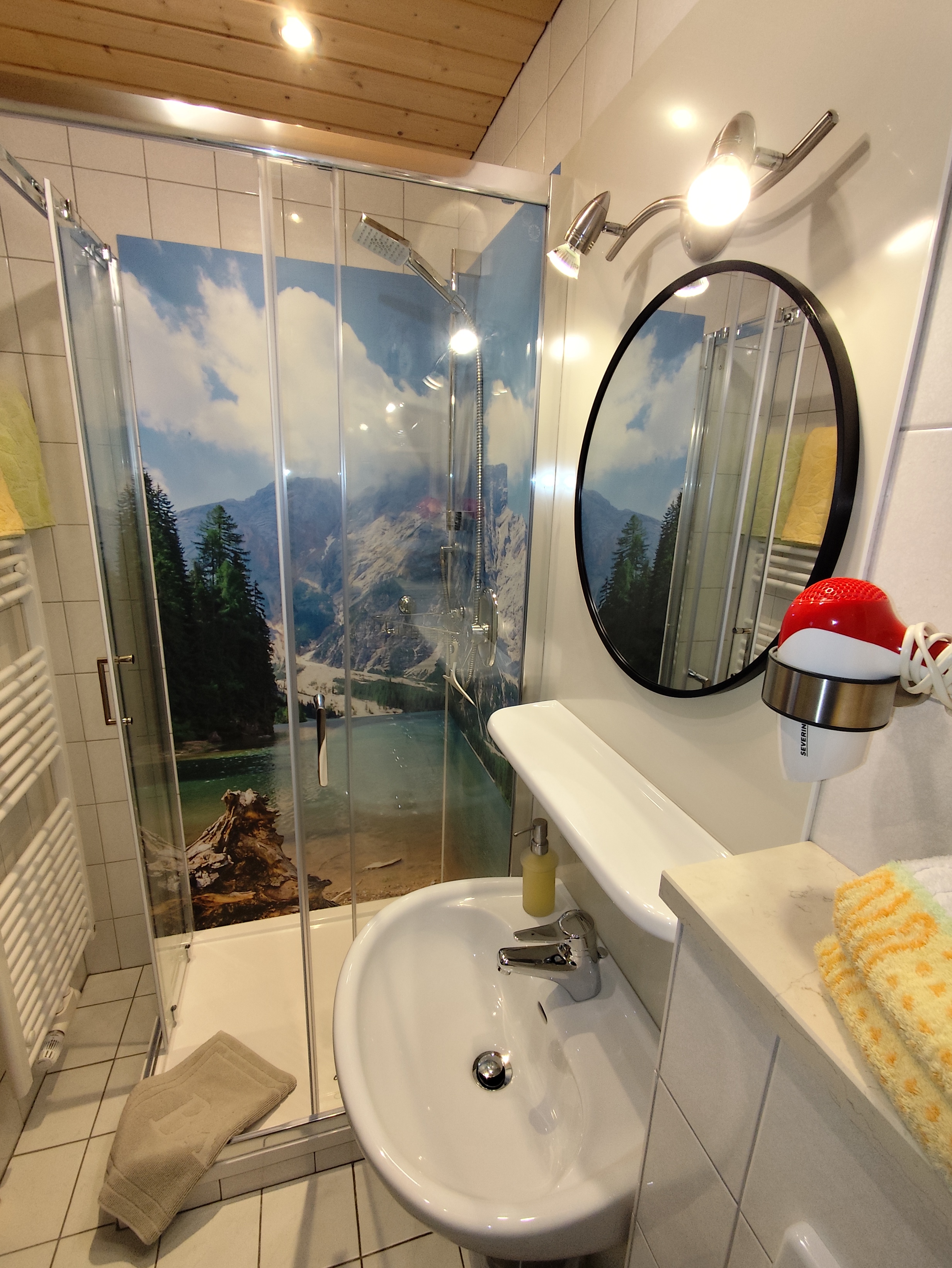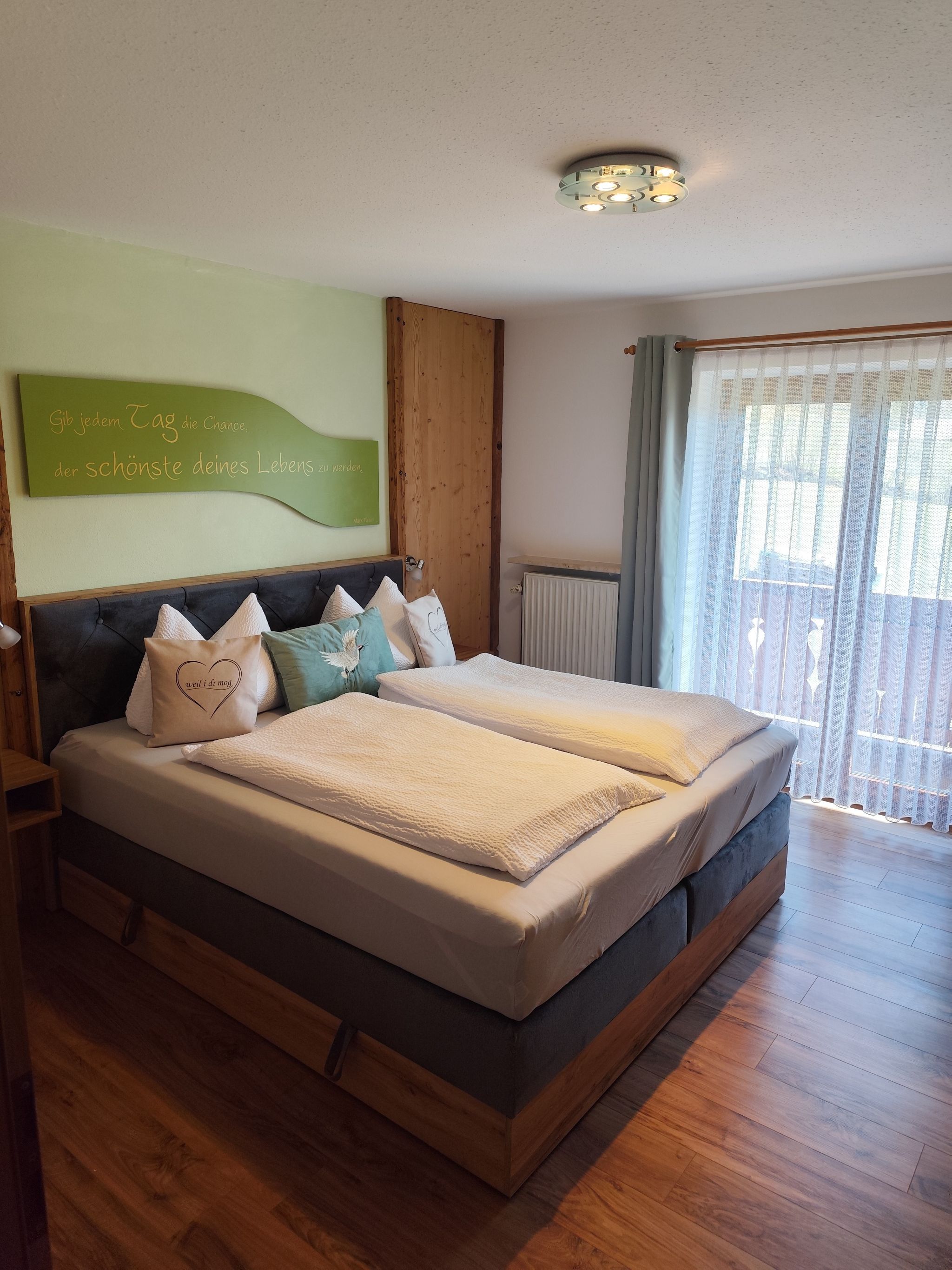 Unsere neue, komfortable Ferienwohnung Blaueis ist gemütlich im Landhausstil eingerichtet und bietet Ihnen vom großen Balkon einen traumhaften Rundumblick (Süd-Ost-West) auf das gesamte Bergpanorama. Im Wohnzimmer befindet sich eine gemütliche Couch, Sat-TV, Radio, CD-Player, eine abgeteilte, hochwertig ausgestattete Küche mit Geschirrspüler, 4-Platten-Ceranfeld, Backofen, usw. sowie ein einladender Essbereich. Darüber hinaus verfügt die Wohnung über ein Schlafzimmer mit neuen Boxspringbetten, Diele und neue Dusche/WC. Die gesamte Wohnung ist mit wischbaren Böden ausgestattet.