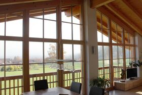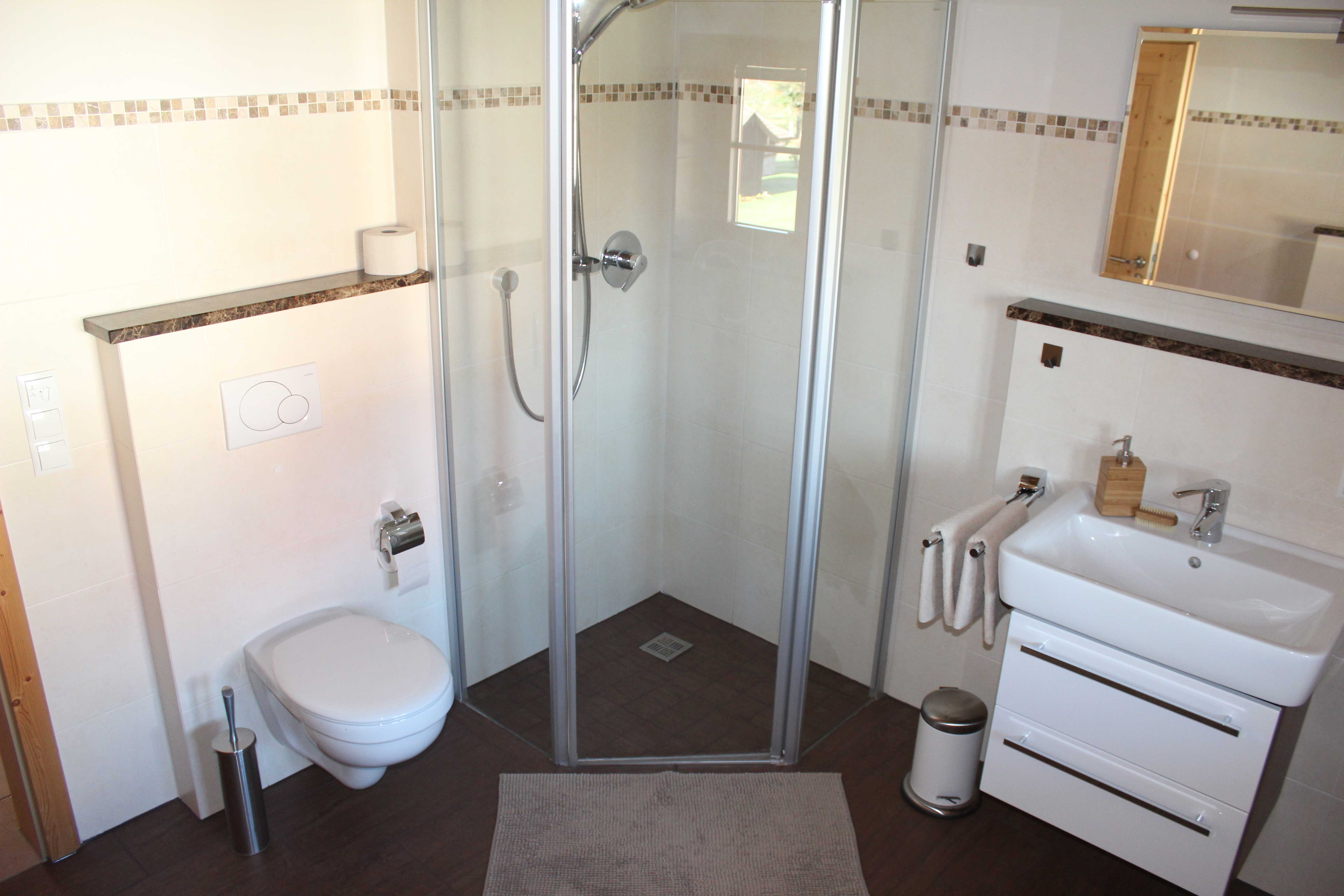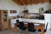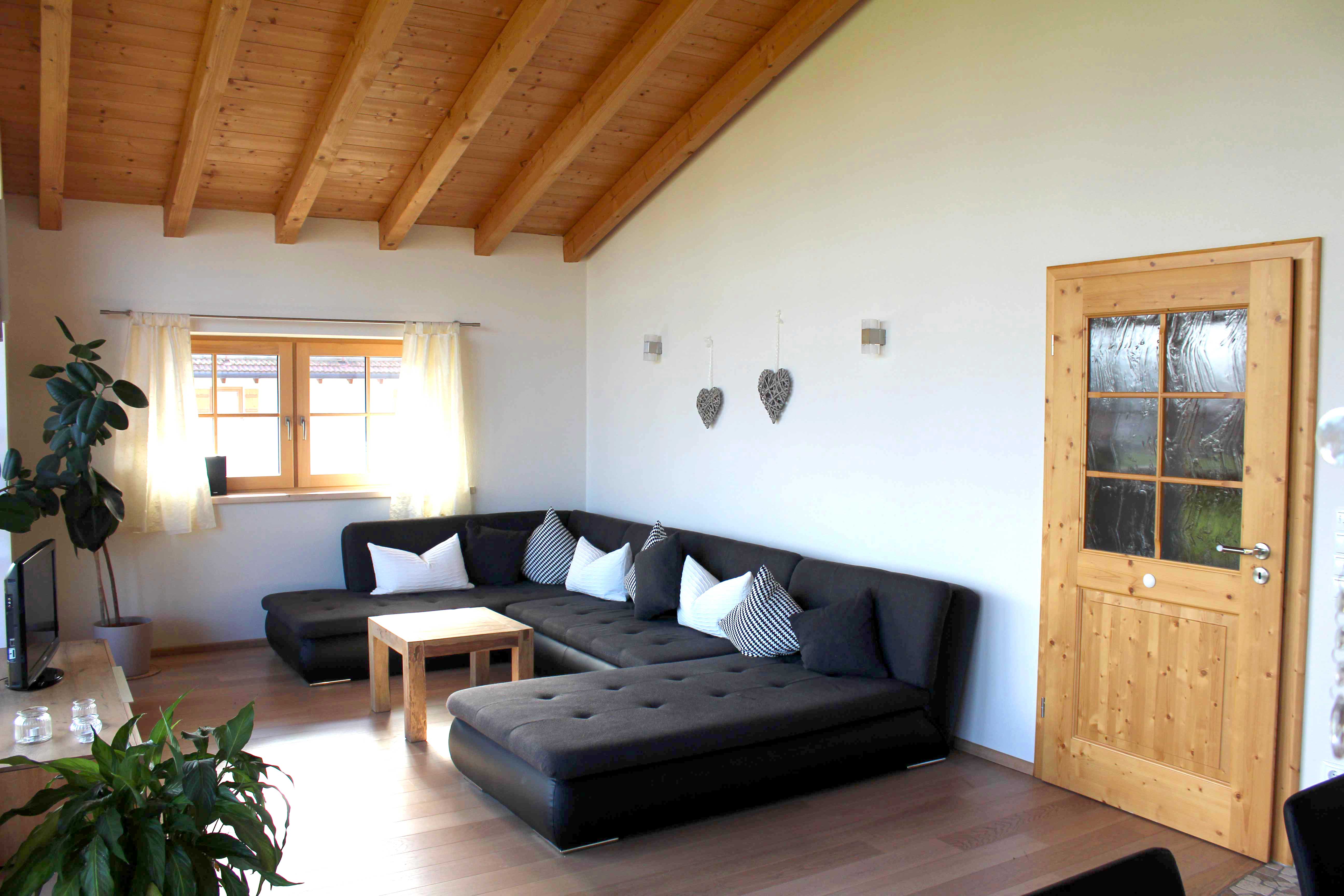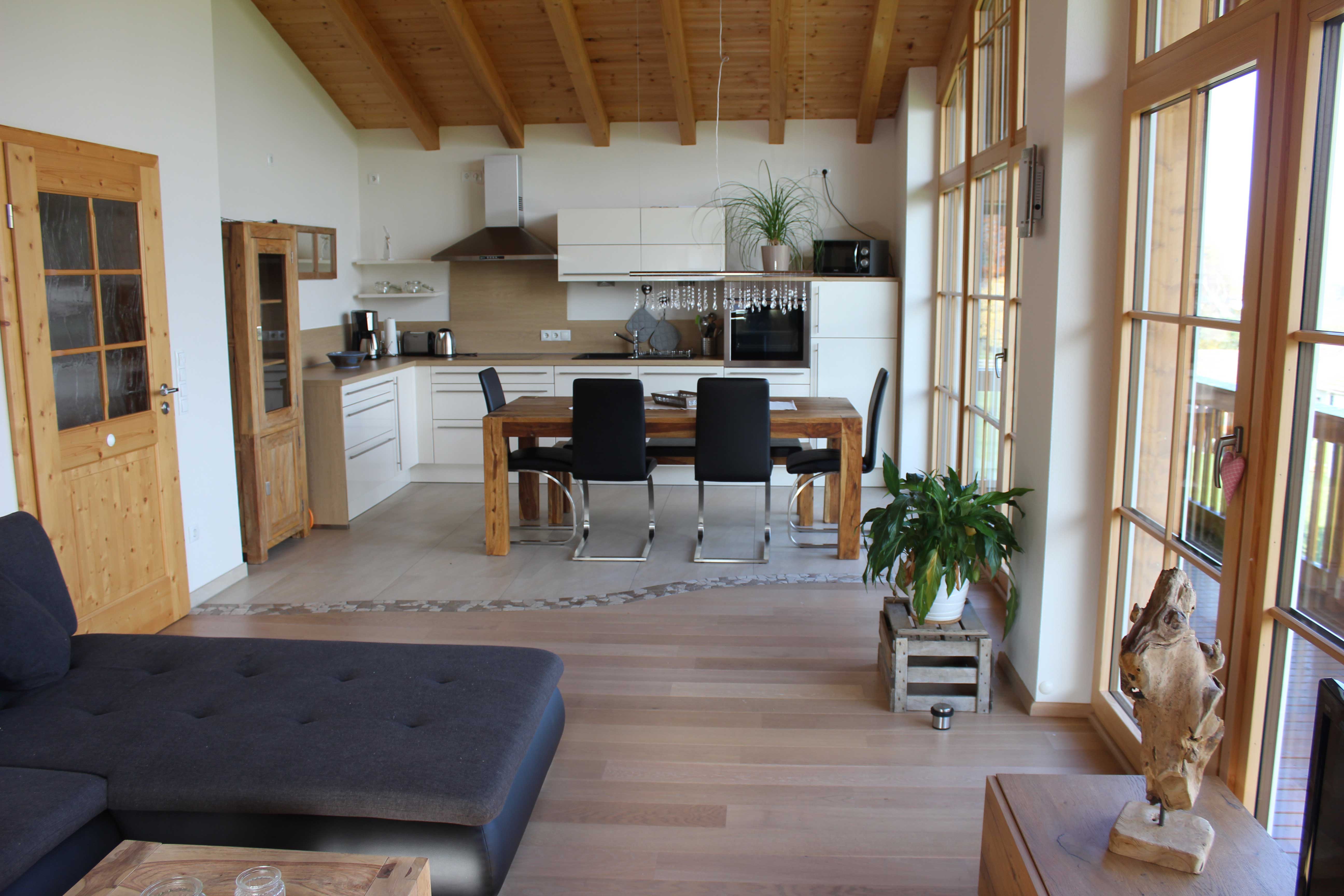 Ruhige gemütliche Neubauwohnung im ersten Stock mit Sichtdachstuhl. Wohn-Küche mit großem Panoramafenster und freiem Bergblick. Balkon mit Gartenmöbeln und herrlicher Aussicht auf die idyllische Bergwelt.
