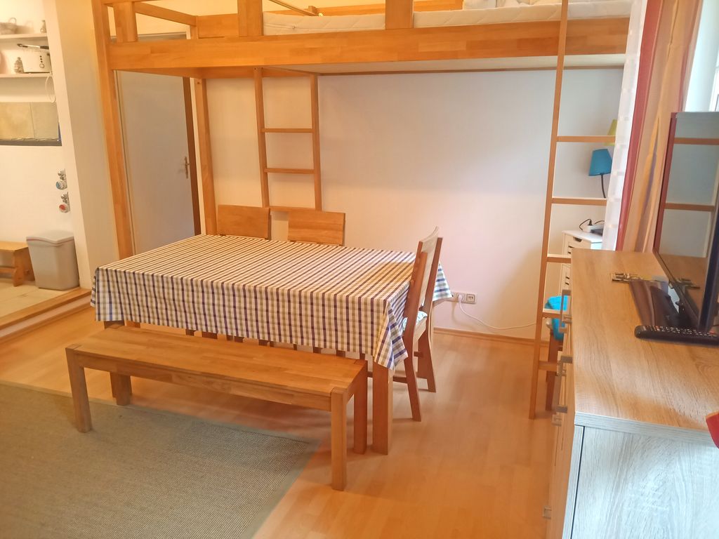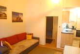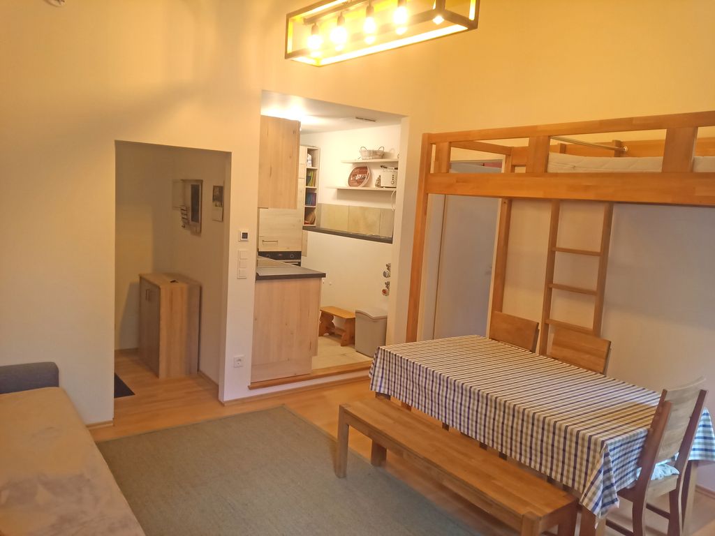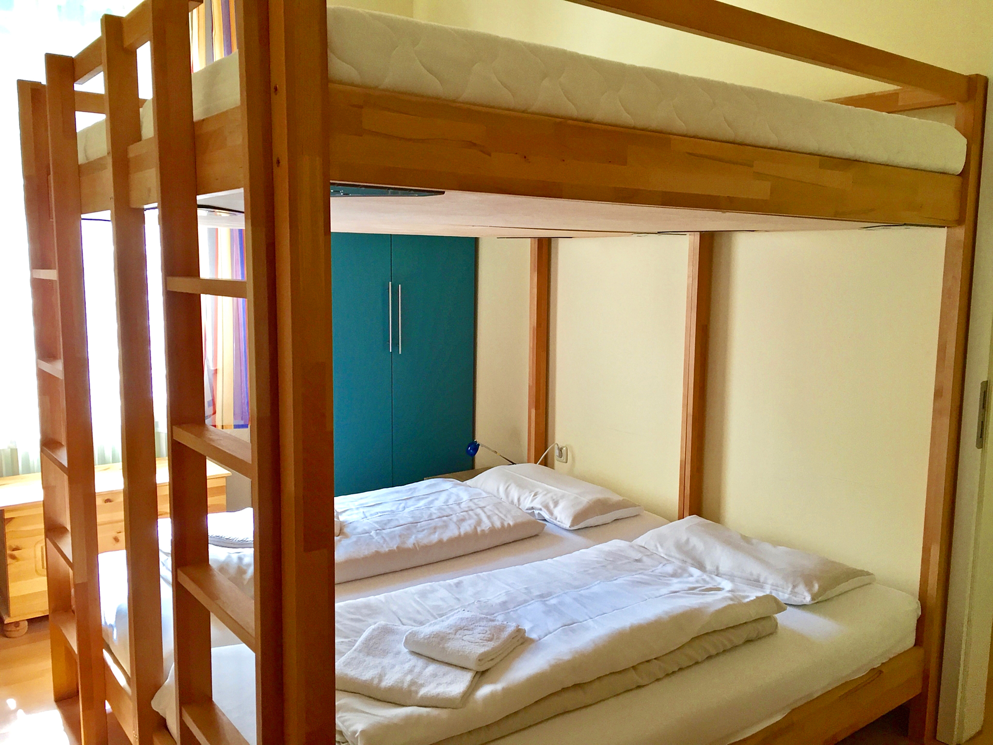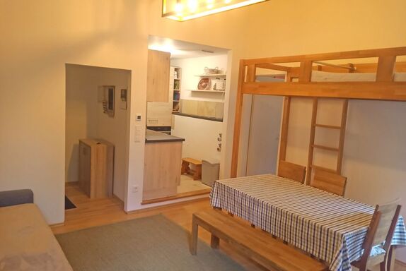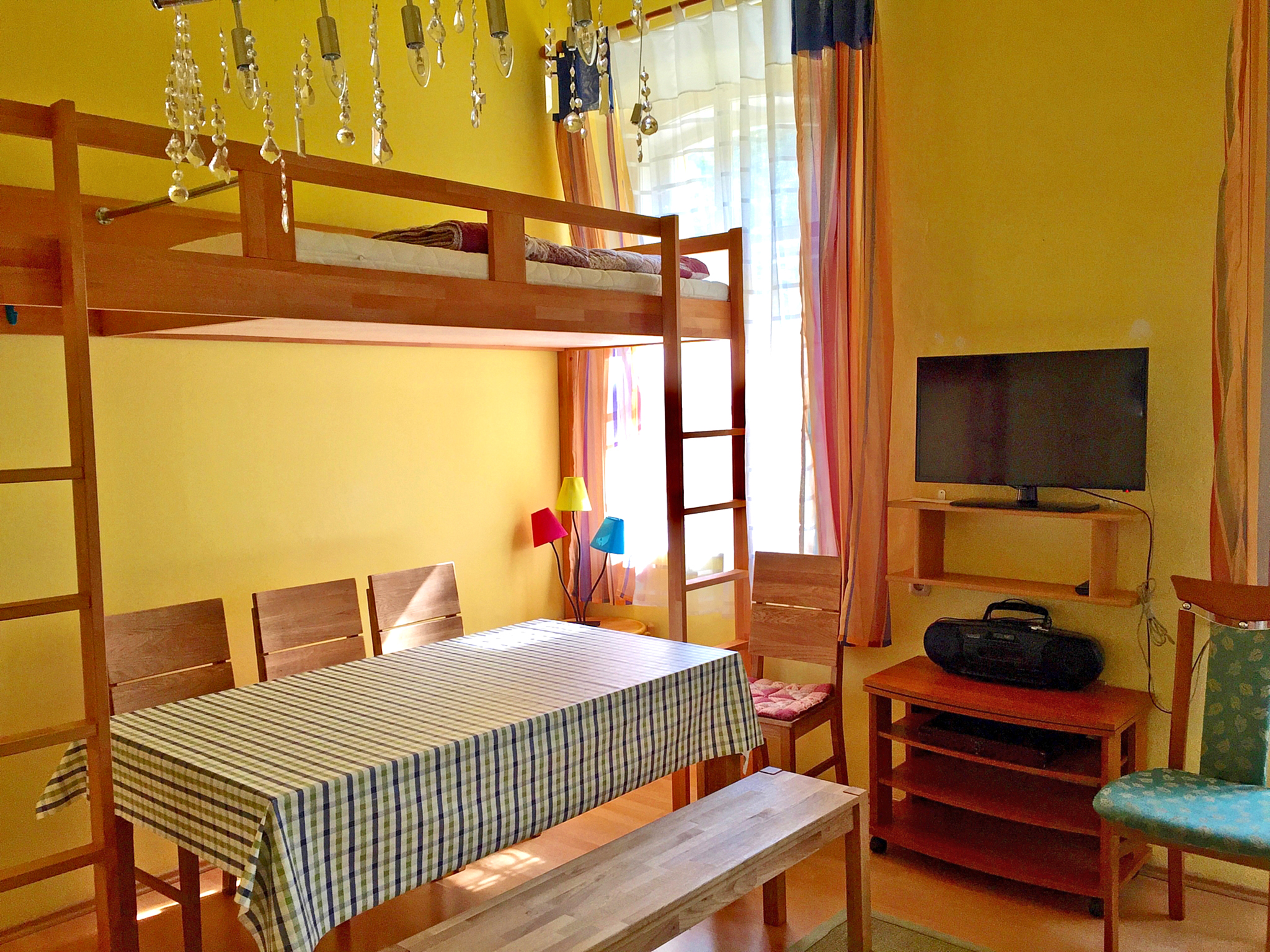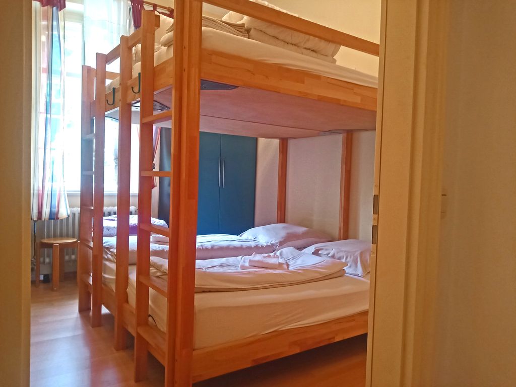 Helle, gemütliche Nichtraucher Ferienwohnung 48 qm im 1. Stock mit Balkon bis 5 Personen. Separates Schlafzimmer mit Doppelbett und Doppelbett-Hochbett/Stockbett über zwei Leitern. Wohn-/Schlafzimmer mit Schlafcouch für 1 Pers. und Einzel-Hochbett/Stockbett über eine Leiter (gerne kann zum Schlafen das Stockbett oder die Schlafcouch genutzt werden), SAT-TV, kostenloses WLAN, kleiner Abstellraum und separater Küche. Badezimmer mit Dusche und WC. Ein Hund darf gegen Aufpreis gerne mitgebracht werden. Bedingt Barrierefrei, für Rollstuhlfahrer leider nicht möglich, mit Gehbehinderung durch Lift im Haus möglich.