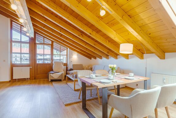 Komfortable Zwei-Raumwohnung mit einem separatem Schlafzimmer und einem Badezimmer. Die Wohnung verfügt über eine Badewanne, Dusche und ein WC. In der Küche ist ein Geschirrspüler, ein Herd und Backofen, eine Mikrowelle und ein Kühlschrank vorhanden. Die Wohneinheit liegt im Dachgeschoss. Außerdem gibt es ein Radio, Soundbar und einen OLED- Fernseher. Es gibt kostenfreies W-lan. Waschmaschine und Trockner sind ebenfalls vorhanden.