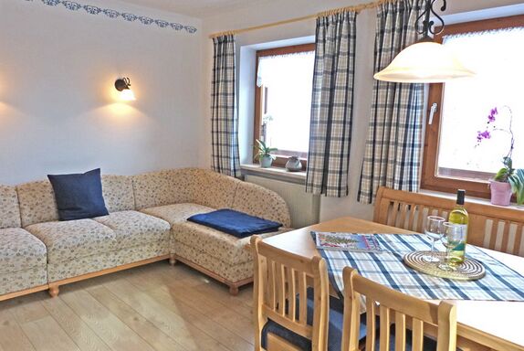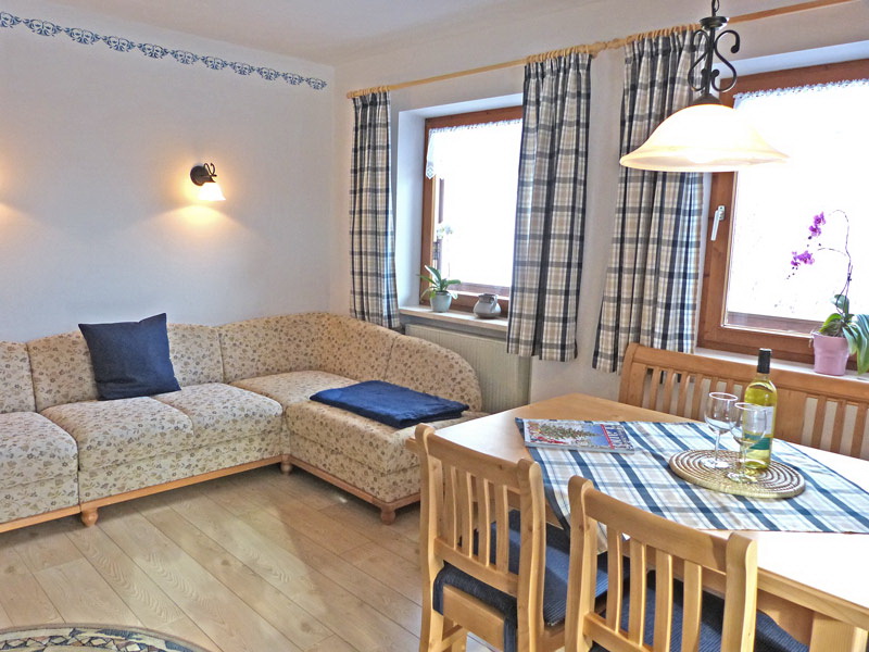 Unsere neue, großzügig und liebevoll im Landhausstil eingerichtete Ferienwohnung befindet sich im Obergeschoss unseres Hauses und bietet Ihnen vom Süd-Ost-Balkon einen traumhaften Blick auf die Ramsauer Berge und ins Ramsauer Tal. Zur Wohnung gehören eine Diele mit Garderobe, ein gemütliches Wohnzimmer mit großer Eckcouch, Sat-TV, CD-Player sowie ein einladender Essplatz. In der separaten Wohnküche befindet sich eine hochwertig ausgestattete Einbauküche mit Geschirrspüler, 4-Platten-Ceranfeld, Backofen usw. sowie nochmals ein gemütlicher Essplatz. Desweiteren verfügt die Wohnung über ein Doppel-Schlafzimmer, 1 Einzel-Schlafzimmer; Dusche/WC mit Duschkabine und Eckbadewanne. Zusätzlich befindet sich in der Wohnung ein 2. WC. Die gesamte Wohnung ist, mit Ausnahme der Diele, mit wischbaren Böden i Belegung der Wohnung mit 2 Personen steht Ihnen 1 Schlafzimmer zur Verfügung, gerne können Sie jedoch das 2. Schlafzimmer nach Absprache und gegen Aufpreis zusätzlich i der Wohnung handelt es sich um eine Nichtraucher-Wohnung, deshalb bitten wir unsere Gäste ihre Zigarette auf dem offenen Balkon zu genießen. Für unsere Gäste steht eine E-Tankstelle zur Verfügung, der Tankvorgang wird nach Verbrauch abgerechnet.