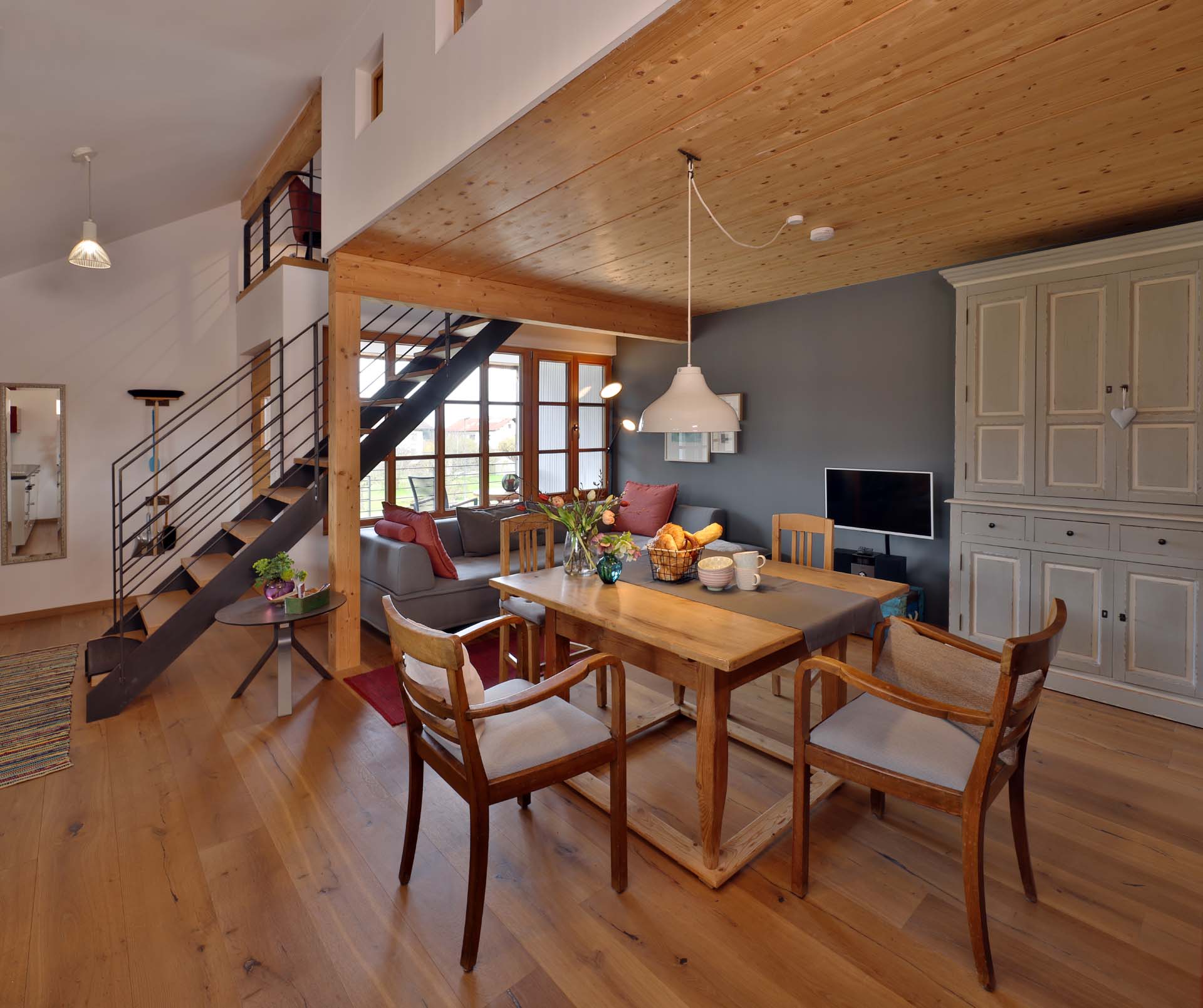 Wohnen Sie in unserer komfortablen Ferienwohnung, die sich über 64 Quadratmeter und zwei Etagen erstreckt und ideal für zwei Personen konzipiert ist. Das Apartment besticht durch ihre hochwertige Ausstattung und den großzügigen Wohnbereich. Eine Treppe führt Sie in das obere Stockwerk, wo das Schlafzimmer mit einer einladenen Galerie zum Entspannen und Relaxen auf Sie wartet.
