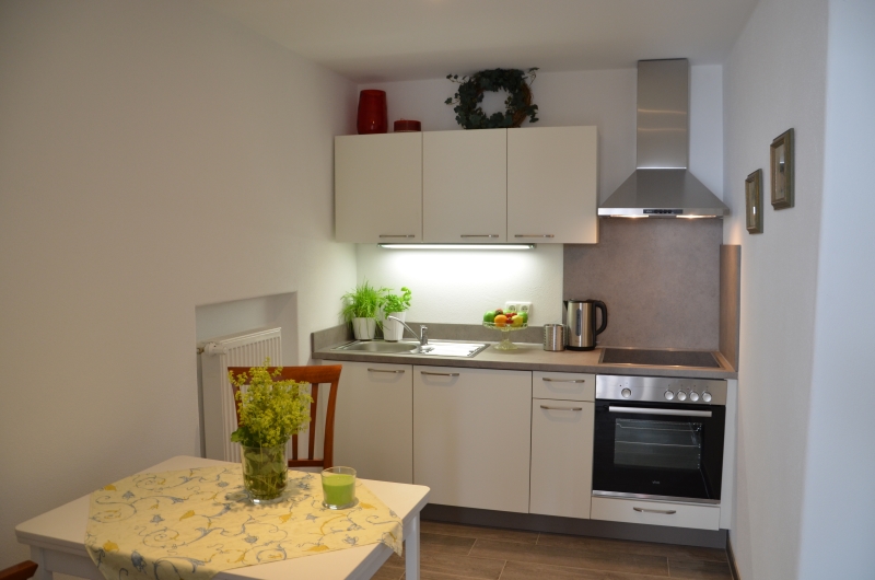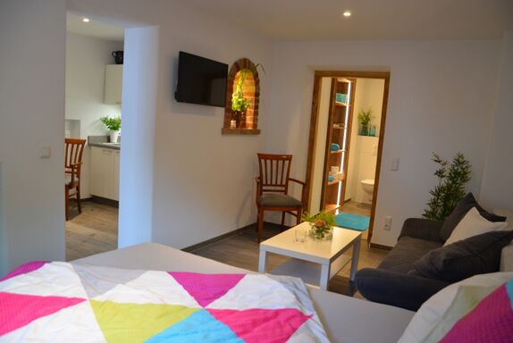 2016 neu fertiggestellte Ferienwohnung. Im kombinierten Wohn- und Schlafraum befindet sich ein Boxspring-Doppelbett, eine ausziehbare Schlafcouch, Essecke, SAT-TV und W-LAN. Eine separate Küche ist mit Küchenutensilien, Kaffeemaschine, Wasserkocher, Kühlschrank sowie Kochherd mit Backofen eingerichtet. Das Badezimmer hat eine begehbare Dusche und ist mit Hand-/Badetüchern sowie mit Fön und Toilettenartikeln versehen. Keine Tiere, Nichtraucher. Kostenlose Unterstellmöglichkeit in abschließbarer Garage für Fahrräder, Bikes od. andere Sportgeräte.Separater Garten mit überdachten Freisitz.