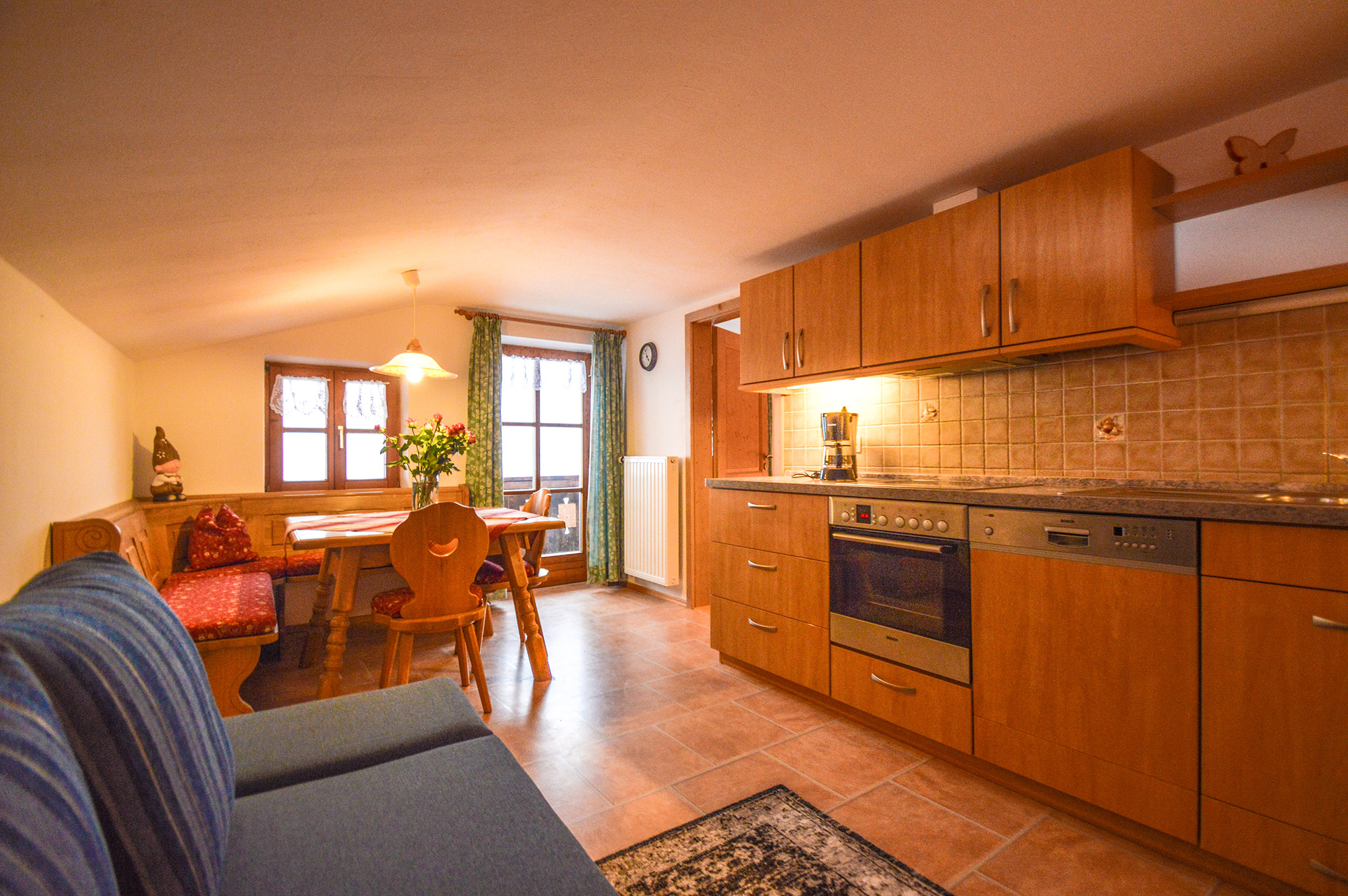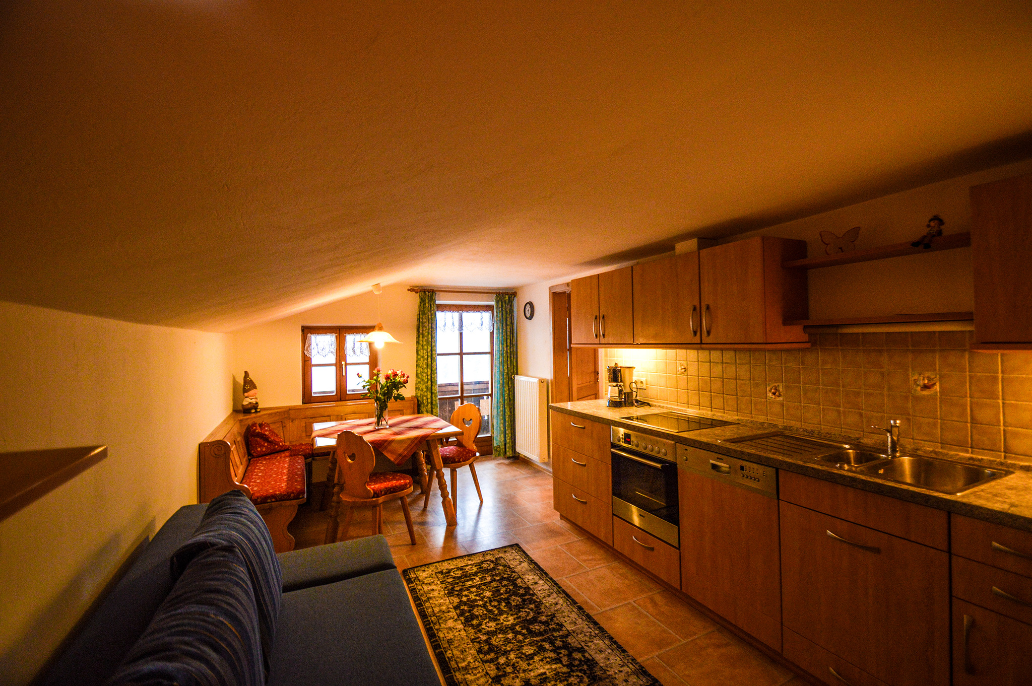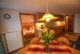 Unsere neu renovierte Ferienwohnung befindet sich in sonniger ruhiger Lage; vom Südbalkon aus haben Sie einen herrlichen Blick auf das gesamte Bergmassiv. Die Wohnung ist im Landhausstil eingerichtet, verfügt über eine Wohnküche mit großzügiger Küchenzeile, Sitzecke und Schlafcouch (für einen Erwachsenen oder zwei Kinder), Flur sowie ein separates Schlafzimmer. Es handelt es sich um eine Nichtraucher-Wohnung; deshalb bitten wir unsere Gäste, ihre Zigarette auf dem Balkon zu genießen.