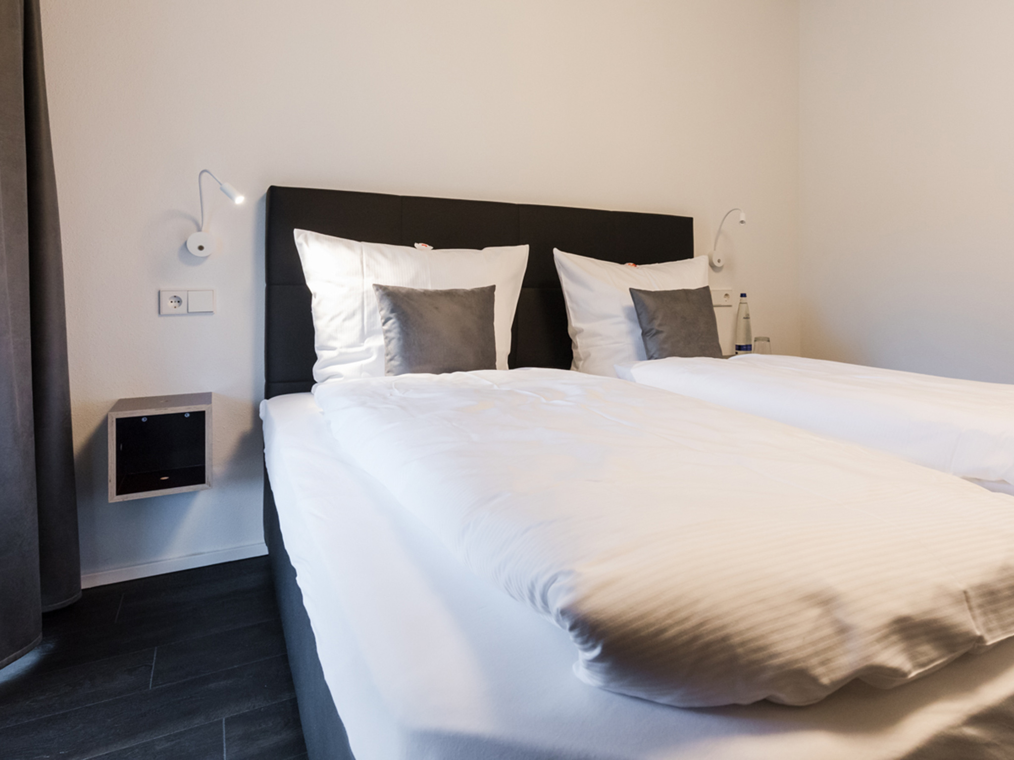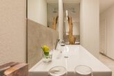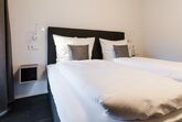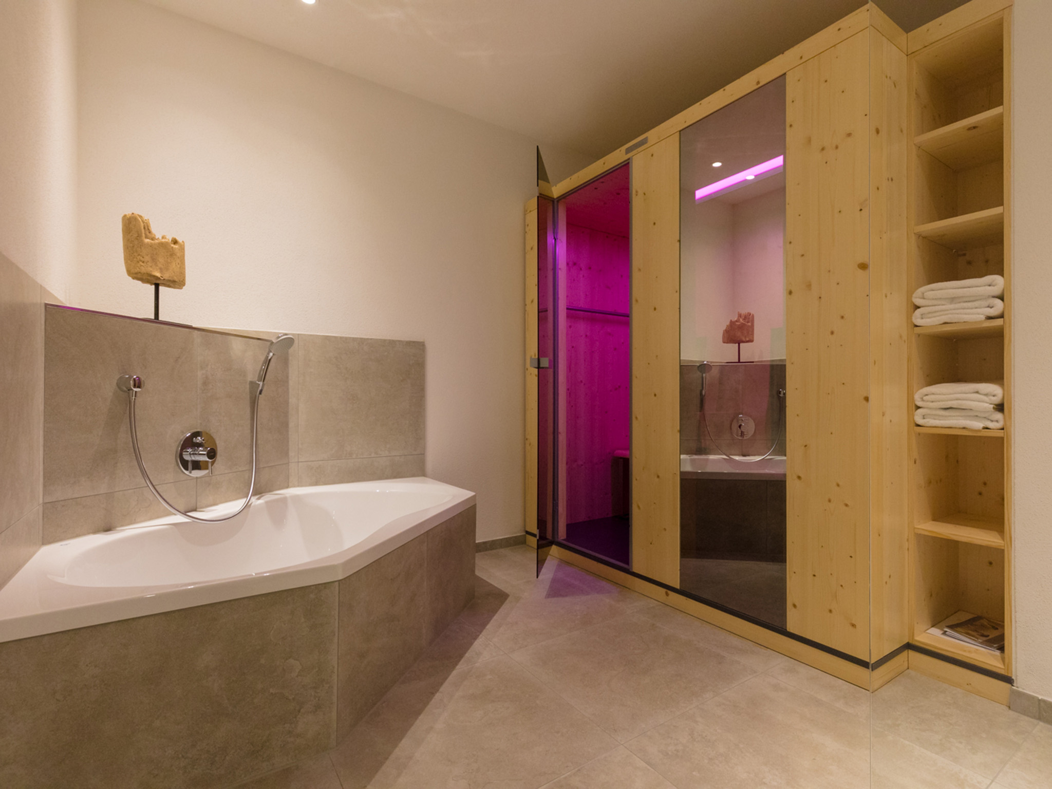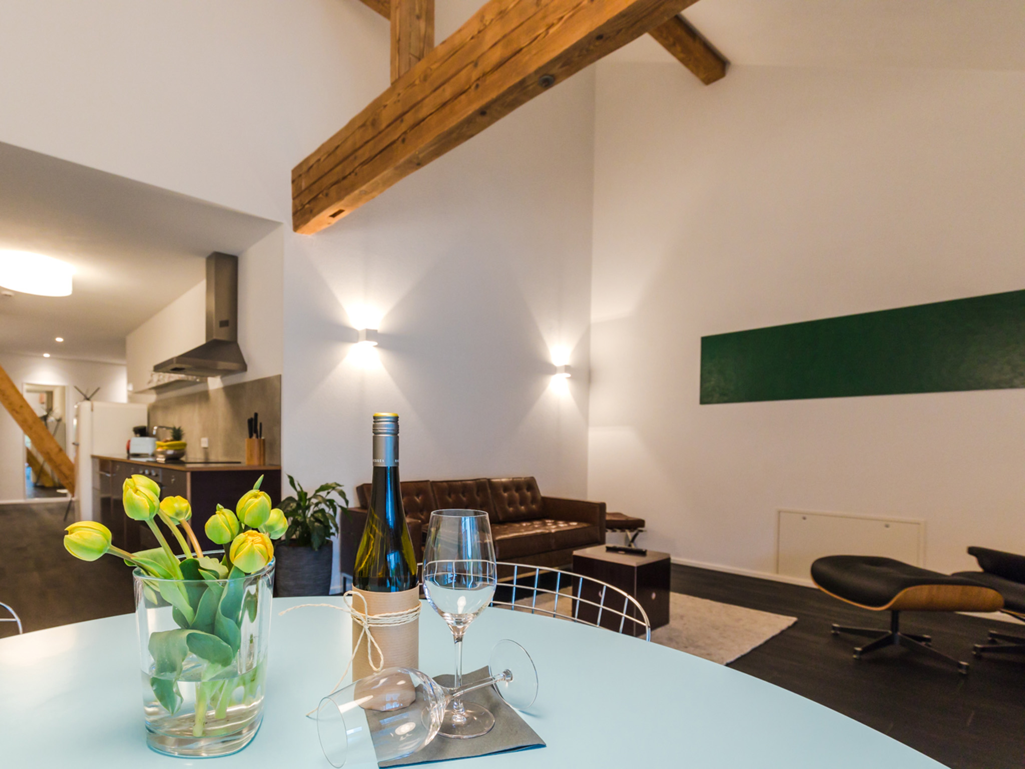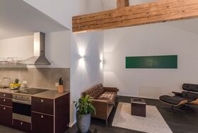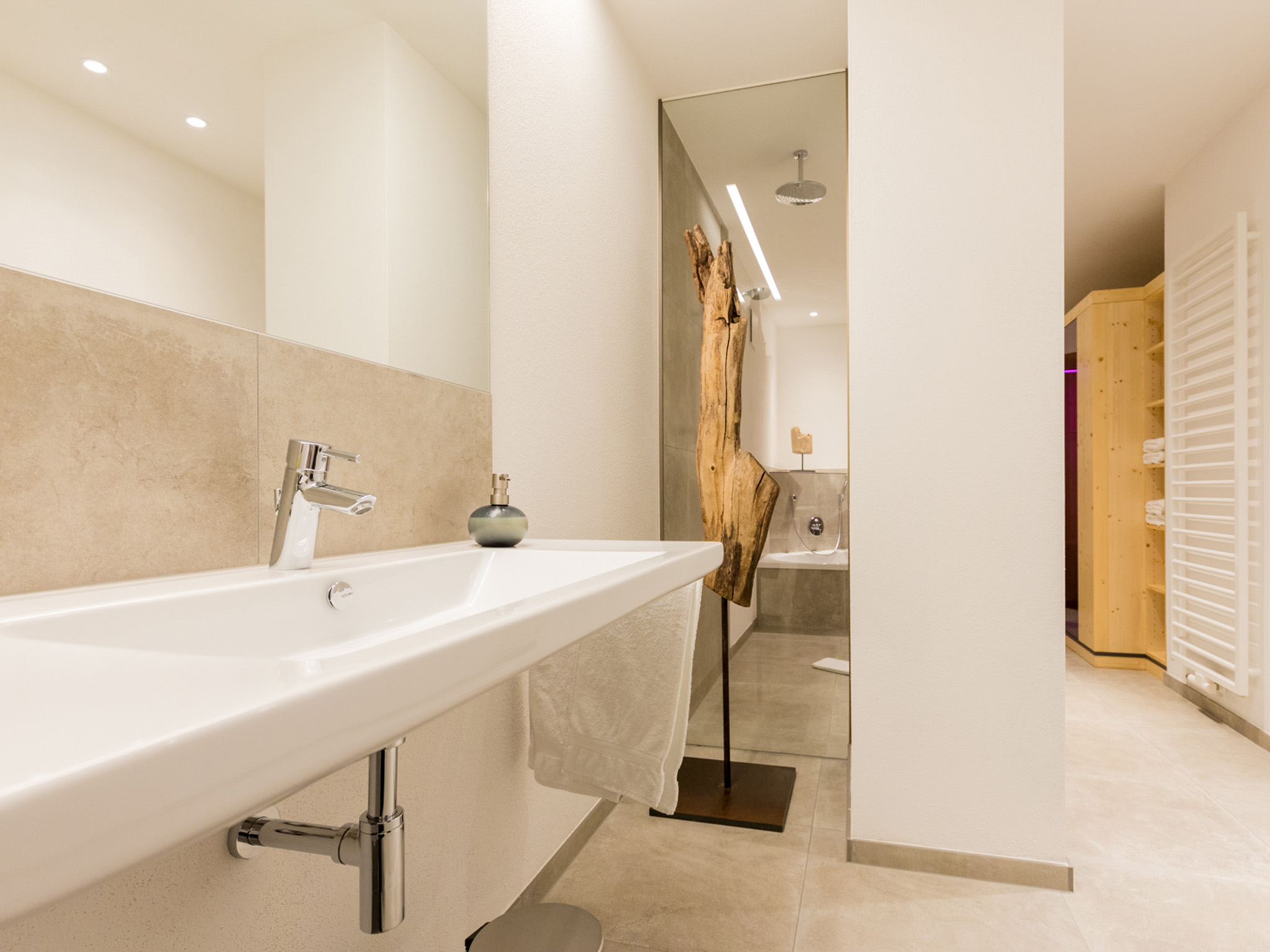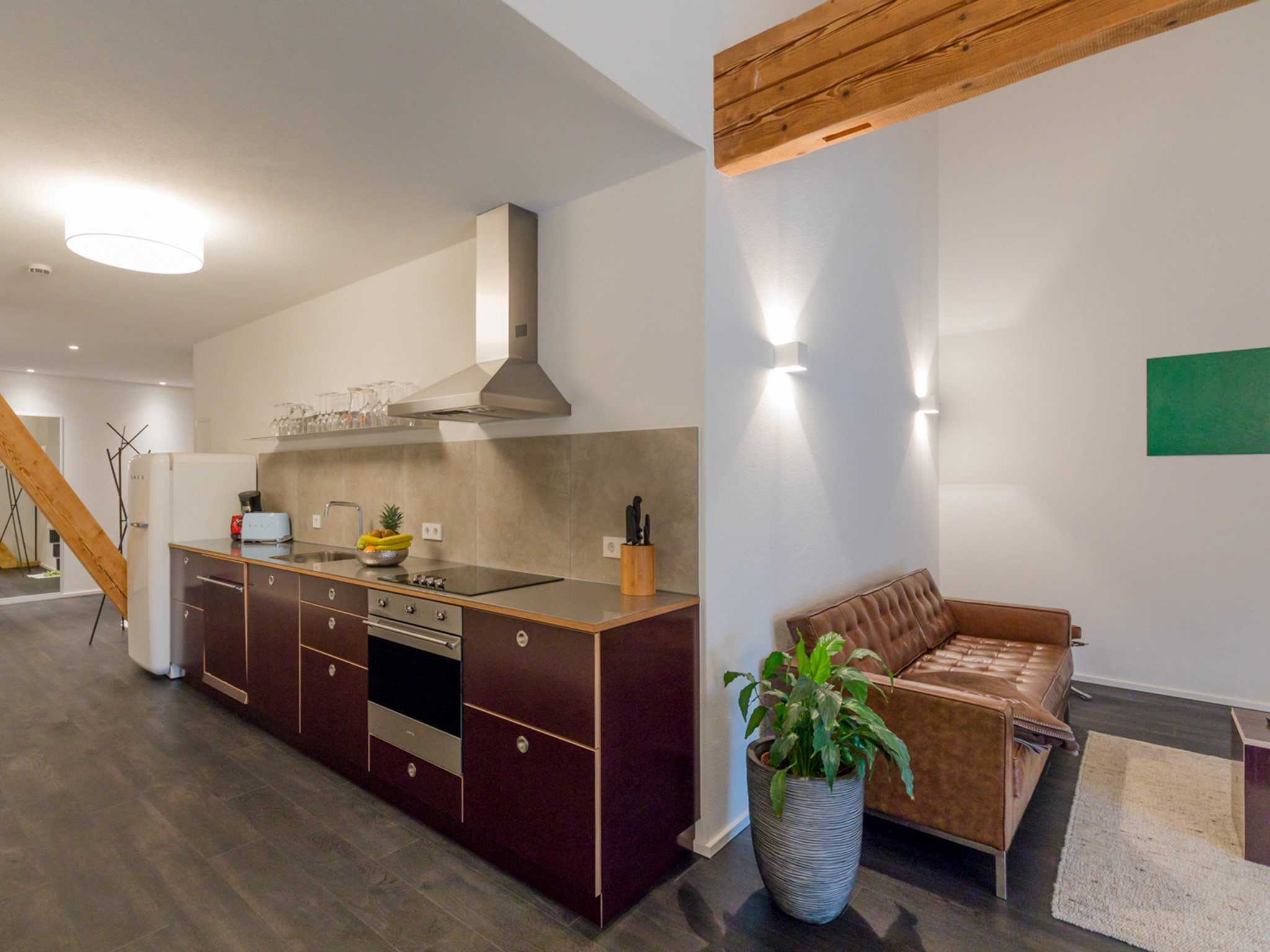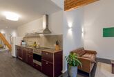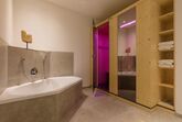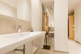 Apartment für 4 Personen mit zwei Schlafzimmern, einem Badezimmer mit Infrarotkabine, einem zusätzlichen WC und Balkon. Lichtdurchflutetes Wohnzimmer mit 7 m Raumhöhe, moderner und hochwertiger Einrichtung mit Designermöbeln und voll ausgestatteter Küchenzeile. Jedes Apartment verfügt außerdem über eine eigene Autogarage.