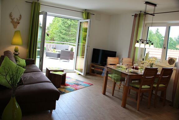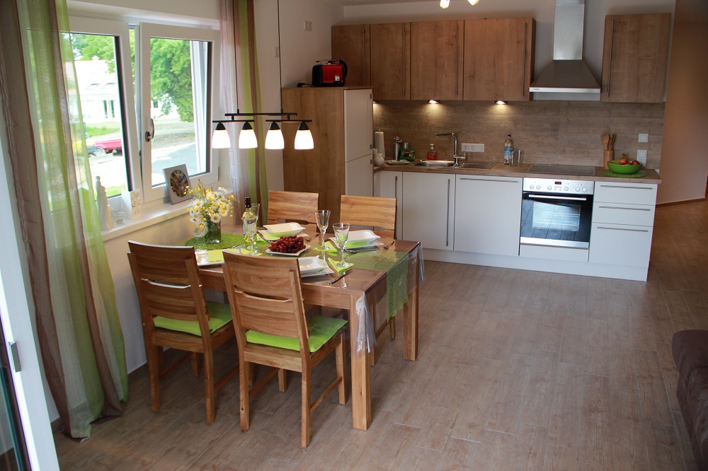 Ein geräumiger Wohnraum bietet Wohlfühlambiente mit voll ausgestatteter Küche inkl.Kühl.-/Gefrierkombination, Geschirrspüler, Senseo Kaffeemaschine, Wasserkocher, Toaster und moderner Herd/Backofenkombination um sich kulinarisch zu verwöhnen, der Essbereich wurde mit Echtholzmöbel ausgestattet und ein Flatscreenfernseher ist selbstverständlich vorhanden. WLAN ist kostenfrei nutzbar.