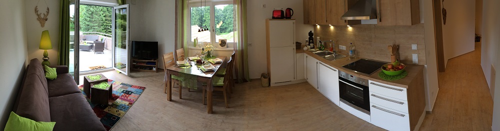 Ein geräumiger Wohnraum im Wohlfühlambiente mit voll ausgestatteter Küche inkl. Kühl.-/Gefrierkombination, Geschirrspüler um sich kulinarisch zu verwöhnen, Essbereich mit Echtholzmöbel, sowie einer Schlafcouch und Flatscreenfernseher zum Entspannen.