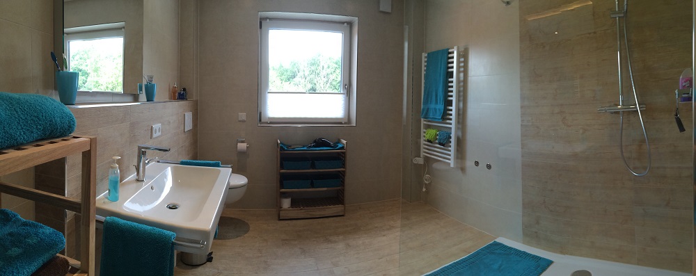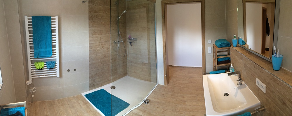 Das große Badezimmer wurde mit einer extragroßen, barrierefreien Dusche ausgestattet, Handtuchwärmer und großem Waschbecken mit beleuchtetem Spiegel. Ein Abstellraum verfügt über eine Waschmaschine, Wäschegestell, Staubsauger und Stauregale.