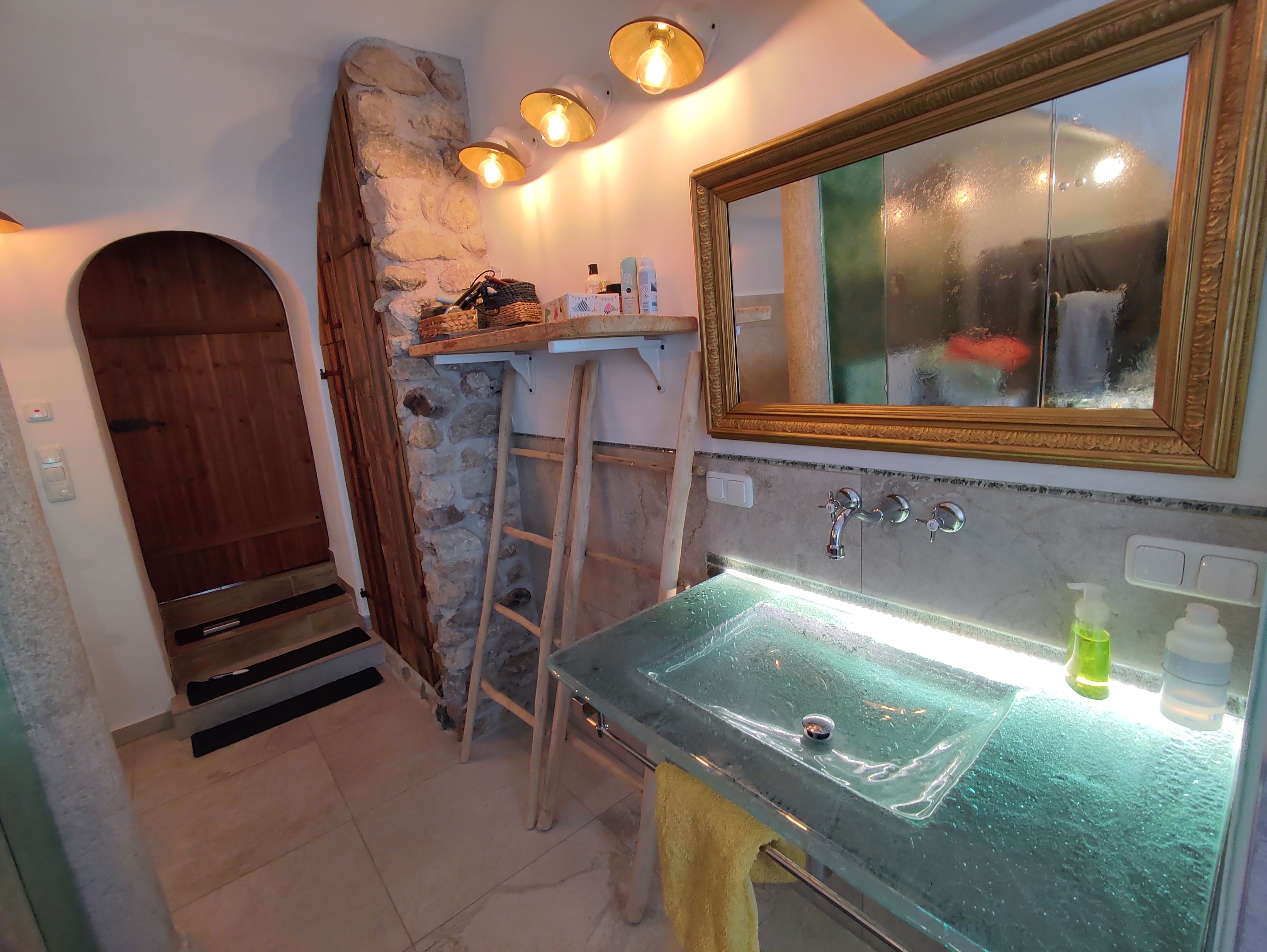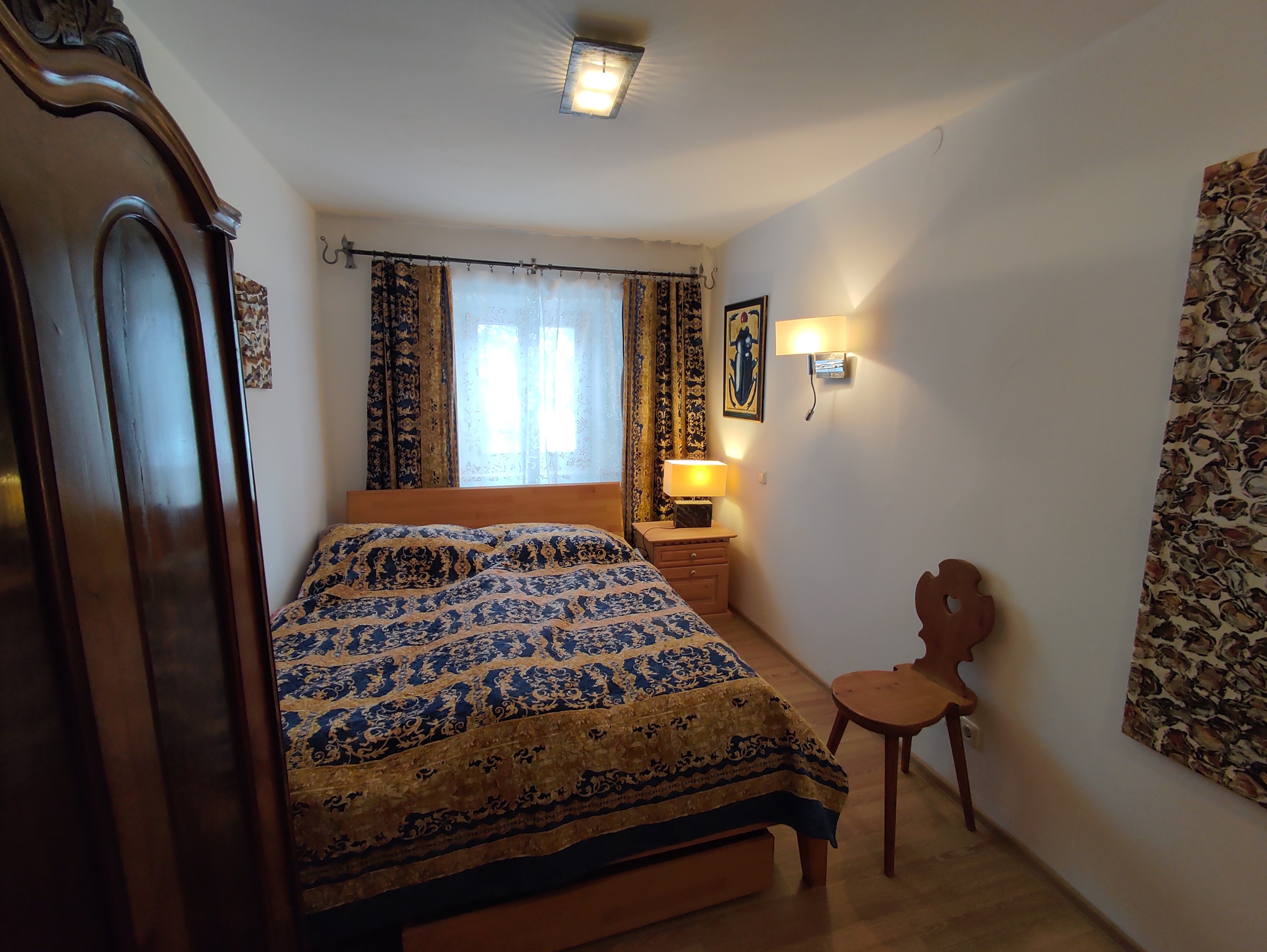 Das kleine freundliche Ferienzimmer Enzian mit Bergblick befindet sich im Obergeschoss und ist für Kurzzeitaufenthalte und Wanderer bestens geeignet. Die große gemeinschaftliche gut ausgestattete Küche und das neue, große aufwendig eingerichtete gemeinschaftliche Bad in einem mittelalterlichen Gewölbe befinden sich im Erdgeschoß.