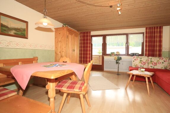 Unsere schöne, große Ferienwohnung befindet sich im Nebenhaus und ist gemütlich im ländlichen Stil eingerichtet. Die Wohnung hat 2 Doppelzimmer und 1 Einzelzimmer und einen großen Südbalkon auf dem Sie sich ideal entspannen können. Die Wohnung ist perfekt geeignet für Familien mit Kindern. Nach einem erlebnisreichen Urlaubstag sorgen eine sonnigen Liegewiese mit Liegestühlen oder unsere Sauna mit Solarium für Wohlbefinden und Entspannung. Für unsere ganz kleinen Gäste stellen wir kostenlos unsere Kinderausstattung zur Verfügung (Kinderbett, Hochstuhl, Wickelauflage, Hocker, Kindertrage etc.).