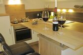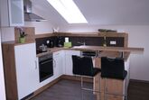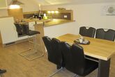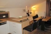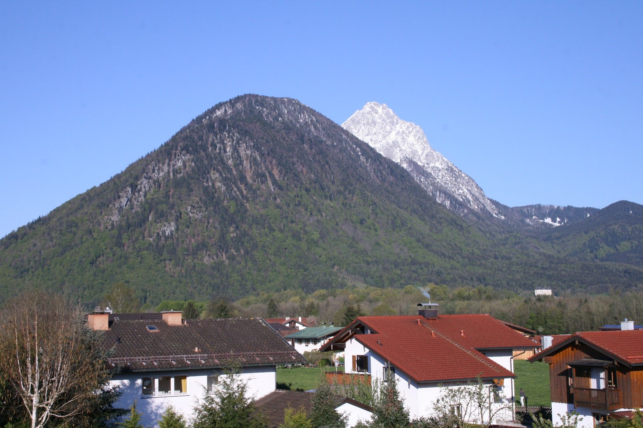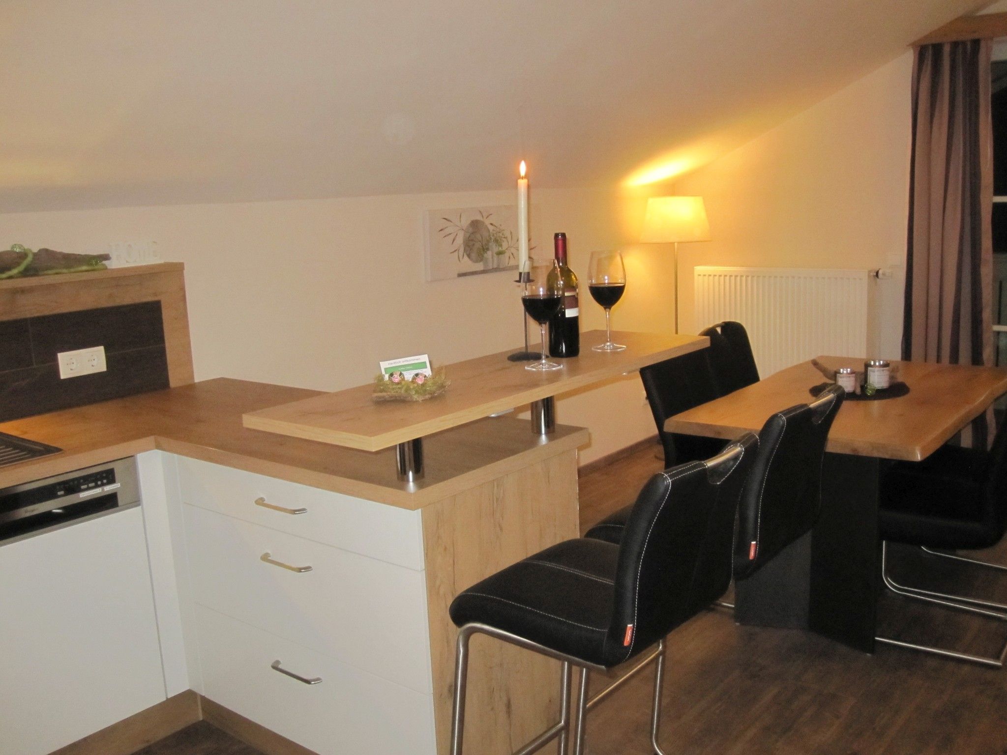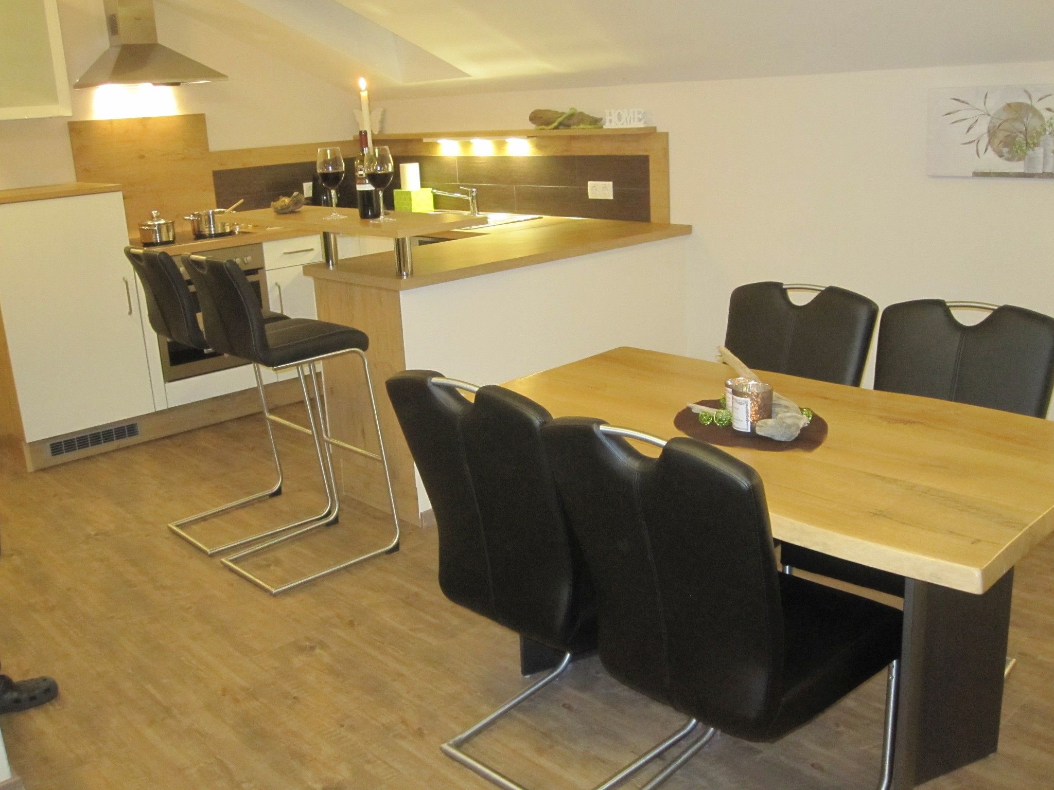 2-Zimmer Ferienwohnung im Dachgeschoss mit Balkon und herrlicher Aussicht auf den Untersberg. Wohnzimmer mit Couch und Massivholz-Esstisch. Moderne, offene Küche mit Bartresen und Barhocker, Geschirrspüler, E-Herd mit Ceranfeld, Backrohr und Dunstabzug, Pad-Kaffeemaschine, Wasserkocher, Toaster, Kühlschrank mit Gefrierfach, Flat-TV, Bad mit Handtuchheizkörper und Regenbrause.