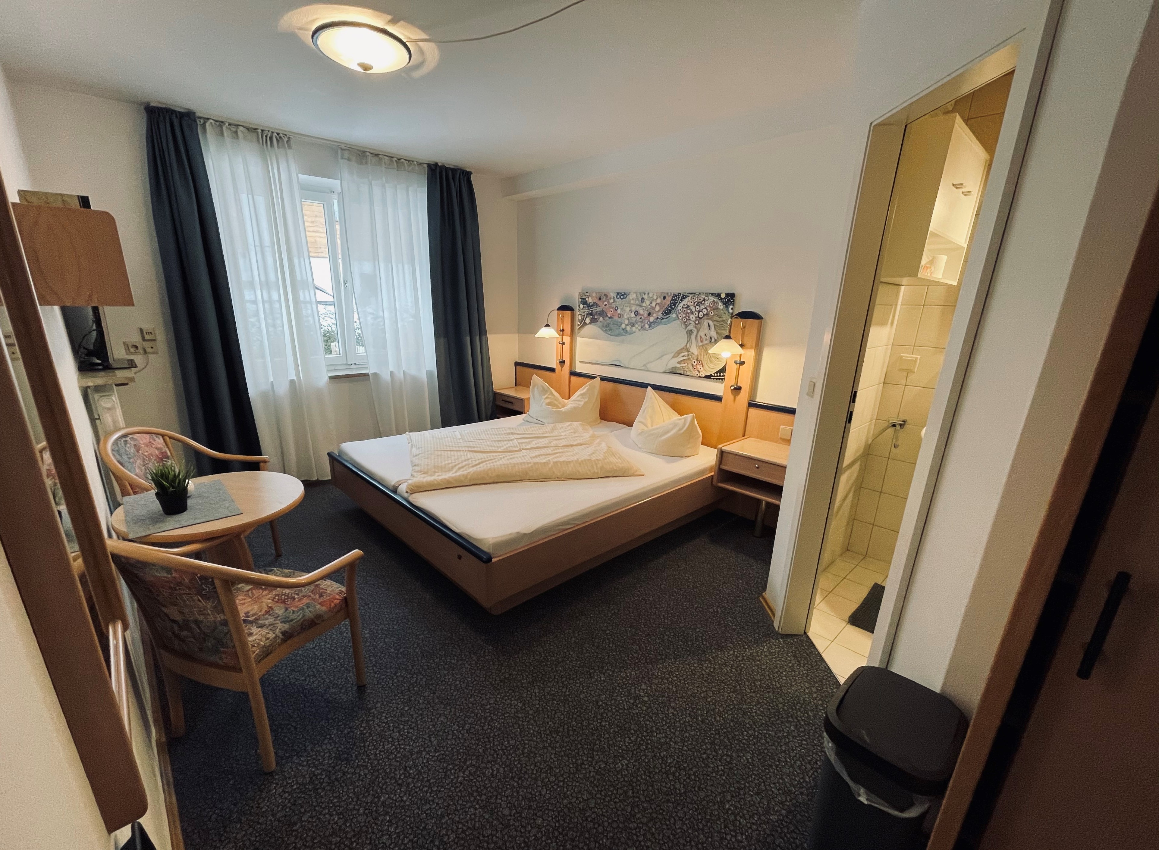 Dieses helle Nichtraucher-Doppelzimmer liegt im Erdgeschoß und verfügt über ein Doppelbett, eine gemütliche Sitzecke mit Sitzgruppe, Radio, TV, WLAN und Safe sowie ein Bad mit Dusche/WC und Fön. Auf der möblierten Gemeinschaftsterrasse genießen Sie einen wunderbaren Ausblick auf die Bergwelt. Ein Babybett kann gesellt werden.