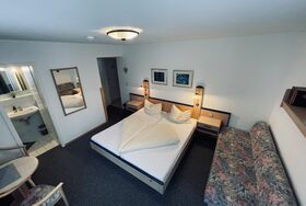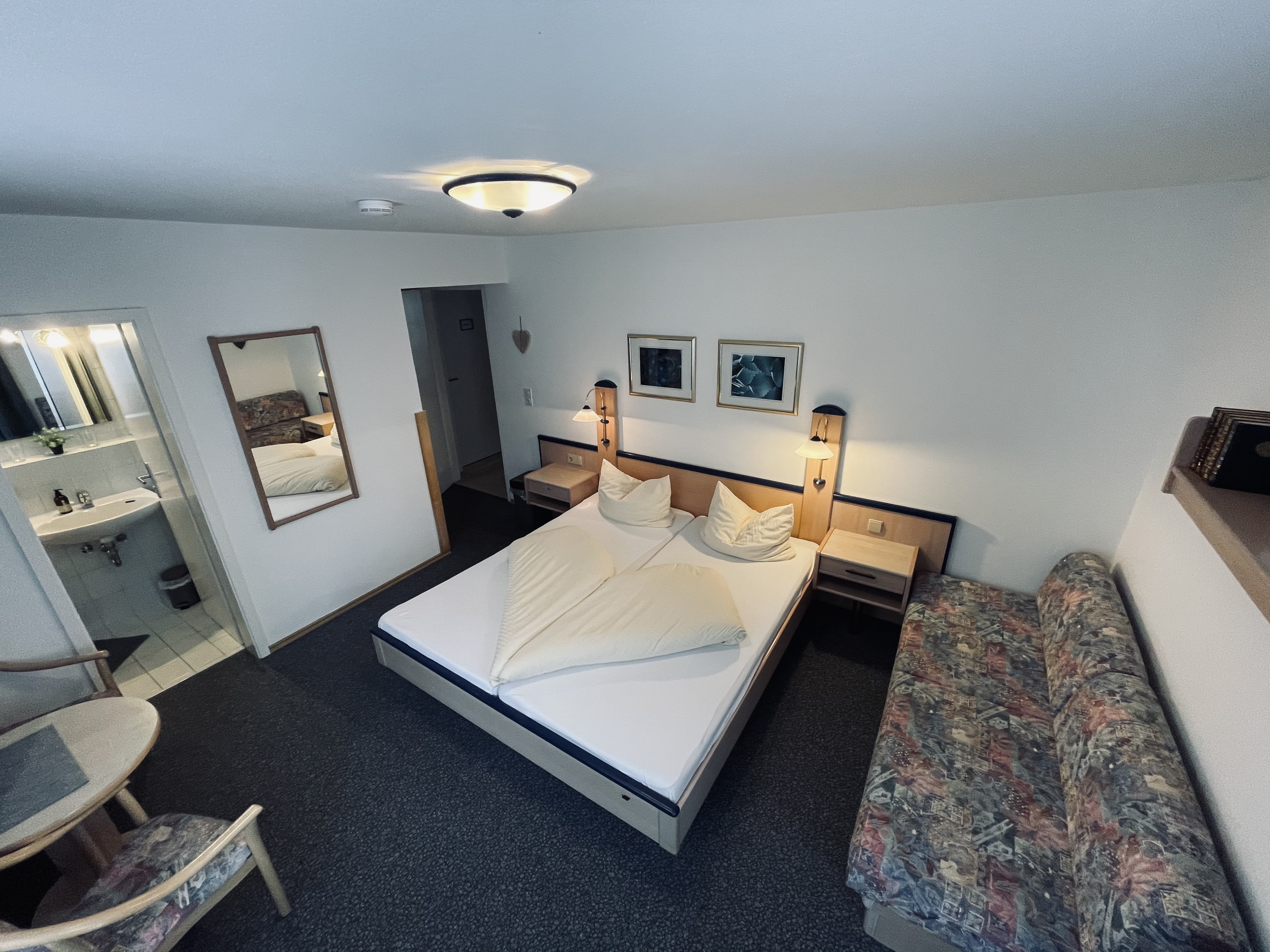 Dieses helle Nichtraucher-Doppel/Dreibettzimmer liegt im Erdgeschoß und ist ausgestattet mit einem Doppelbett, einem zusätzlichen Schlafsofa, einer kleinen Sitzgruppe, Radio, TV, WLAN und Safe, ein Bad mit Dusche/WC und Fön. Die möblierte Gemeinschaftsterrasse bietet einen tollen Blick auf die umliegenden Berge. Ein Babybett kann gesellt werden.